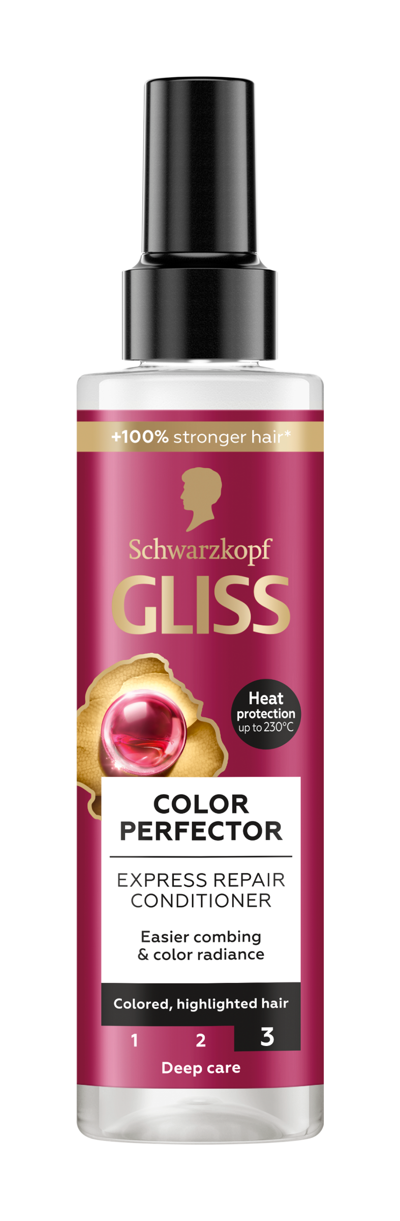 - Expresní obnovující kondicionér Gliss Color Perfector s hyaluronovou směsí + brusinkovým extraktem pro barvené a melírované vlasy. Snazší rozčesávání a zářivost barvy. Hloubková obnova vlasů a ochrana barvy až na 13 týdnů a dlouhotrvající zářivost barvy**. **v kombinaci se šamponem Color Perfector.