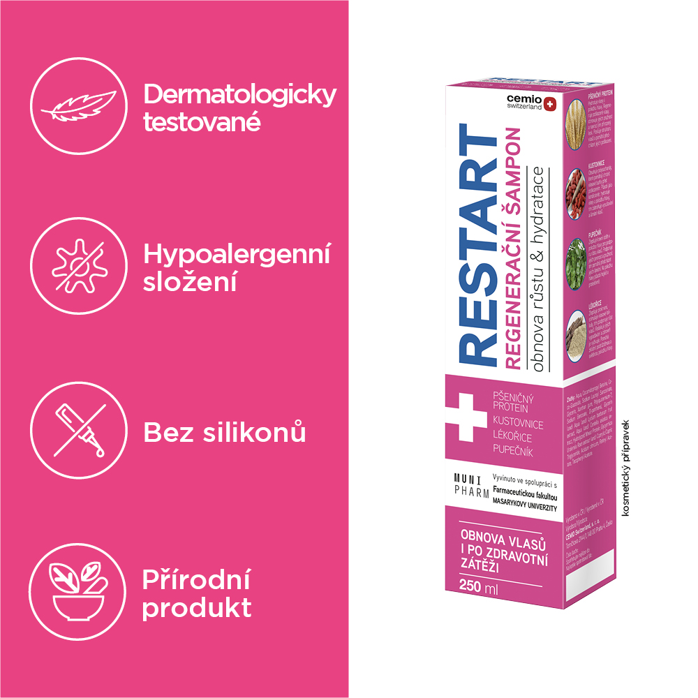 Regenerační šampon určen pro každého, kdo potřebuje mimořádně šetrnou, ale účinnou péči při nadměrném padání vlasů nebo citlivé vlasové pokožce. Jeho unikátní složení pomáhá obnovit rovnováhu pokožky hlavy a podporuje zdravý růst vlasů, a to i v případě zvýšené zdravotní zátěže spojené s narušením vlasového cyklu jako je například období hormonálních změn, nadměrný stres či onkologická léčba. Mimořádně šetrná, regenerační péče o vlasy a vlasovou pokožku vyvinutá ve spolupráci s Farmaceutickou fakultou Masarykovy univerzity.