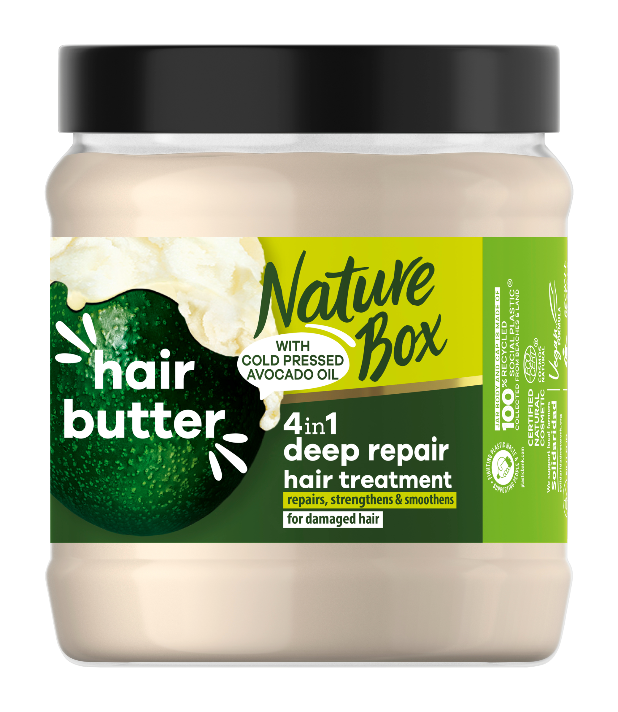 Nature Box 4v1 Hair Butter Avocado pro hloubkovou regeneraci vlasů představuje intenzivní péči pro zvláště poškozené a suché vlasy. Inovativní složení je obohaceno o za studena lisovaný avokádový olej a bambucké máslo, což je „super péče“ pro vyživené a zdravě vypadající vlasy. Tato avokádová vlasová kúra obsahuje 99 % ingrediencí přírodního původu*** a je certifikována Ecocert Greenlife podle standardu COSMOS.