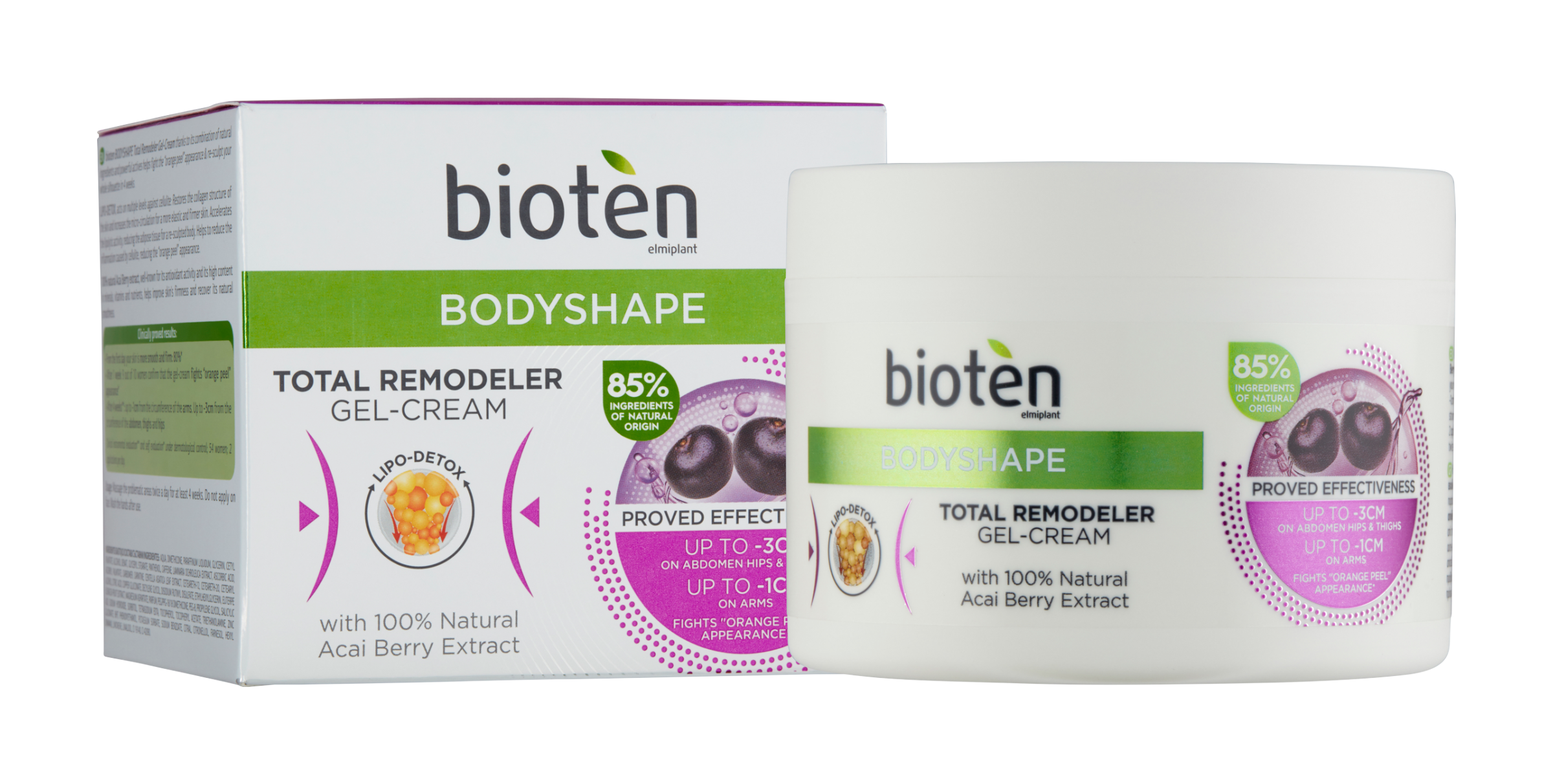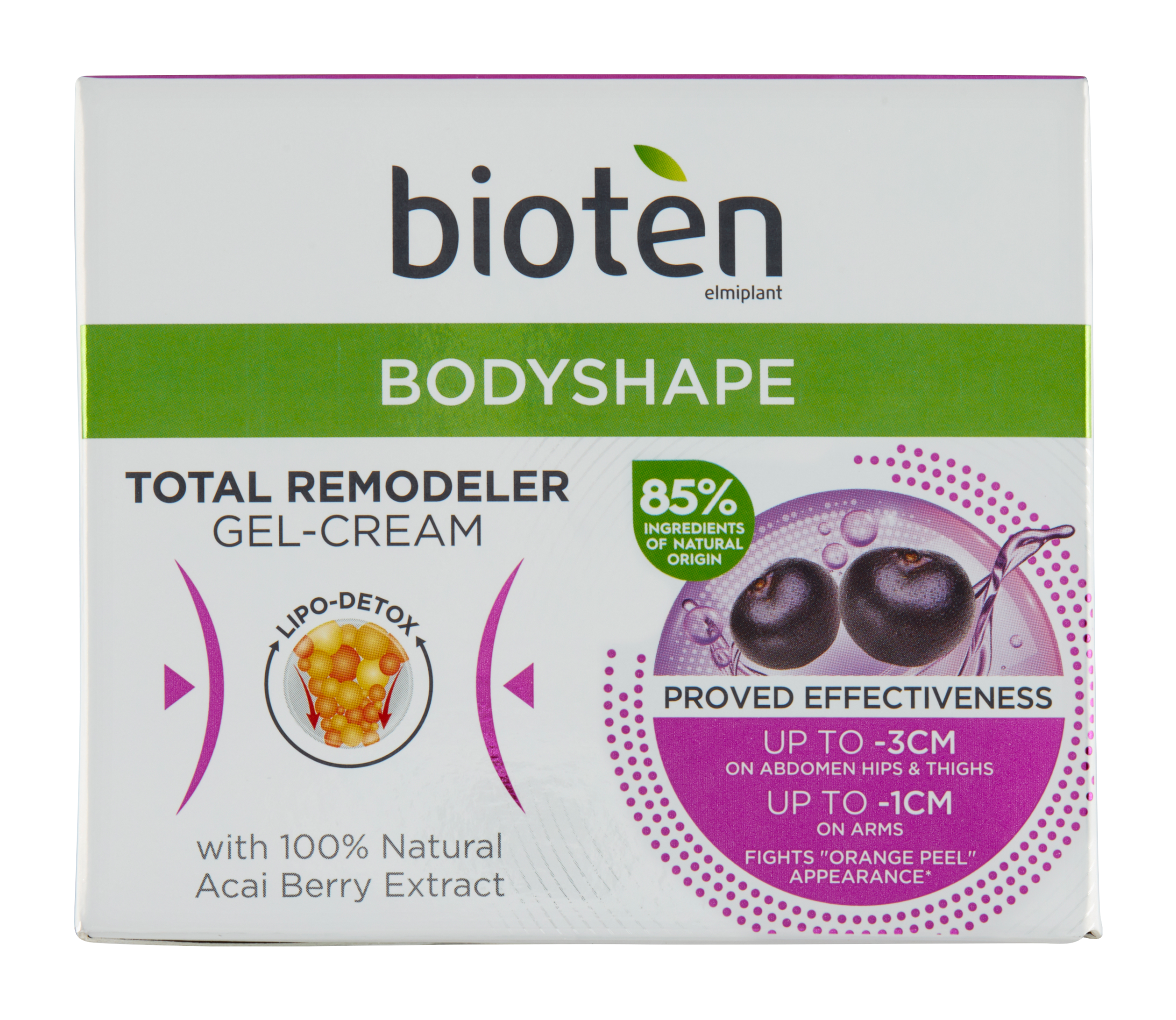 Bioten Bodyshape remodelační gelový krém díky své kombinaci přírodních surovin a silných aktivních látek pomáhá v boji proti výskytu „pomerančové kůže“ a vylepší celou vaši siluetu za 4 týdny. Lipo-Detox působí proti celulitidě na mnoha úrovních. Obnovuje kolagenovou strukturu kůže a zvyšuje mikrocirkulaci pro elastičtější a pevnější pokožku. Urychluje lipolitickou aktivitu a redukuje tukovou tkáň pro vylepšení kontur těla. Pomáhá redukovat záněty způsobené celulitidou, omezuje výskyt „pomerančové kůže“. 100% přírodní výtažek z plodů acai, známých díky svým antioxidačním účinkům a vysokému obsahu minerálů, vitamínů a živin, pomáhá zlepšit pevnost pokožky a obnovit její přirozenou hladkost.