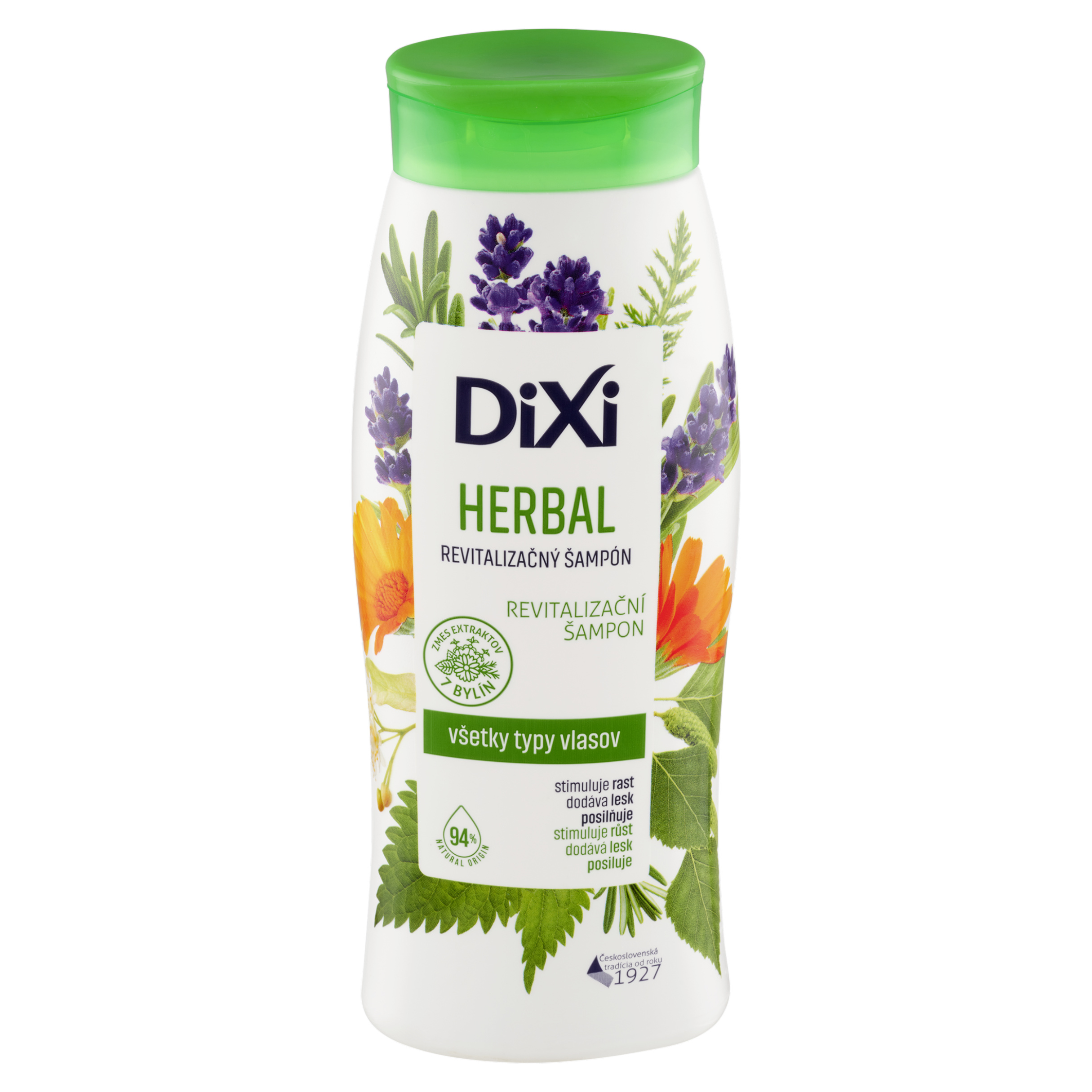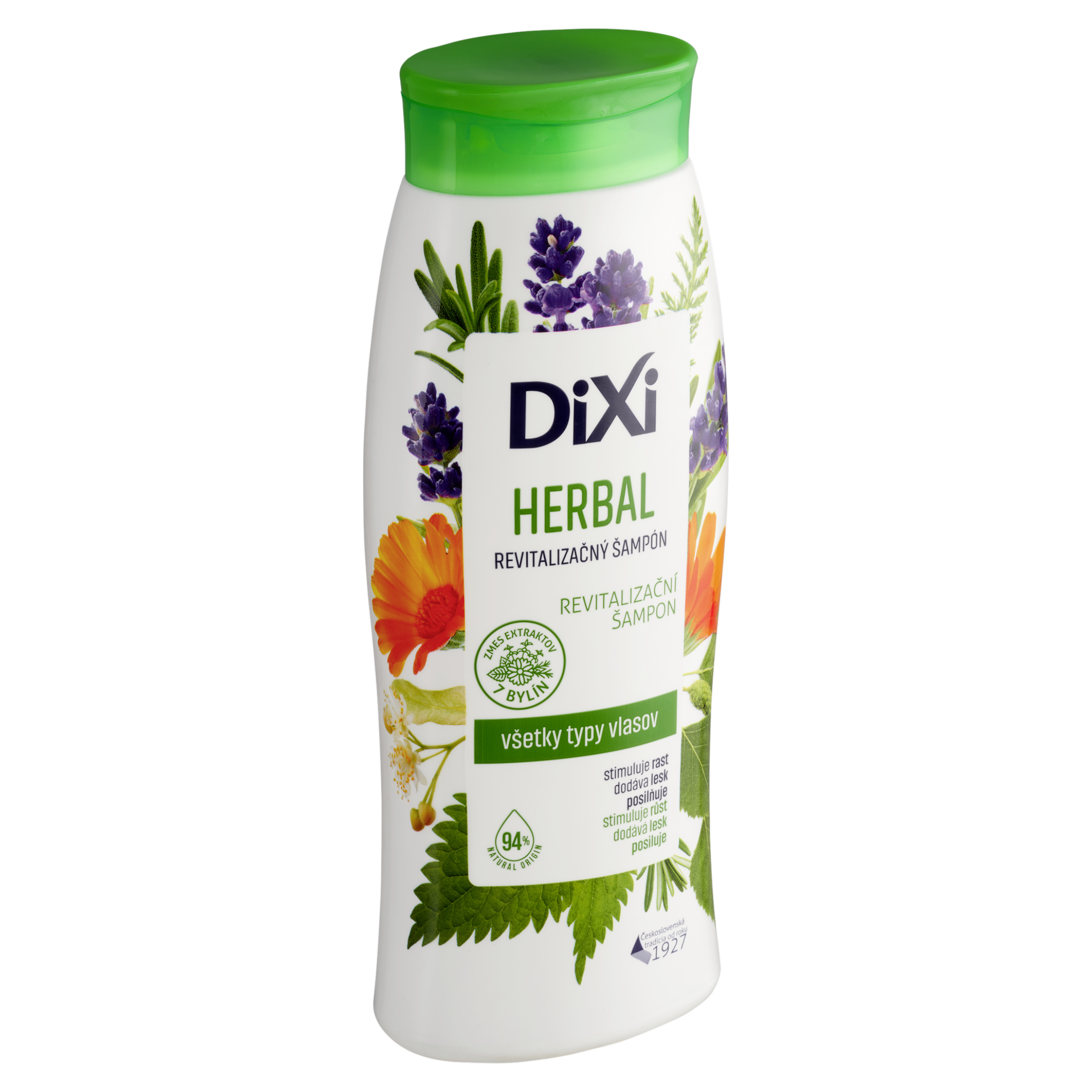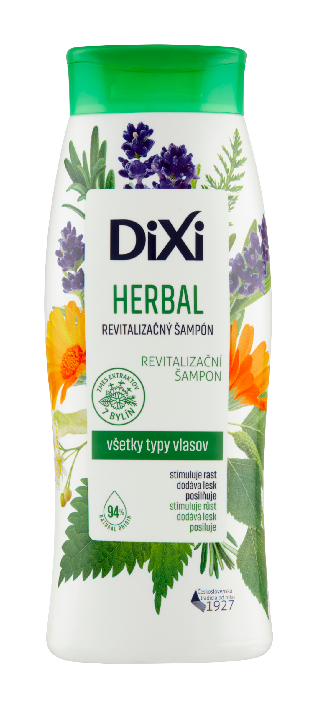 Dixi Herbal revitalizační šampon s obsahem extraktů ze 7 bylin (bříza bělokorá, kopřiva dvoudomá, měsíček lékařský, rozmarýn lékařský, levandule úzkolistá, lípa malolistá, řebříček obecný) je určen pro všechny typy vlasů. Šetrně myje a pomáhá udržovat jejich zdravý vzhled. Obsahuje 94% složek přírodního původu.
