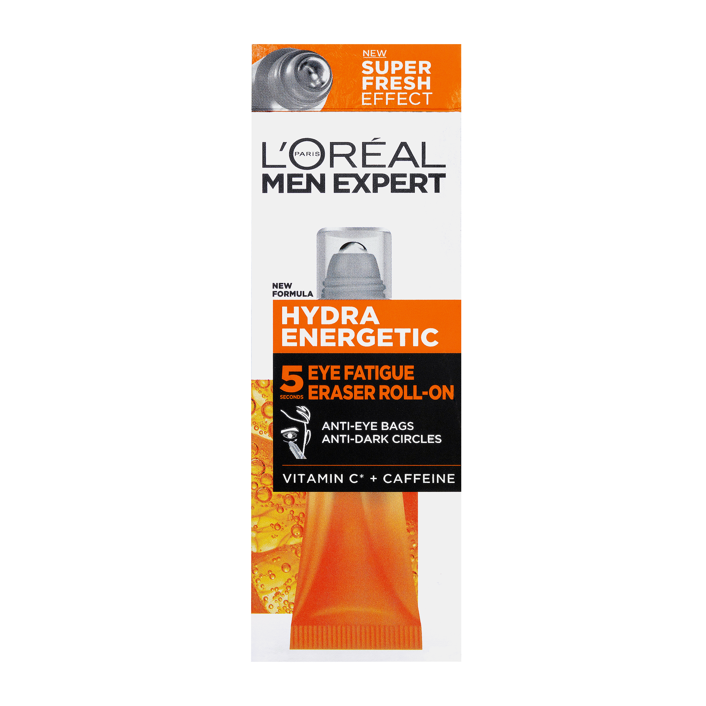L'Oréal Hydra Energetic roll-on oční krém pro muže obohacený o vitamin C a kofein. Vitamin C je známý svými energizujícími vlastnostmi, pomáhá rozjasnit oční okolí. Kofein je známý svými povzbuzujícími a antioxidačními účinky. Přispívá ke snížení známek únavy, jako jsou tmavé kruhy pod očima.