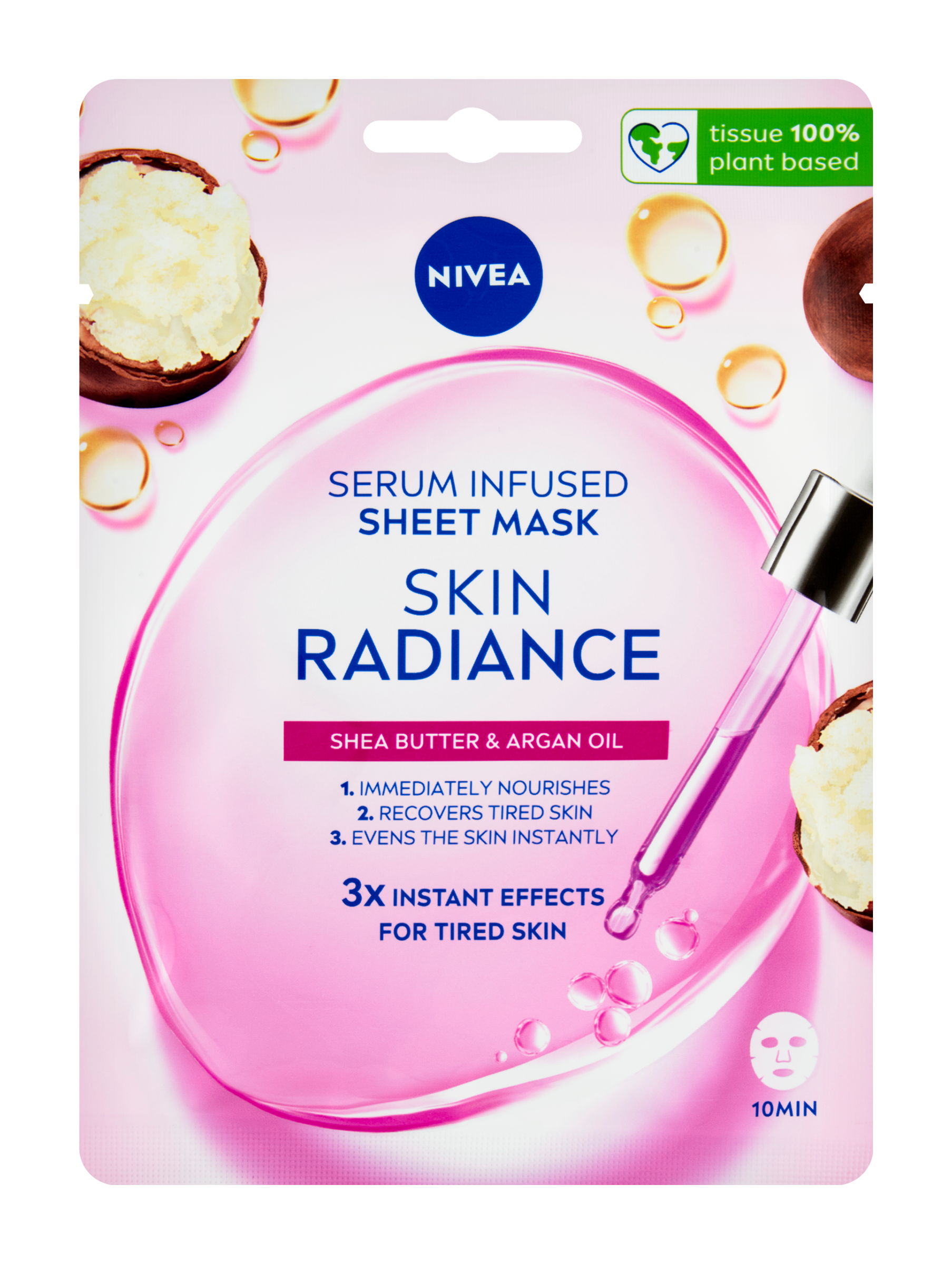 Nivea® Rozjasňující textilní maska s účinným sérem obsahuje bambucké máslo a arganový olej pro okamžitou výživu a zjemnění pleti. Už za 10 minut dodá pleti zdravý, svěží a přirozeně zářivý vzhled. Maska je ze 100% rostlinných vláken.