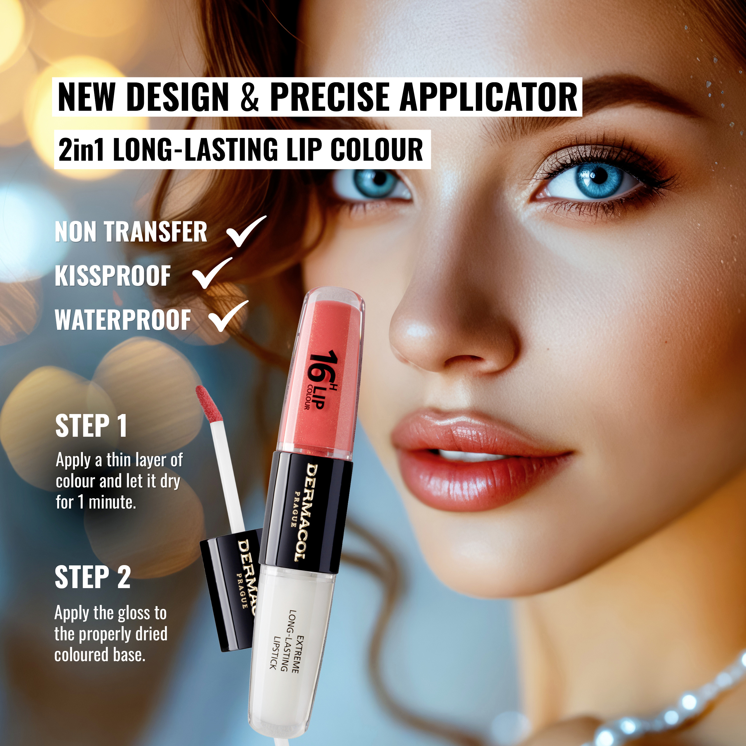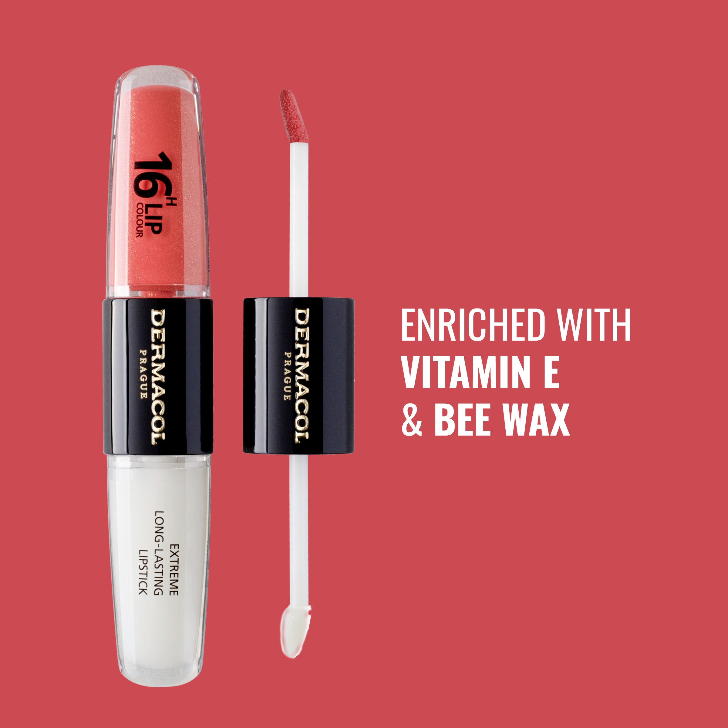 Nádherná, intenzivní a plně krycí rtěnka s leskem 2v1 od Dermacolu zajistí bezchybný vzhled vašich rtů po celý den! Tato tekutá dlouhotrvající rtěnka spojuje průlomovou texturu s vysokou pigmentací, rychle zasychá a poskytuje výjimečné krytí. Její krémová konzistence dokonale přilne ke rtům a vydrží až 16 hodin. Díky obsahu přírodních, vysoce kvalitních olejů, včelího vosku a vitaminu E nejen zkrášluje, ale i intenzivně pečuje – zabraňuje vysušování, hydratuje, zjemňuje rty a dodává jim svůdný lesk a plnost. Spojení dlouhotrvající barvy a tekuté textury zajišťuje, že vaše rty budou vypadat perfektně po celý den.