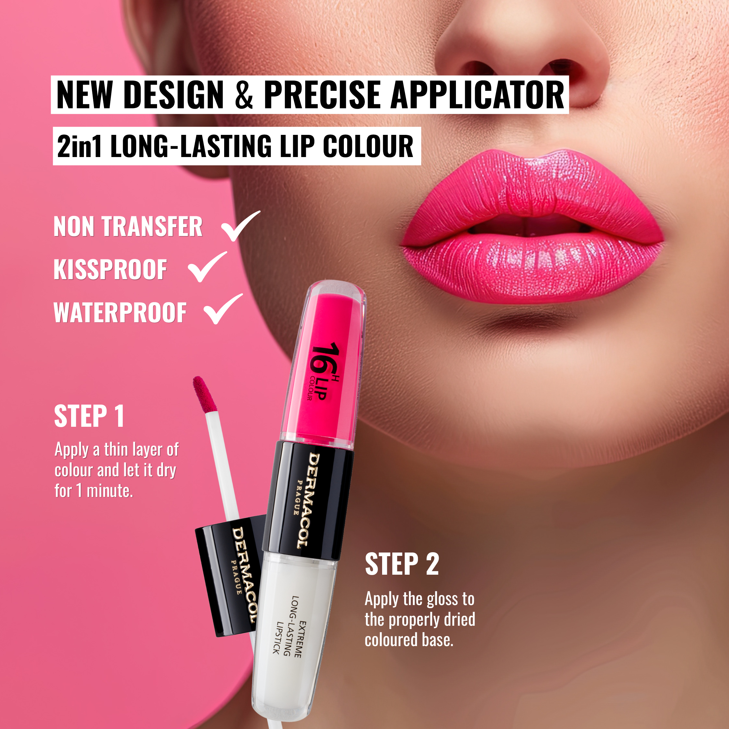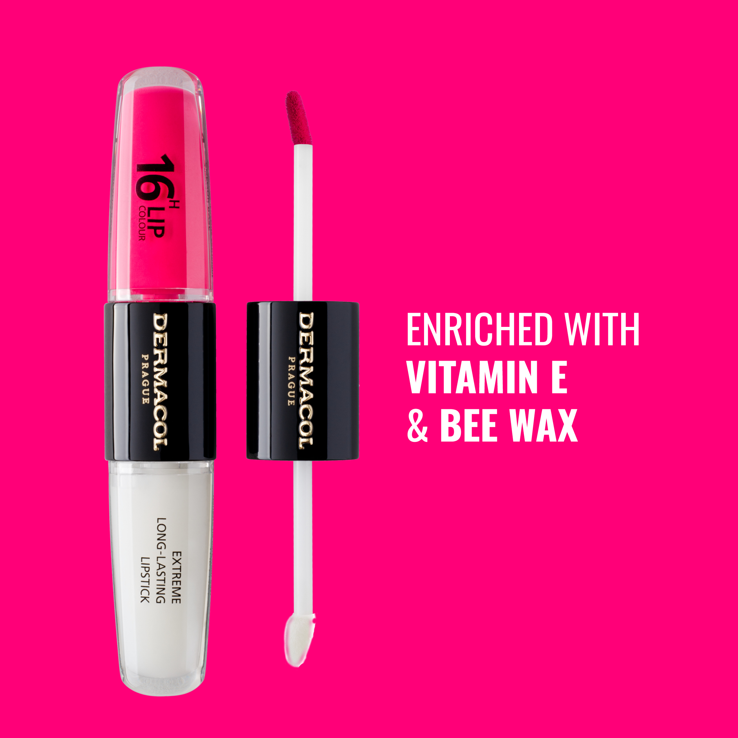 16H dlouhotrvající barva na rty a lesk 2 v 1. Nádherná intenzivní a krycí barva této tekuté dlouhotrvající rtěnky vytváří bezchybný vzhled rtů po celý den! Průlomová textura lesku na rty s vysokou pigmentací barvy na rty rychle zasychá a poskytuje vynikající krytí. Krémová textura dlouhotrvající rtěnky dokonale přilne ke rtům a vydrží až 16 hod. Ultra lesk & jemná péče v krémové fázi díky obsahu přírodních vysoce kvalitních olejů, včelího vosku a vitaminu E zabraňuje vysušování a hydratuje, zjemňuje rty, dodává jim svůdný lesk a plnost. Tato krémová rtěnka dodá vašim rtům bezchybný vzhled a dokonale o ně pečuje. Dlouhotrvající barva a tekutá textura složení zajišťují, že vydrží po celý den.