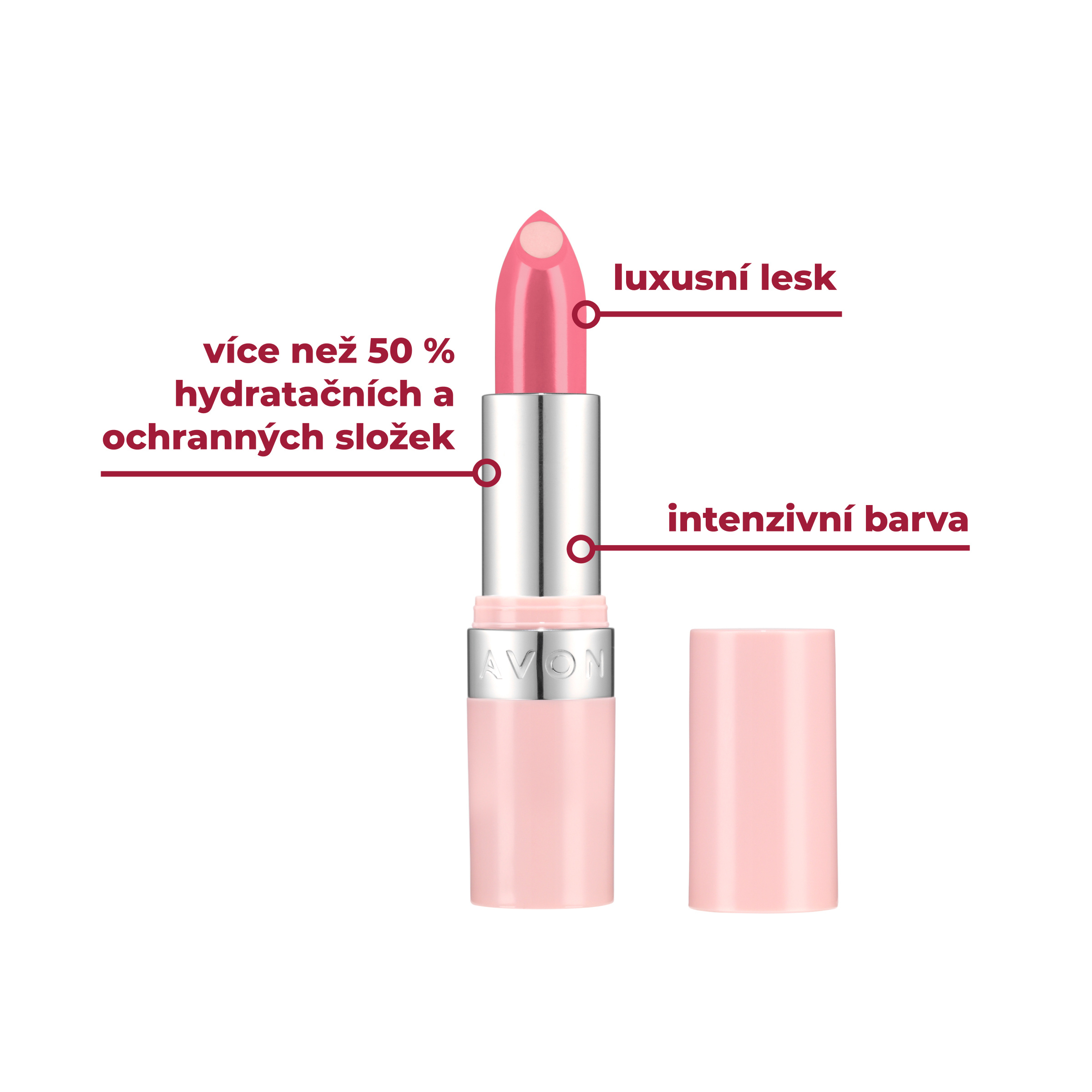Rtěnka s luxusním leskem, intenzivní barvou a více než 50 % hydratačních a ochranných složek, SPF 20.