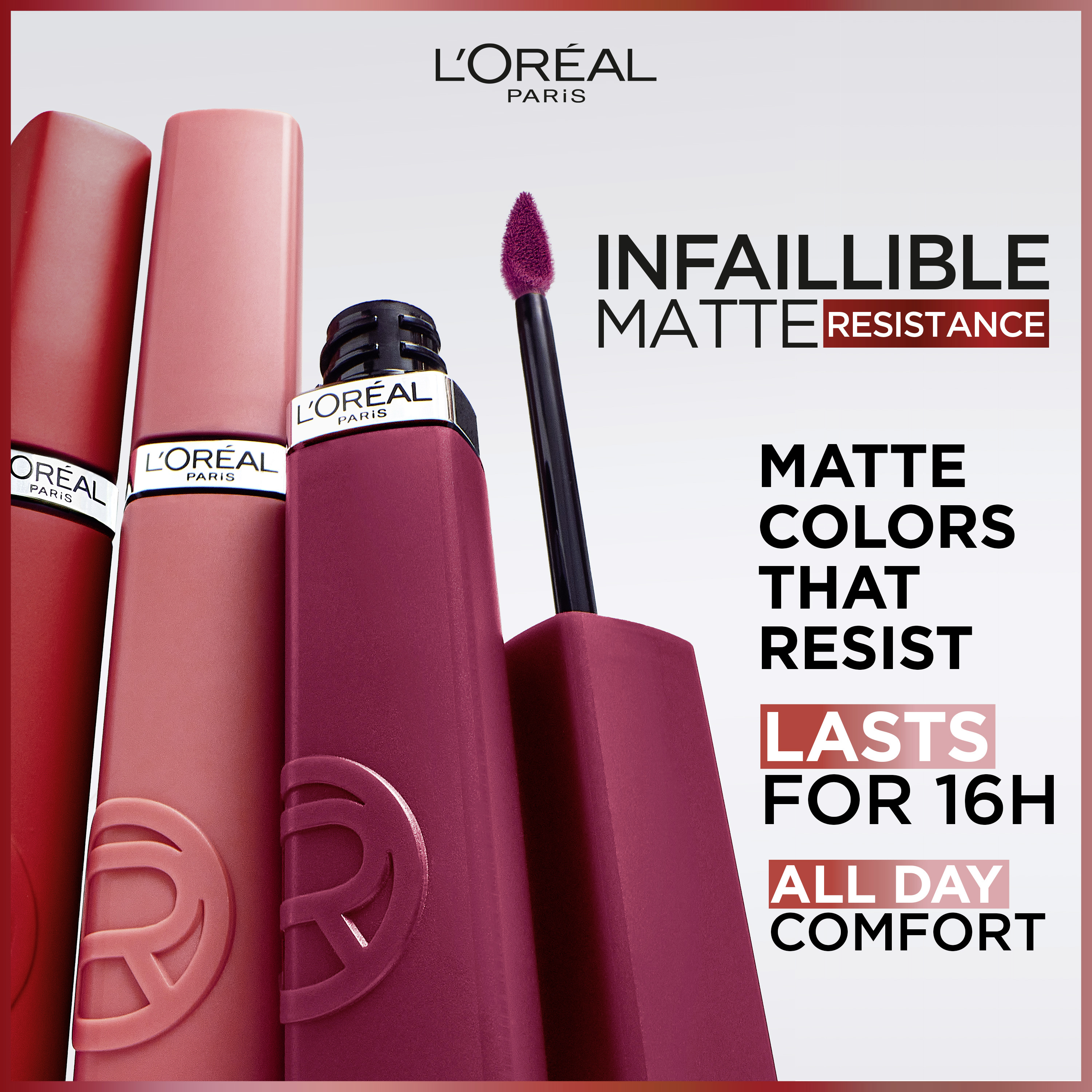 Infaillible Matte Resistance rtěnka od L'Oréal Paris představuje unikátní spojení ultra matného efektu s hydratací. Díky kyselině hyaluronové Vaše rty hydratuje, zatímco extra intenzivní pigmenty, které se po nanesení mění z tekutých na pudrové, garantují výrazný a dlouhotrvající vzhled. Intenzivní barva, která je už v první vrstvě vydrží až 16 hodin. Rtěnka se neobtiskává na masky, odolá dotekům, polibkům, nezanechává skvrny a jednoduše a pohodlně se nanáší.
