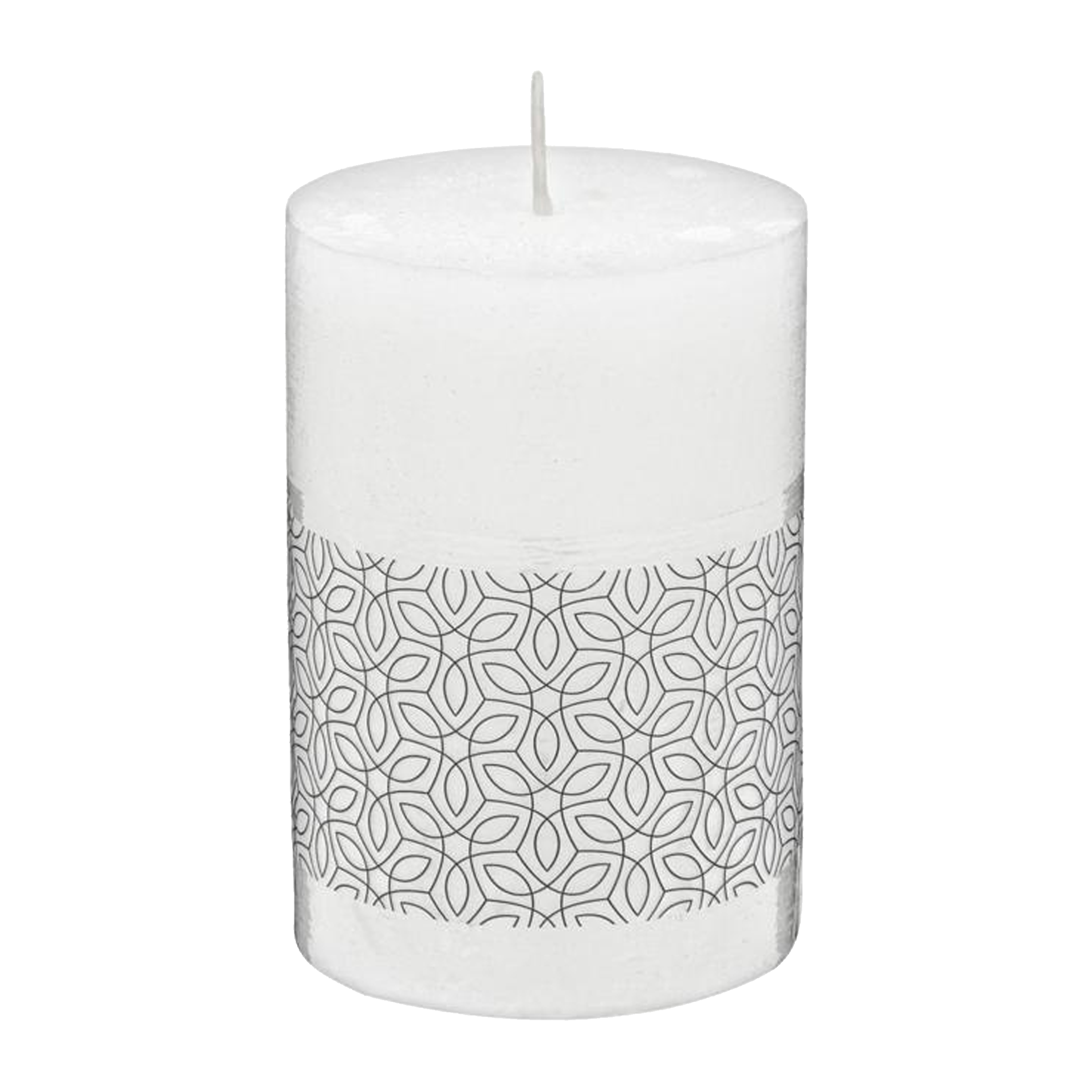 Stylová bílá válcová svíčka o rozměrech 100 × 70 mm s elegantním rustikálním vzhledem. Střed svíčky zdobí jemný černý geometrický vzor, který dodává dekoraci osobitý charakter. Ideální pro svícny, slavnostní tabule nebo jako doplněk do moderního interiéru.
