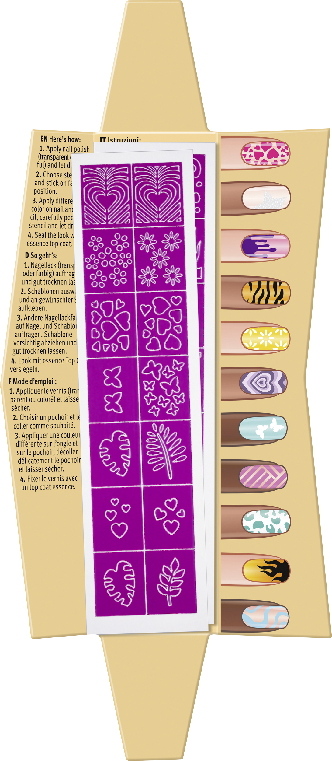 Ať už jste začátečník nebo nebo zkušený tvůrce: S esence šablonami na nehty nail art můžete vytvářet jednoduché a rychlé designy na nehtech, které obdivuje každý. Tato sada šablon obsahuje různé designy podle současných trendů – pro profesionálně vypadající nehty, které si uděláte doma. Díky jednoduché aplikaci se produkt snadno používá a pomůže vám vytvořit individuální look. A mimochodem: S šablonami nail art můžete použít jakýkoliv barevný lak na nehty!