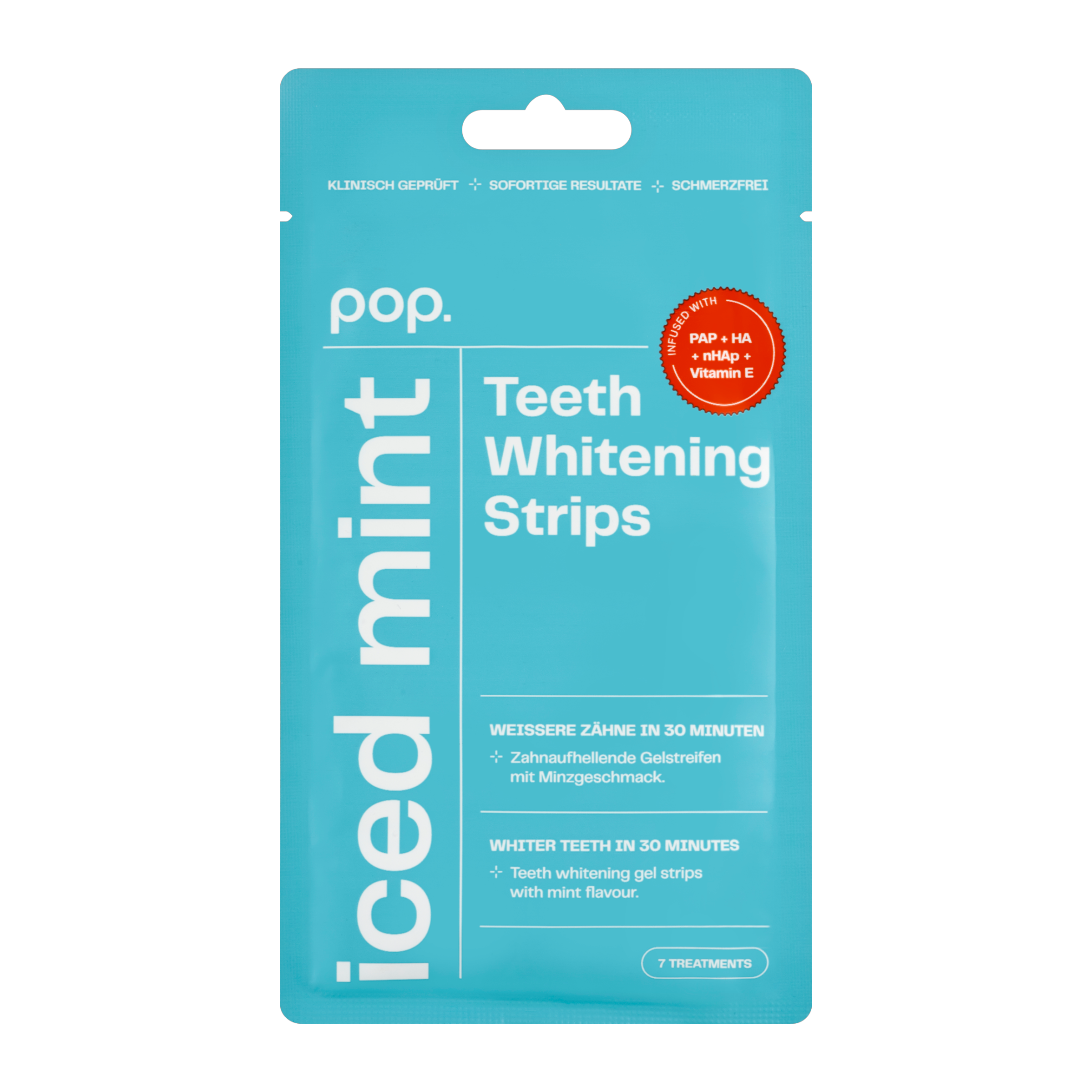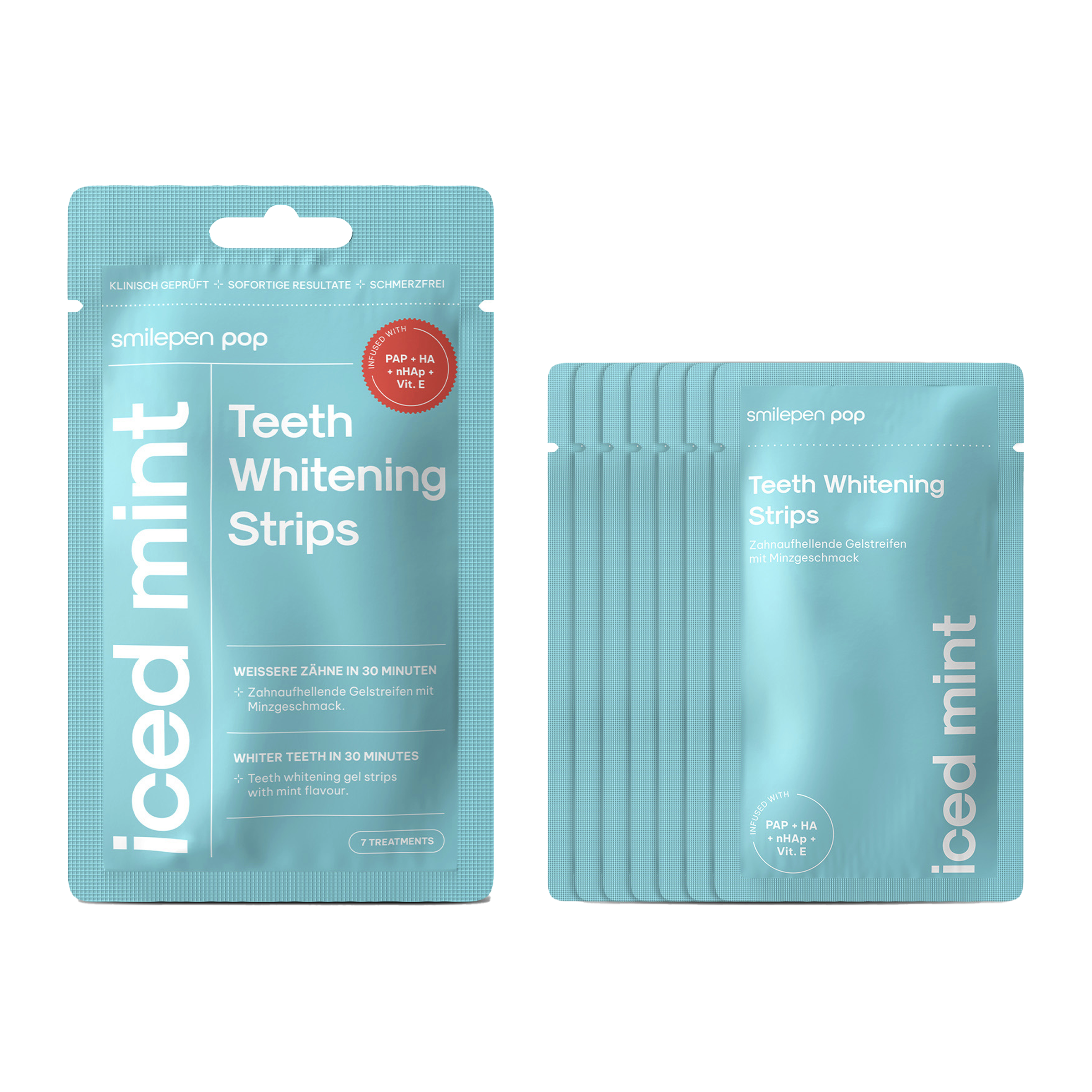 Rozjasněte svůj úsměv s bělicími pásky Smilepen Pop "Iced Mint". Bělicí pásky jsou spojením nejmodernějších technologií pro bělení zubů, příjemné vůně Iced Mint. Čím jsou pásky výjimečné? Pásky Smilepen Pop dosahují viditelně zesvětlených zubů již za 30 minut díky inovativnímu bělícímu prostředku PAP. Hlavní účinná složka PAP, ftalimido-peroxi-kapronová kyselina, patří mezi nejmodernější technologie bělení zubů bez rizika poškození zubní skloviny. Je prokázáno, že bělí zuby stejně efektivně jako tradiční formule s peroxidem vodíku. Receptura navíc obsahuje další složky, které chrání zubní sklovinu a dásně. Klinicky ověřené výsledky zaručují bezpečné a efektivní bělení. Jedno balení obsahuje 7 pásků pro horní a dolní oblouk zubů pro bělejší zuby již za týden.