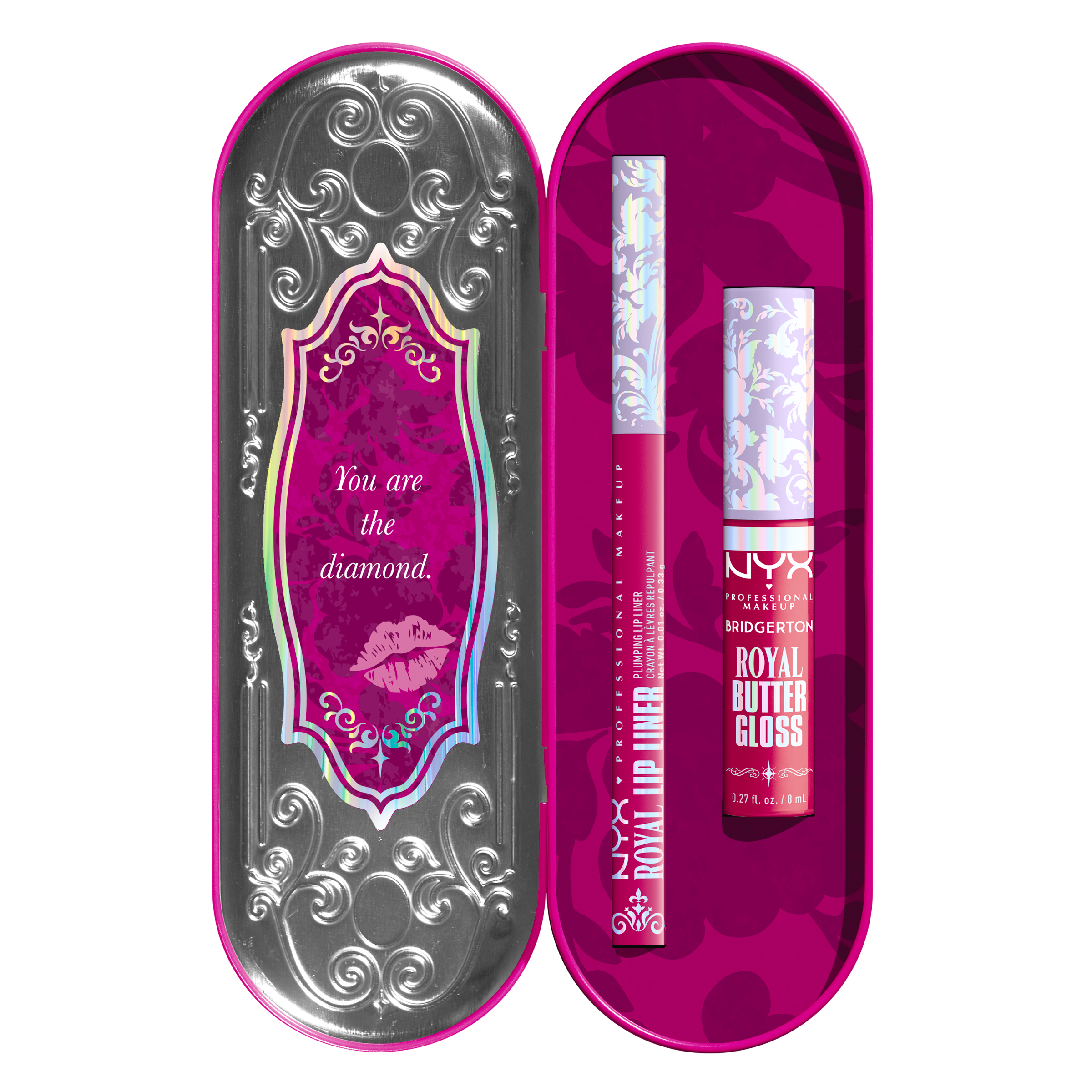 Buď tou, o kom mluví celý královský dvůr. Předveď aristokratické odstíny s okouzlujícími Bridgerton Royal Treasures 2dílnými sadami na rty, které obsahují smyslný Royal Butter Gloss a precizní zvětšující Royal Lip Liner. Inspirováno grácií a půvabem nejlepších královen z Bridgertonu, toto limitované duo je navrženo tak, aby tvým rtům dopřálo ultimativní královskou transformaci. Royal Butter Gloss nabízí máslový, nelepivý lesk se sofistikovaným finišem. Spáruj ho s Royal Duck Lip Linerem pro okamžité zvětšení a definici. Ideální pro každou příležitost, od odpoledního čaje po pozdní večerní soirée, tohle duo na rty ti zajistí bezchybný rty hodny vysoké společnosti. Veganské složení.