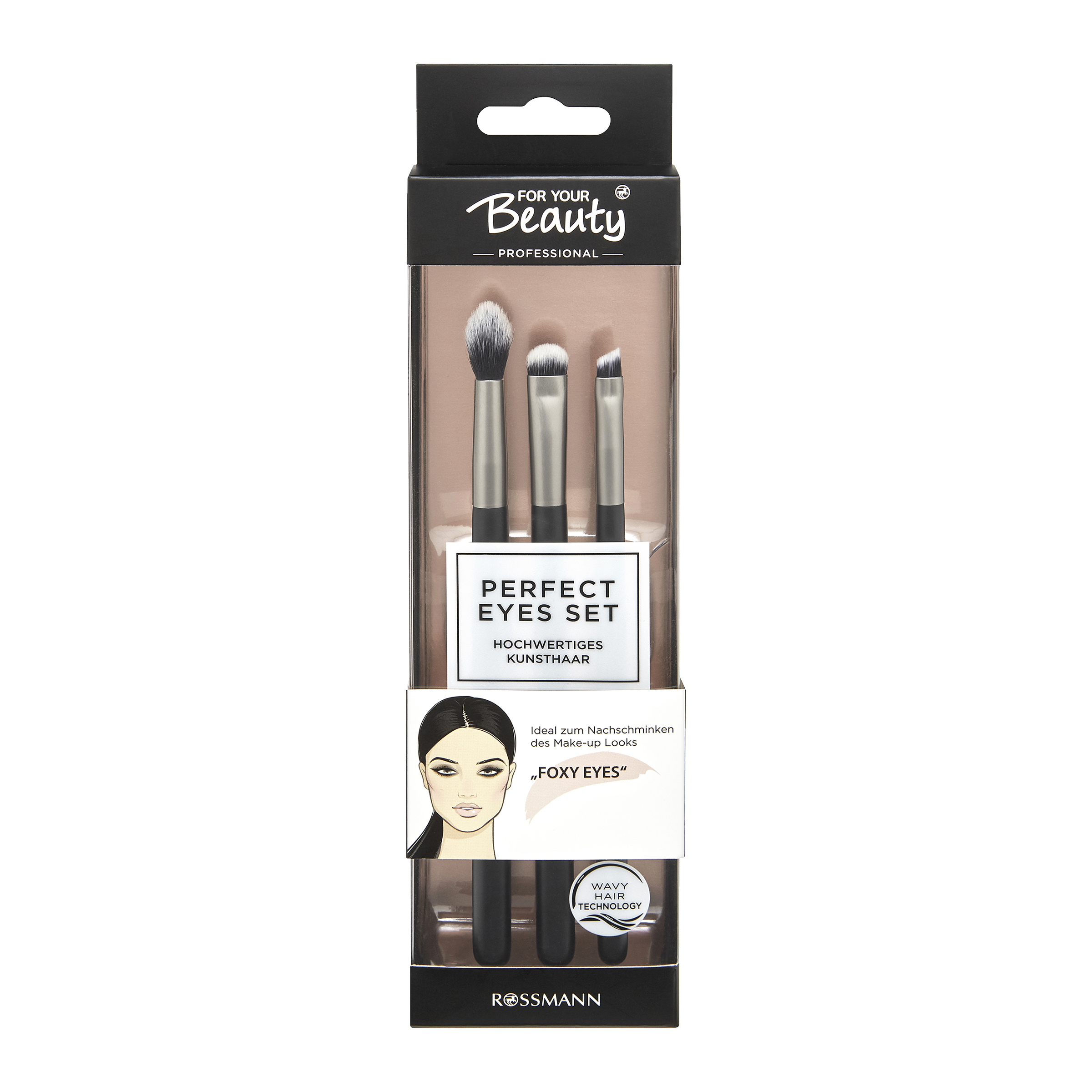 Zvýrazněný vnější koutek oka je pro Foxy Eye zásadní. S plochým štětcem na oční stíny 0301 se víčko nalíčí ve světlejším odstínu, jako je světle hnědá, a v prvním kroku se vystínuje vnější koutek oka. Pro liftingový efekt je důležité barvu jemně nanést směrem nahoru ke konci obočí. Pokud je na oku světlá barva, vzhled posílíme tmavším odstínem pomocí štětce 0302 Tapered Blender Brush k nanesení tmavší barvy na linii řas jako oční linky rozetřeme směrem nahoru. Nakonec se pomocí štětce na oční linky 0303 nakreslí černá linka, ale se zdůrazněním pouze vnějšího koutku. Oční linkou proto začněte ideálně uprostřed očí a linku nechte lehce vyběhnout směrem k obočí.
