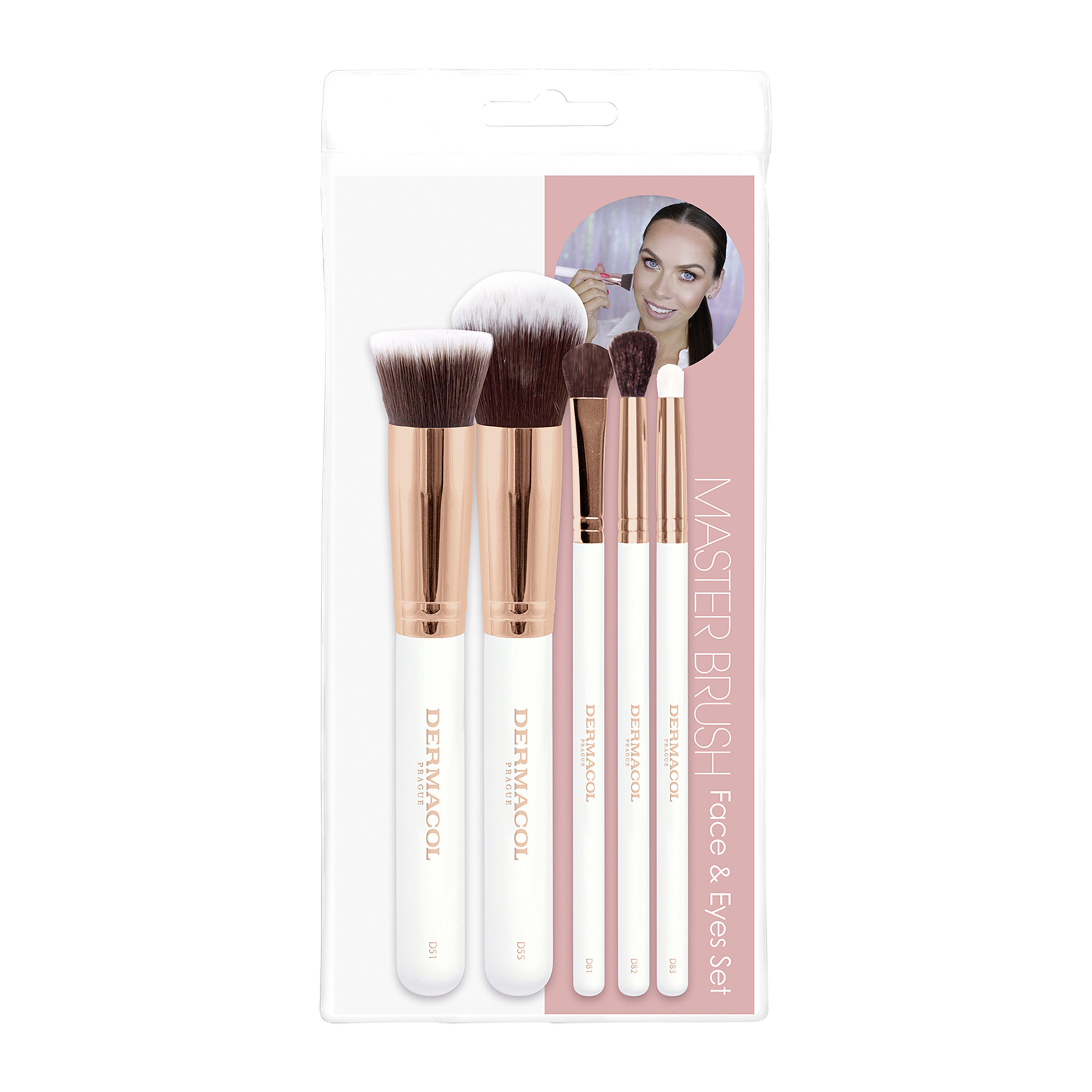 Praktická sada štětců, která obsahuje štětec na make-up, pudr, a tři druhy štětců na oči.
