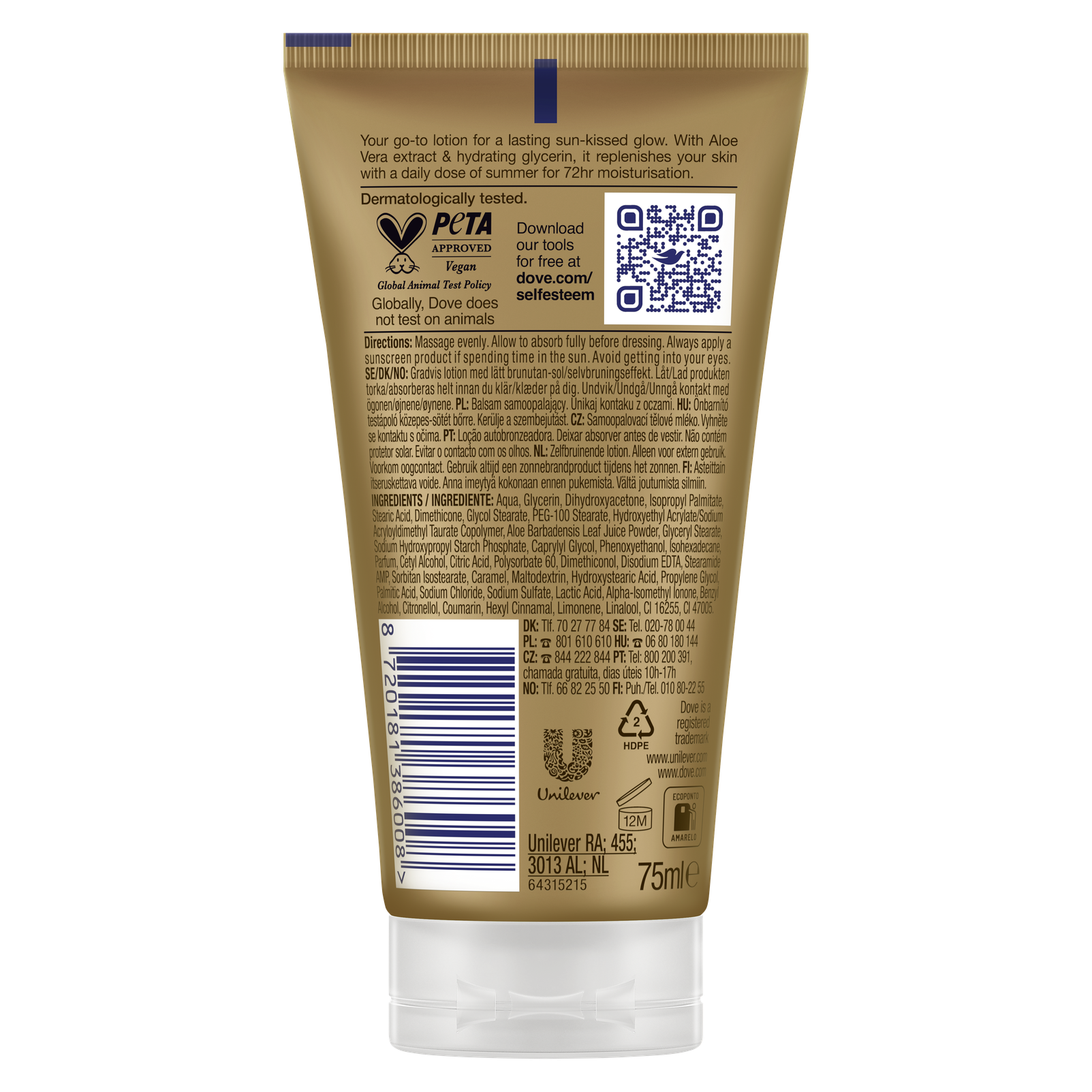 Aqua, Glycerin, Dihydroxyacetone, Isopropyl palmitate, Stearic acid, Dimethicone, Glycol stearate, PEG-100 stearate, Hydroxyethyl acrylate/sodium acryloyldimethyl taurate copolymer, Aloe barbadensis leaf juice powder, Glyceryl stearate, Sodium hydroxypropyl starch phosphate, Caprylyl glycol, Phenoxyethanol, Isohexadecane, Parfum, Cetyl alcohol, Citric acid, Polysorbate 60, Dimethiconol, Disodium EDTA, Stearamide AMP, Sorbitan isostearate, Caramel, Maltodextrin, Hydroxystearic acid, Propylene glycol, Palmitic acid, Sodium chloride, Sodium sulfate, Lactic acid, Alpha-isomethyl ionone, Benzyl alcohol, Citronellol, Coumarin, Hexyl cinnamal, Limonene, Linalool, CI 16255, CI 47005