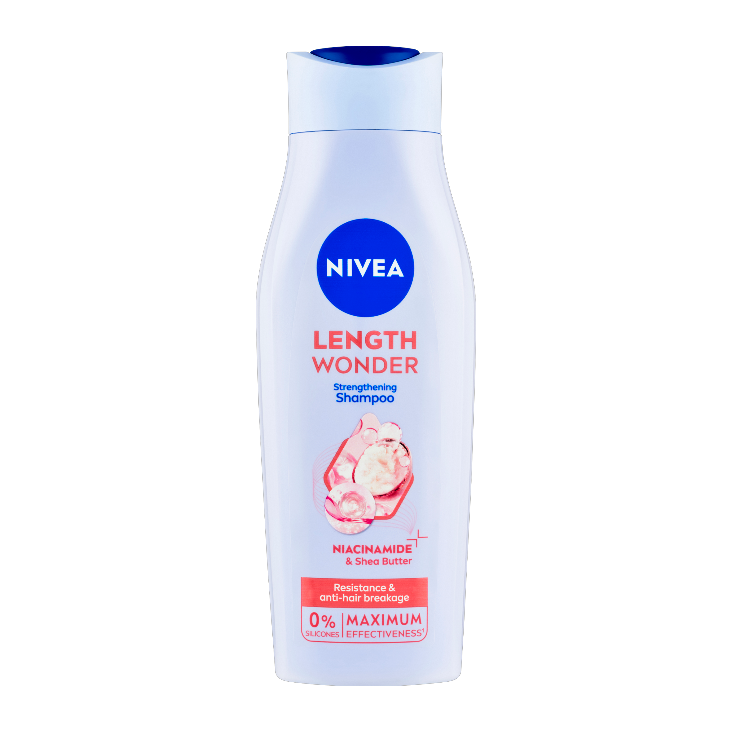 Objevte šampon NIVEA Length Wonder, který byl speciálně vyvinut pro péči o dlouhé vlasy. Díky obsahu niacinamidu dodává vlasům sílu, zabraňuje lámání a podporuje jejich růst do větší délky. Bambucké máslo efektivně vyživuje a vyhlazuje vlasovou strukturu, čímž pomáhá předcházet roztřepeným konečkům. Šampon neobsahuje silikony, jeho složení je veganské a z 99 % biologicky rozložitelné. Užijte si zdravé, dlouhé a krásné vlasy s maximální péčí.