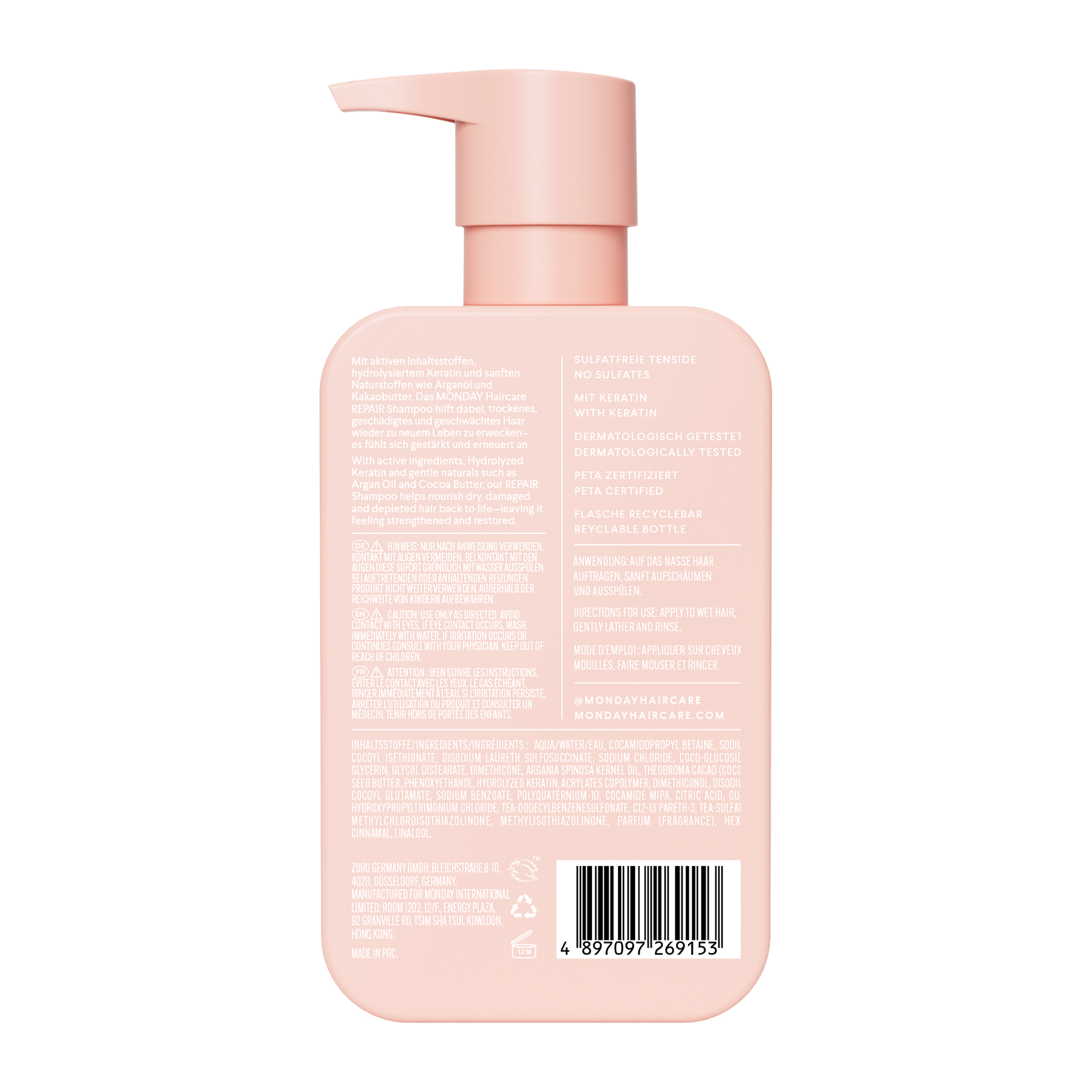 Regenerační šampon MONDAY s aktivními složkami, hydrolyzovaným keratinem a jemnými přírodními látkami, jako je arganový olej a kakaové máslo. Pomáhá revitalizovat suché, poškozené a oslabené vlasy. Vlasy jsou posílené a obnovené.