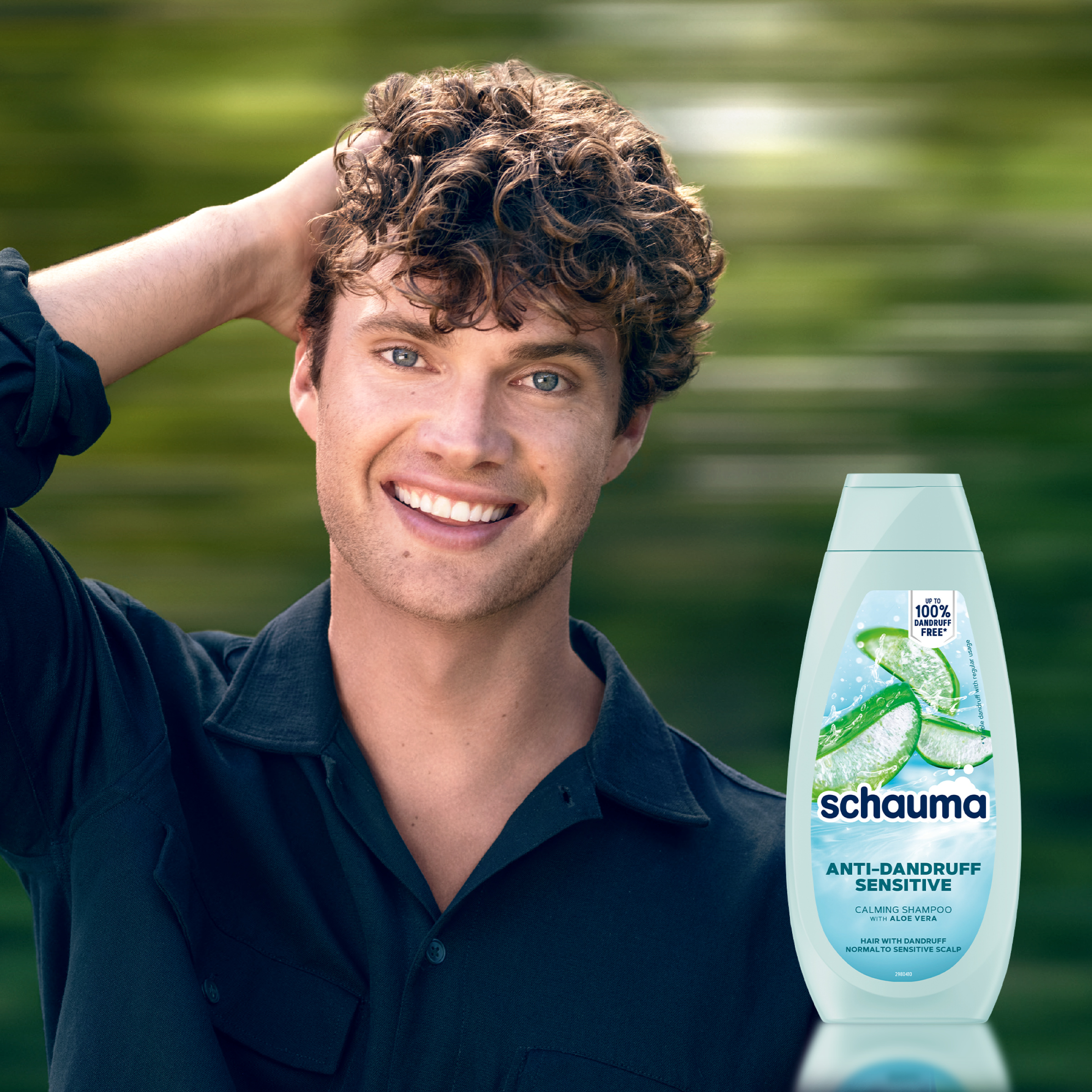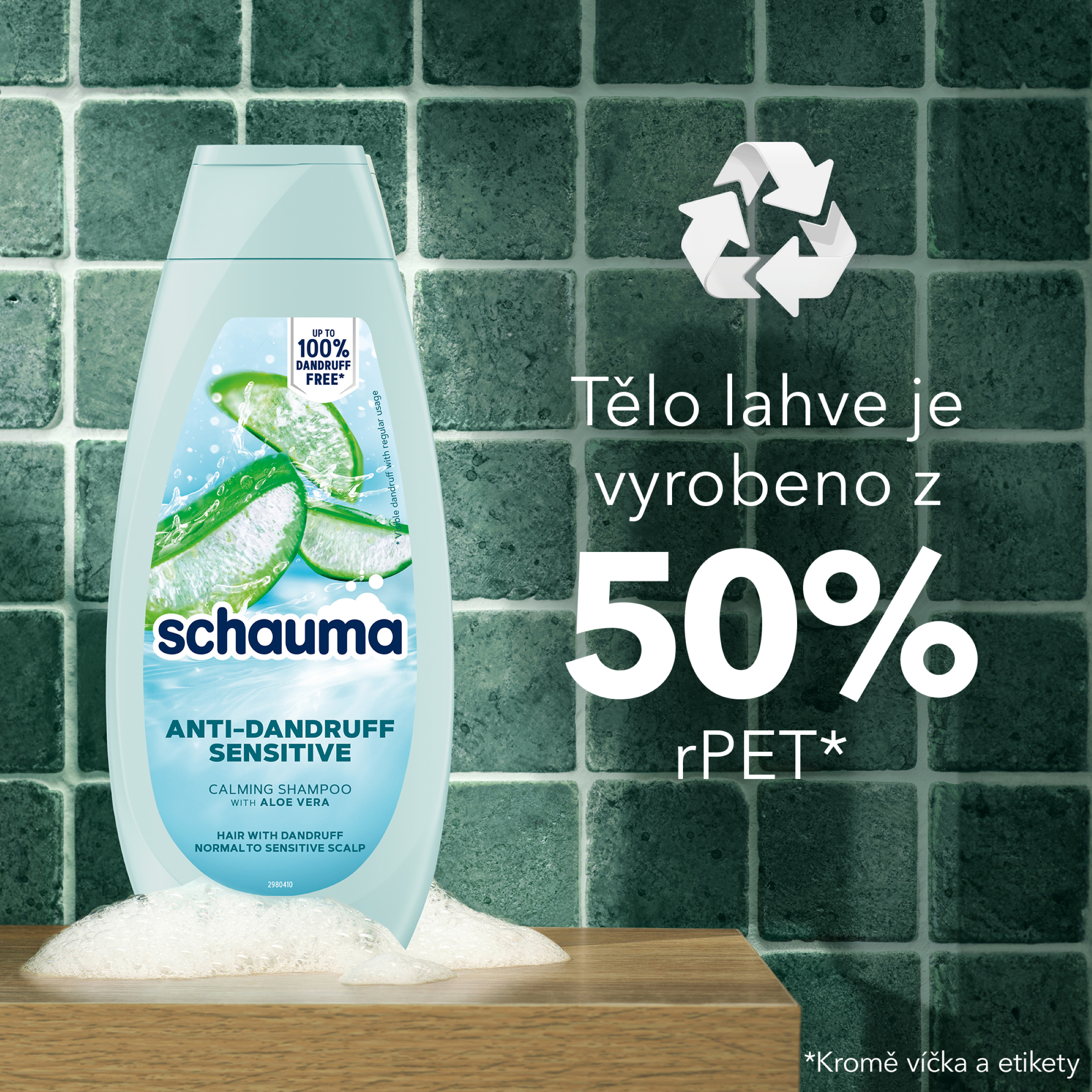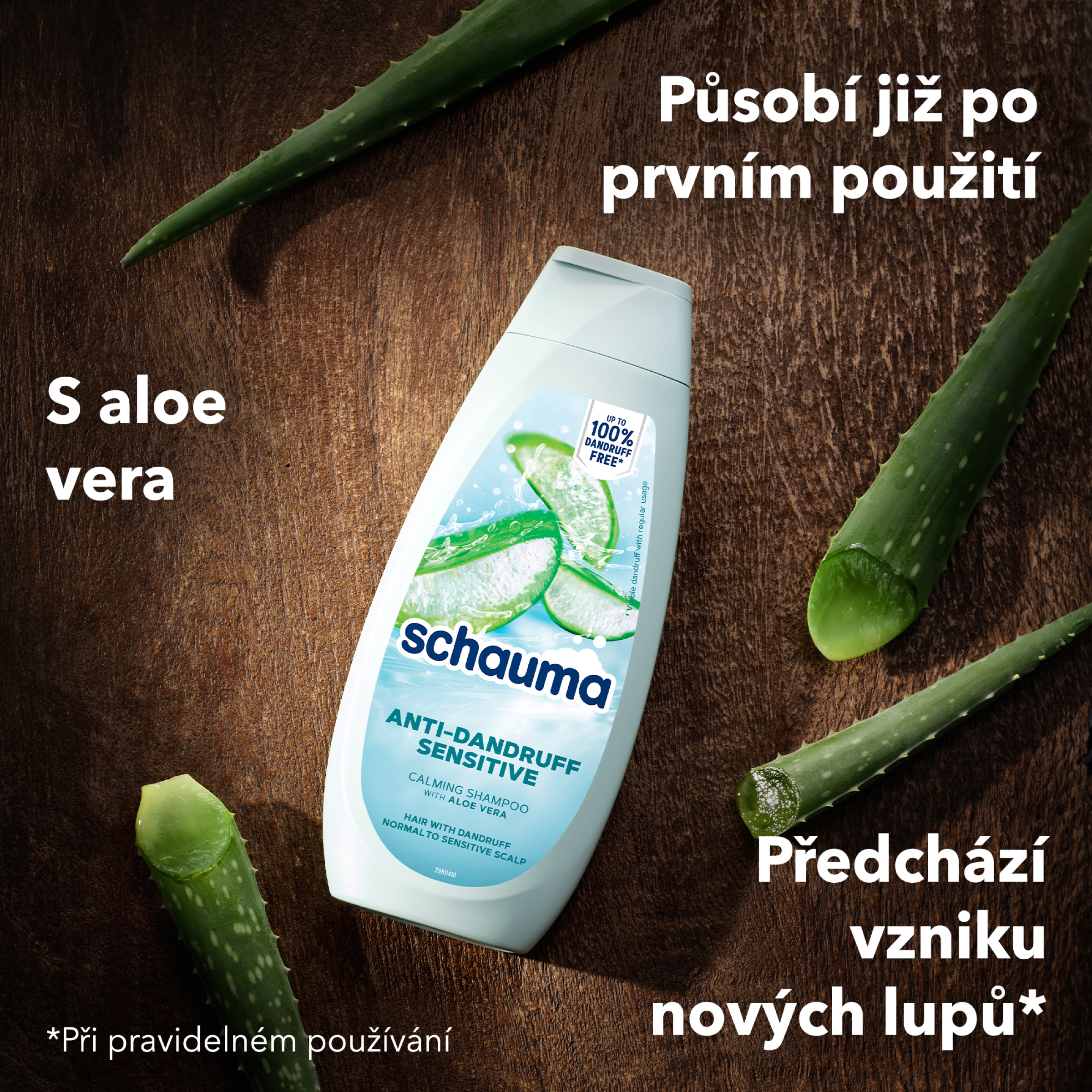 Schauma Anti-Dandruff Sensitive zklidňující šampon s aloe vera na vlasy s lupy, pro normální až citlivou pokožku hlavy. Pro čisté vlasy až 100% bez lupů*. Účinný již po prvním použití. *Viditelné lupy při pravidelném používání.