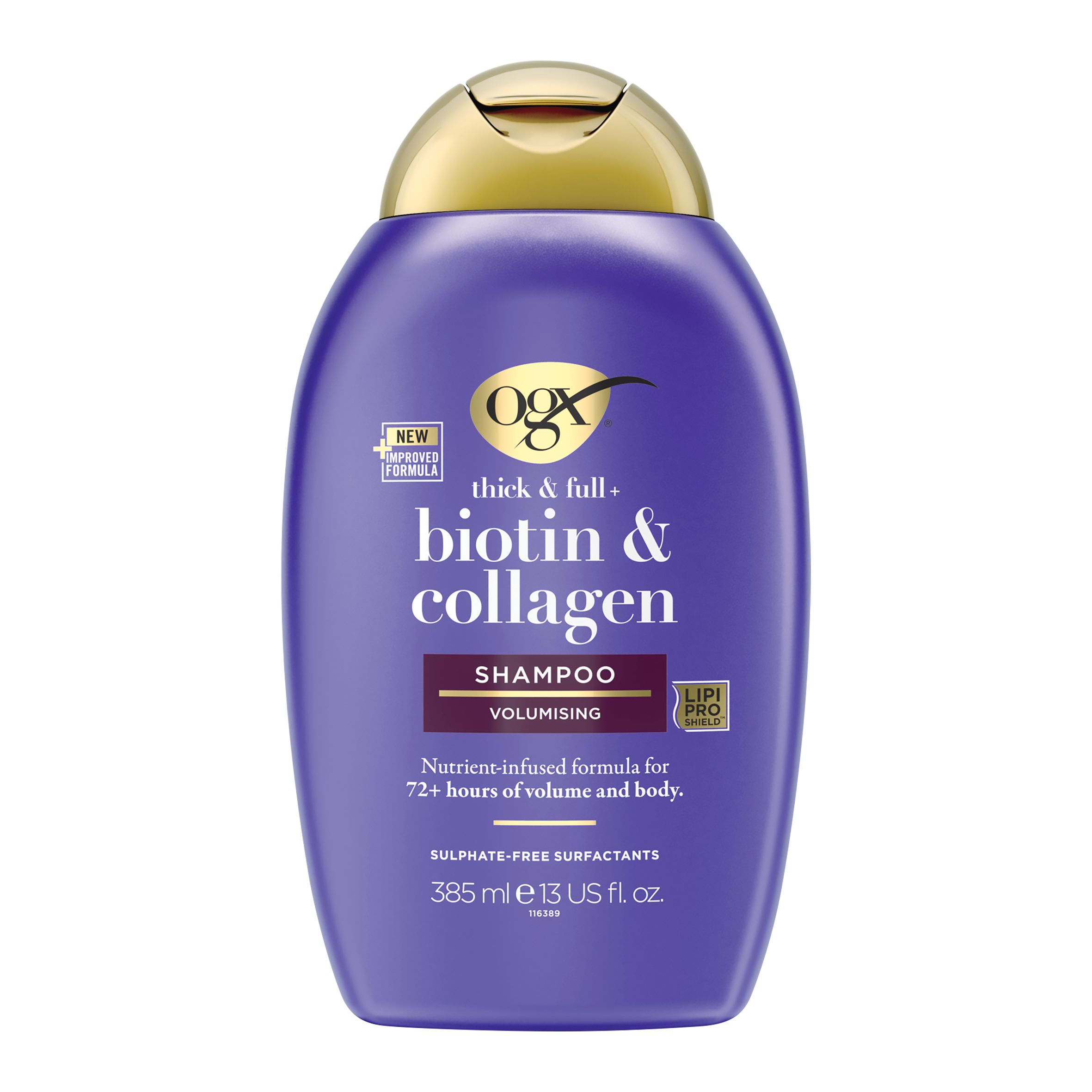 Účinné složení šamponu OGX Biotin & Collagen pomáhá dávat objem i těm nejjemnějším vlasům a vytvářet plnější a hustější účes.