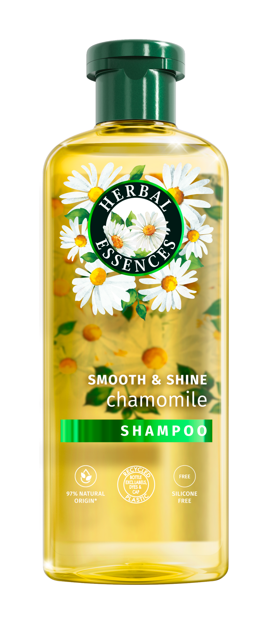 Díky šamponu Herbal Essences Chamomile Smooth & Shine a jeho přírodním tajemstvím pro lesklé vlasy budete zářit. Tento veganský šampon posílí přirozený lesk a hebkost vašich vlasů a navíc jim dodá uklidňující vůni díky výtažku z heřmánku, který evokuje povzbuzující pocit letní louky. Tento šampon bez silikonů s bohatou směsí živin rostlinného původu se přemění v luxusní pěnu, která myje a revitalizuje matné vlasy. Naše složky přírodního původu jsou pečlivě vybrané tak, byste si mohli ve své koupelně užívat úžasnou krásu bylin. Vraťte svým vlasům přirozenou krásu a potěšte své smysly díky kompletní řadě z naší kolekce Chamomile Smooth & Shine.