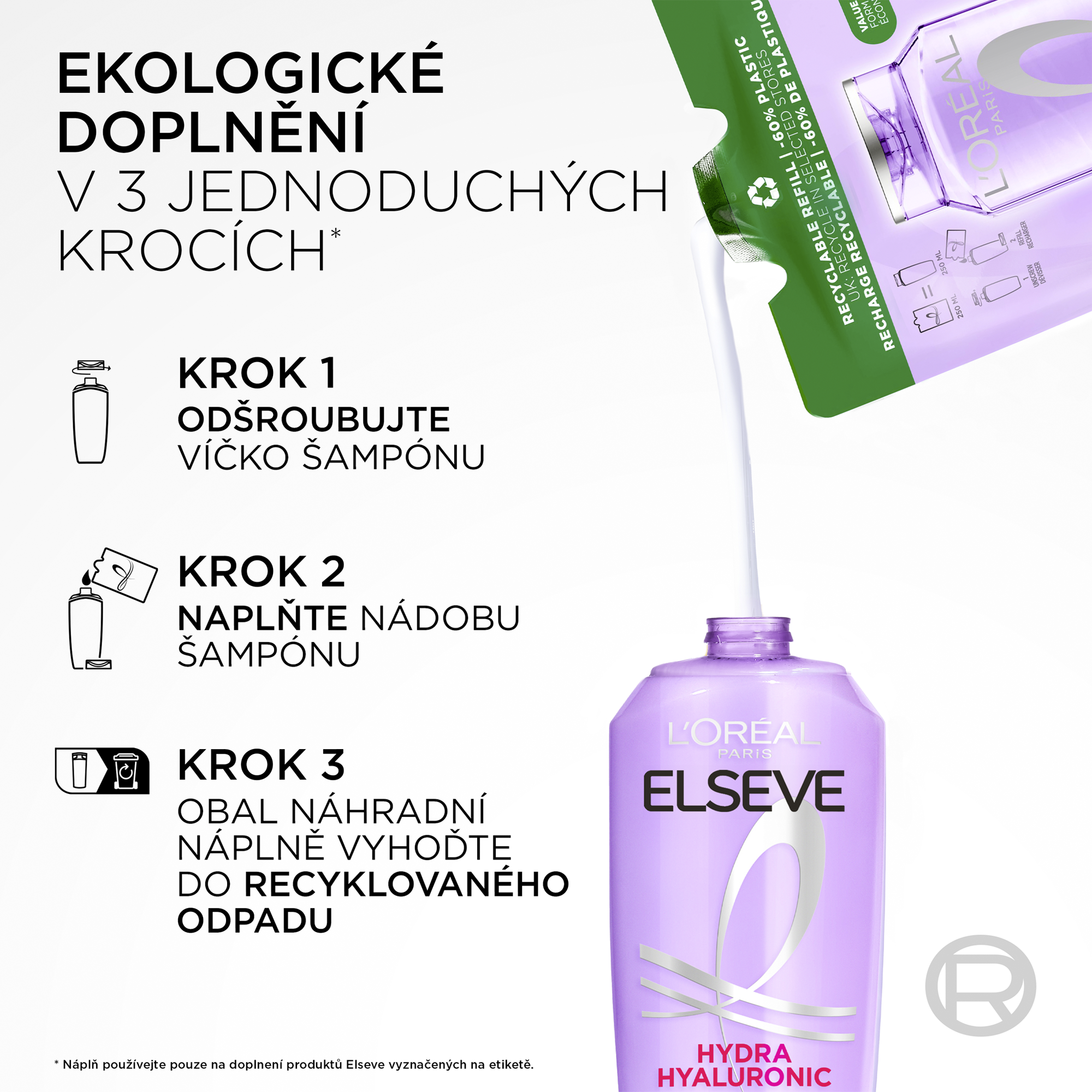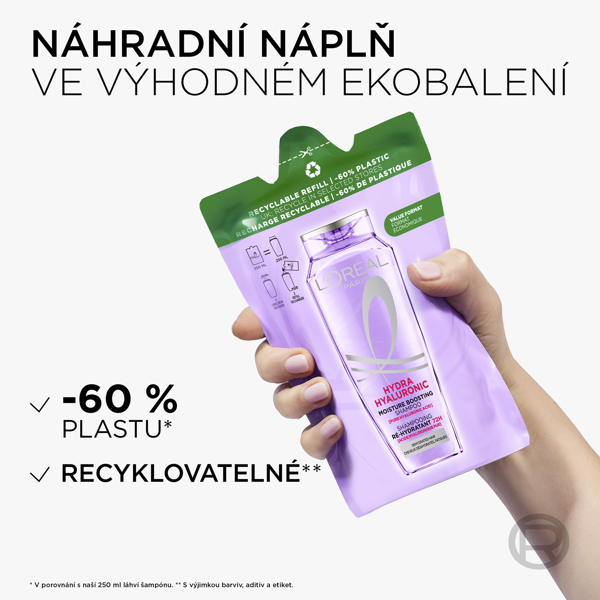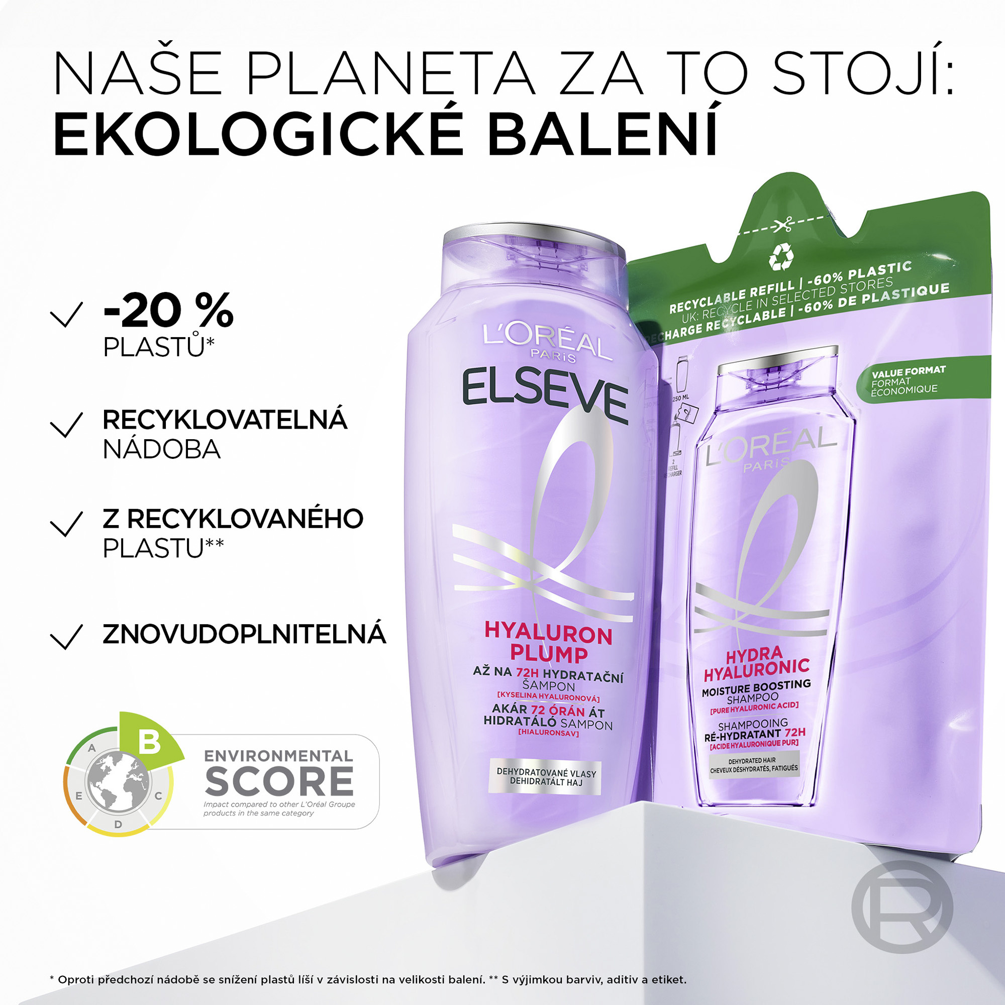 Dopřejte dehydratovaným vlasům intenzivní hydrataci a současně snižte spotřebu plastu díky výhodnému balení 400 ml šamponu a 250 ml náhradní náplně. Hydratační šampon L'Oréal Paris Elseve Hyaluron Plump využívá sílu kyseliny hyaluronové, která účinně uzamyká vlhkost ve vlasových vláknech a vytváří ochranný film na jejich povrchu. Vlasy získávají zářivý lesk, lehkost a viditelně zdravější vzhled. Šampon působí až 72 hodin**, během kterých udržuje vlasy hydratované, hebké a plné vitality.