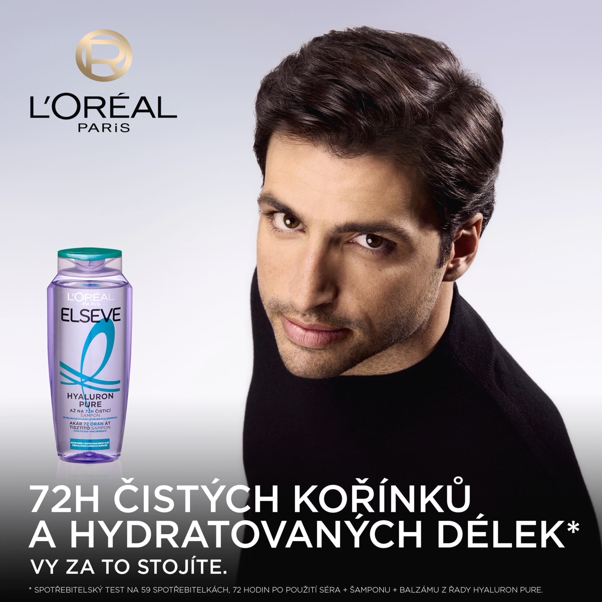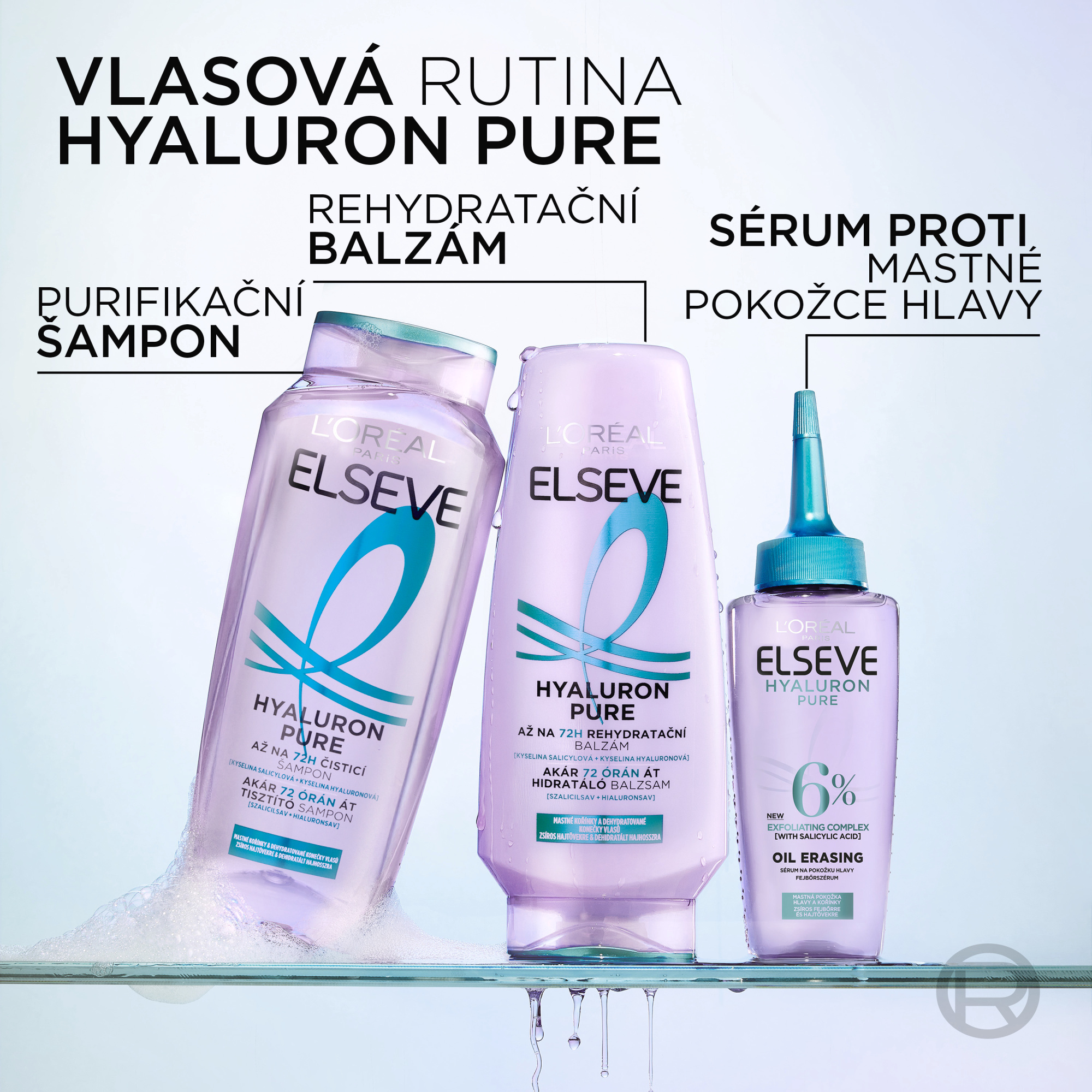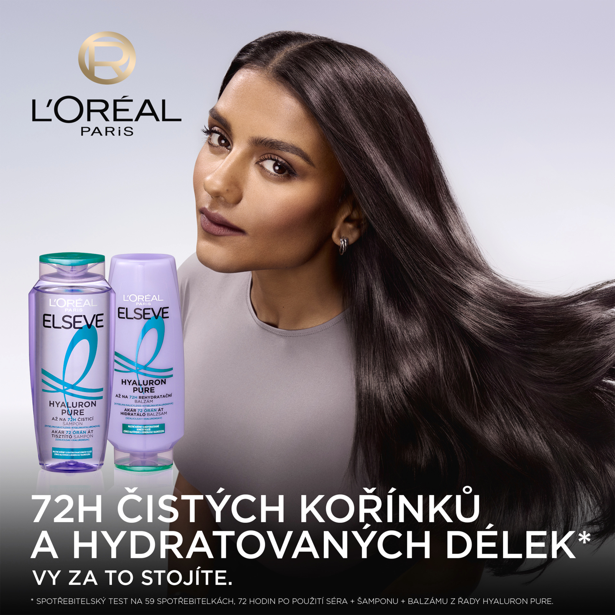 (1) Spotřebitelský test na 59 spotřebitelkách, 72 hodin po použití séra + šamponu + balzámu z řady Hyaluron Pure.