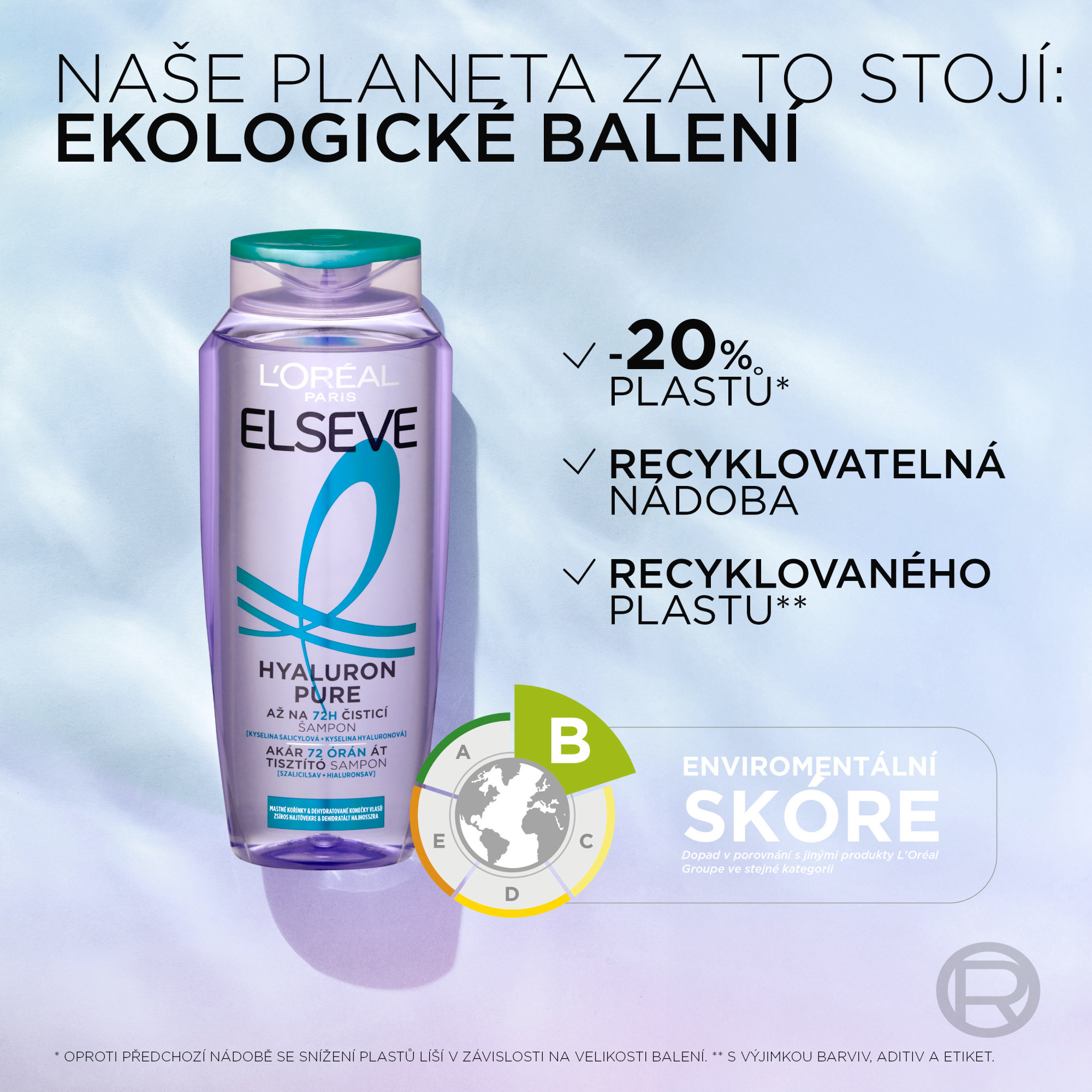 Odstraňuje mastnotu a nečistoty z pokožky hlavy a poskytuje rehydrataci po dobu až 72 hodin (1). (1) Spotřebitelský test na 59 spotřebitelkách, 72 hodin po použití séra + šamponu + balzámu z řady Hyaluron Pure.