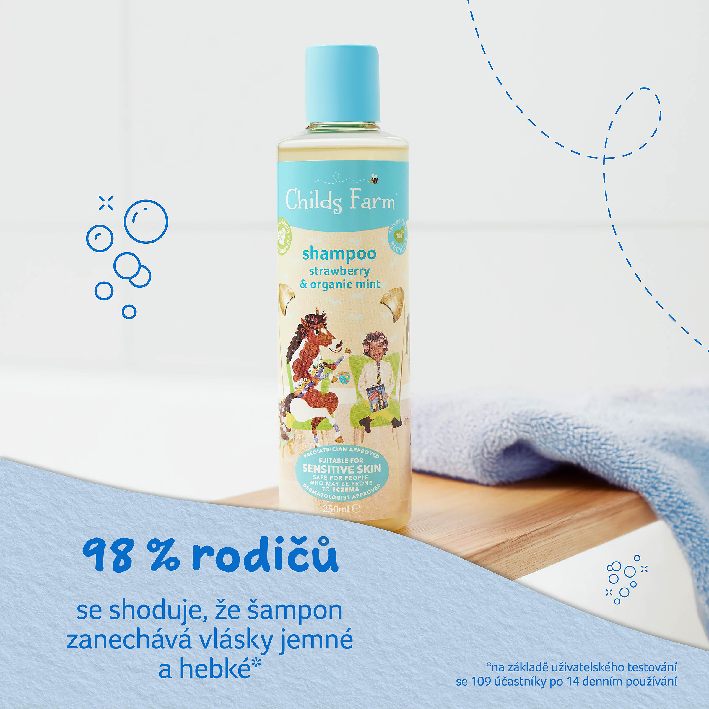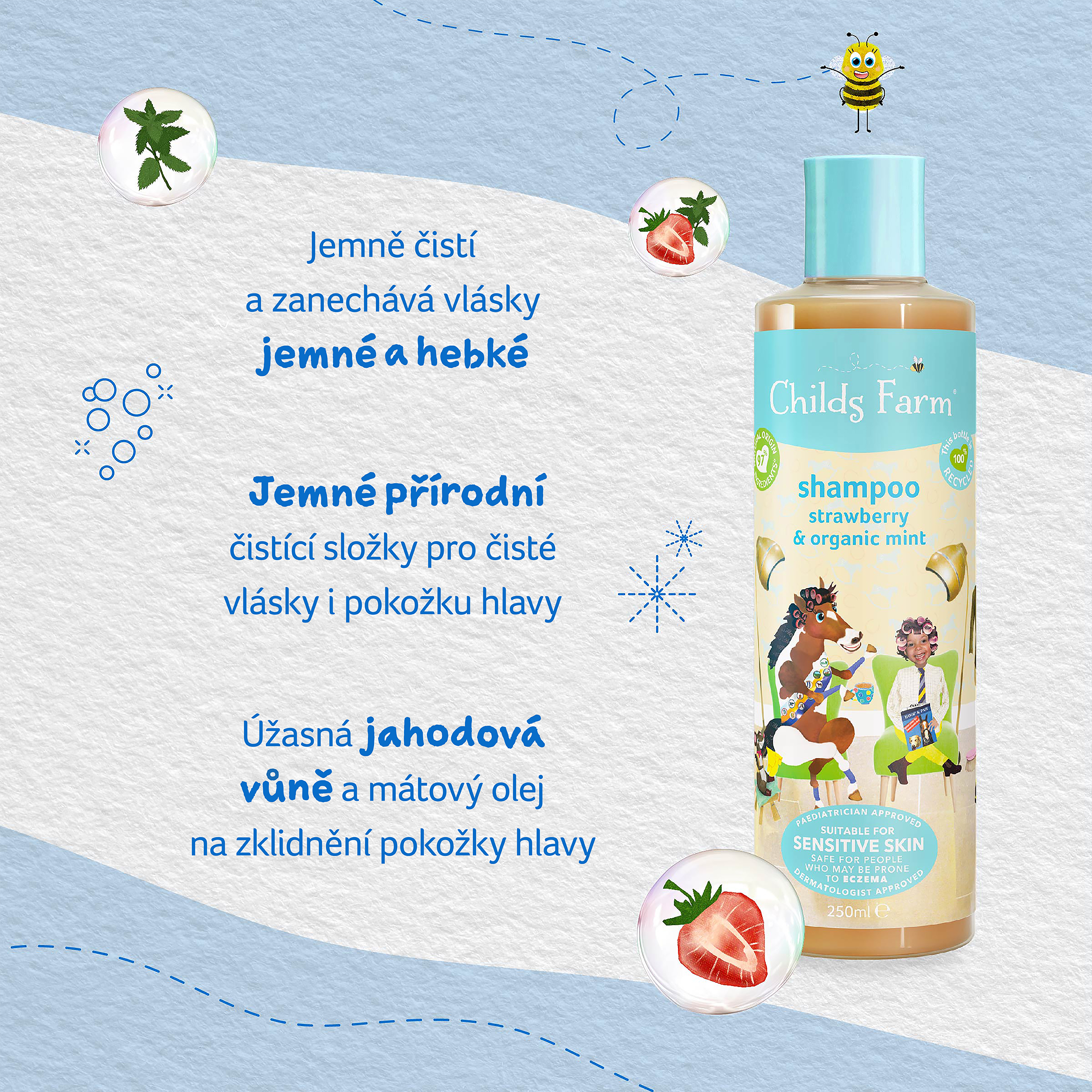 Dětský šampon pro jemné vlásky s vyživujícím složením pro snížení statické elektřiny ve vlasech a zmírnění zacuchání. Šampon obsahuje čistící látky z kukuřice a kokosu, které vlasy jemně čistí a zanechávají je hebké, a má jahodovou a mátovou vůní. Doporučujeme používat v kombinaci s Childs Farm Kondicionérem jahoda a máta. Produkty Childs Farm jsou schválené dermatology i pediatry a nesou označení vegan a cruelty free.