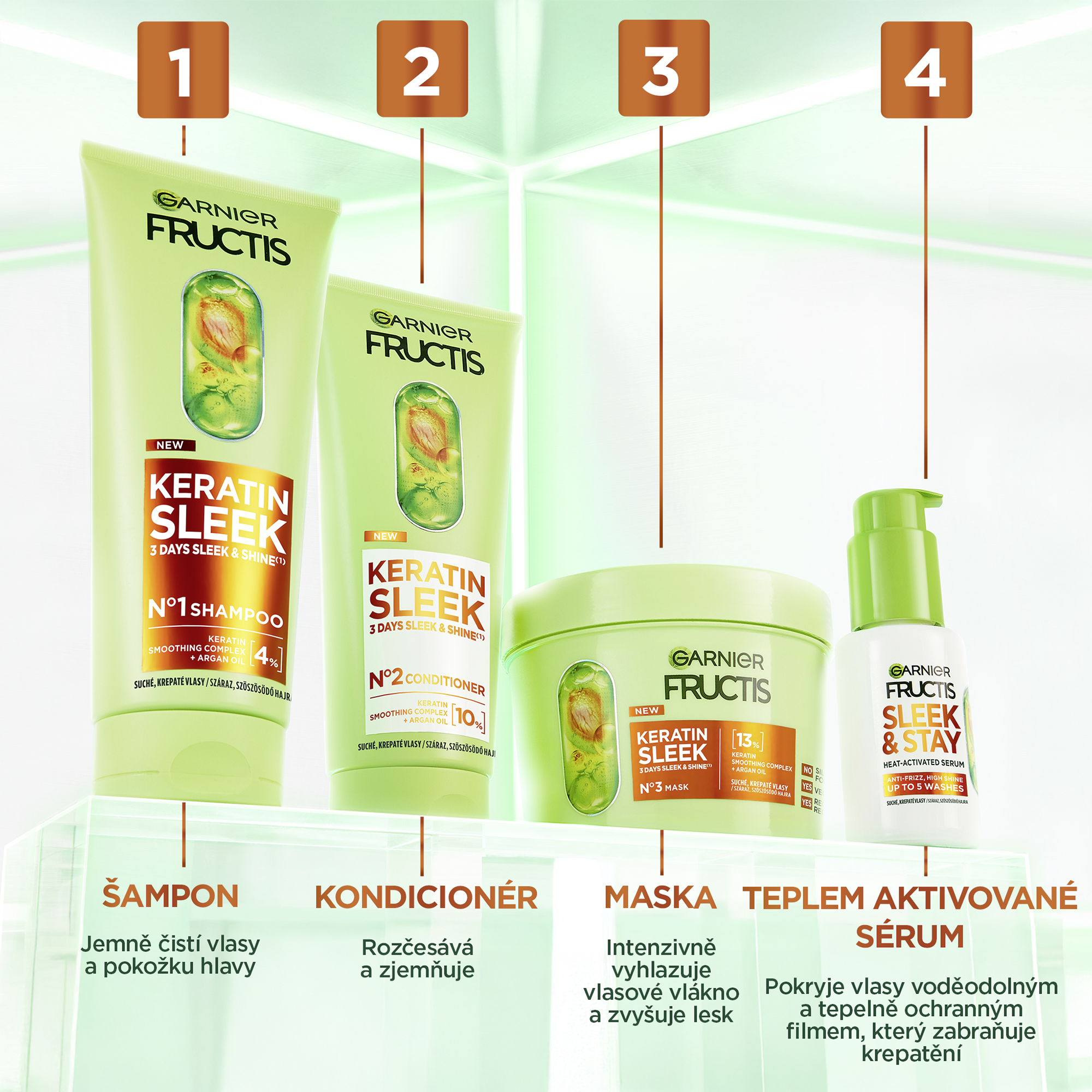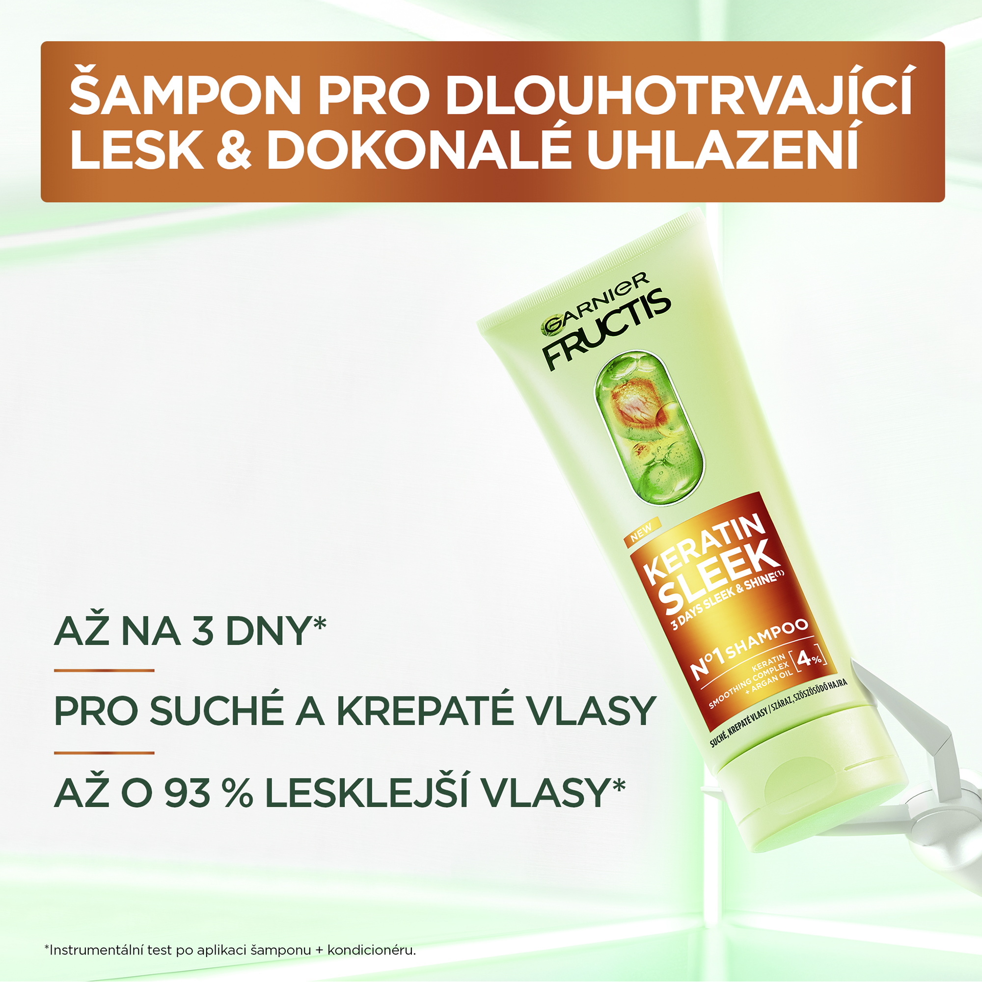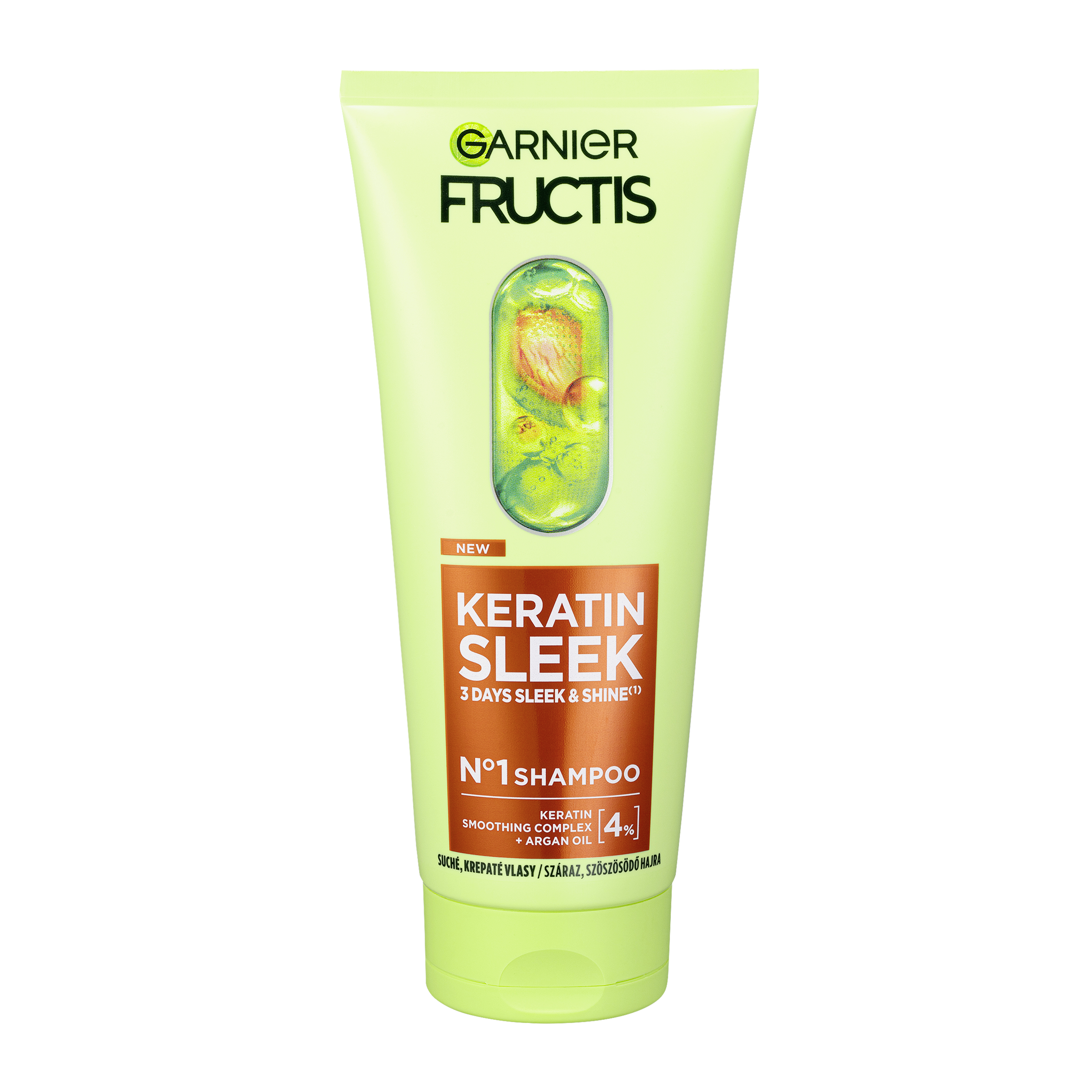Šampon pro suché a krepaté vlasy pro dlouhotrvající lesk a dokonalé uhlazení. Složení s uhlazujícím komplexem a rostlinným keratinem + arganovým olejem okamžitě uhlazuje vlasové vlákno. Šampon Keratin sleek je prvním ze 4 kroků Keratin sleek rutiny pro dlouhotrvající lesk a perfektně hladké vlasy. Perfektní uhlazení a vlasy bez krepatění, až o 93 % lesklejší vlasy. (3) Instrumentální test po aplikaci šamponu + kondicionéru.