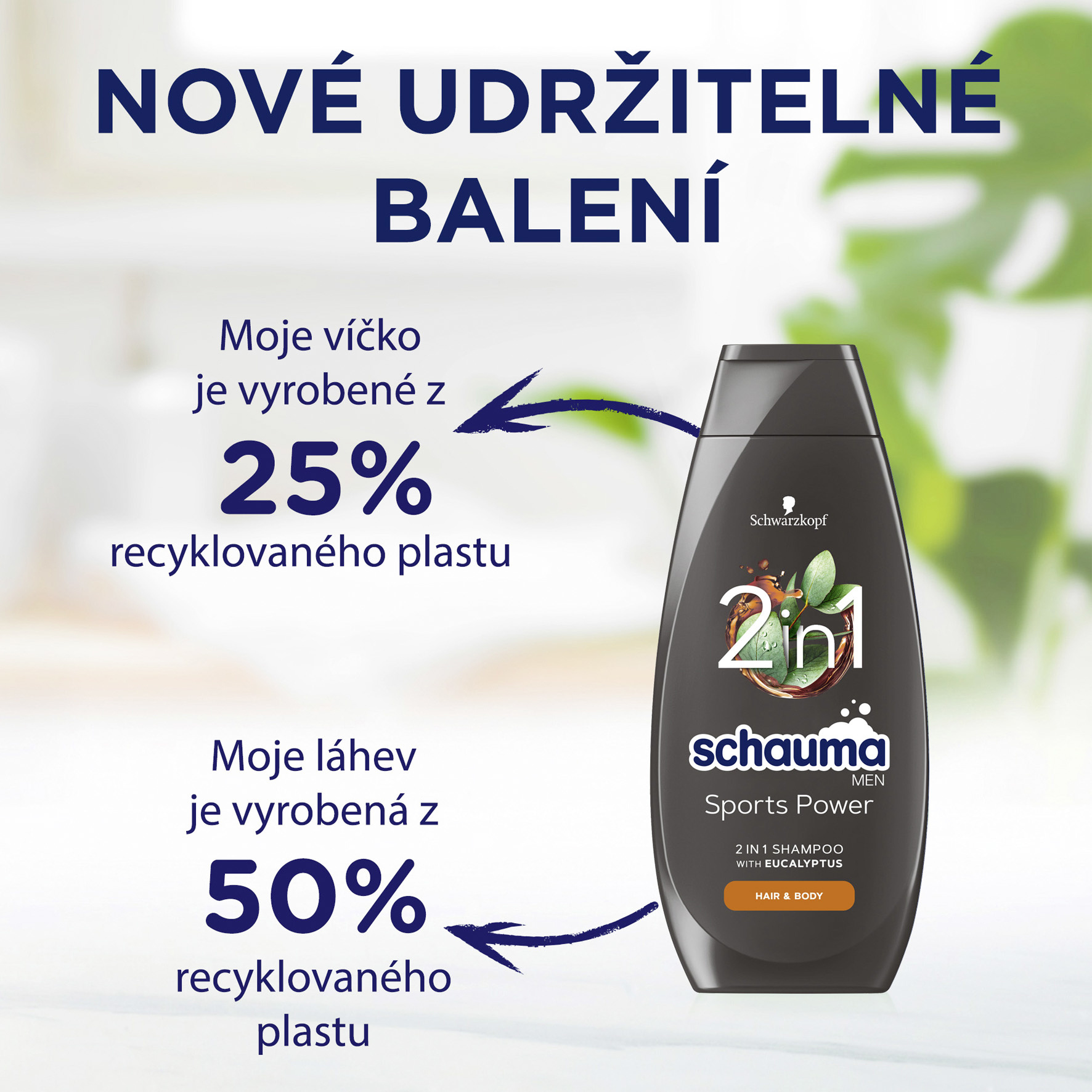 Schauma Sports Power 2v1 šampon s obsahem eukalyptu pro vlasy a tělo. Ahoj! Jsem tvůj šampon a tohle pro tebe dělám: Moje energizující vůně ti dodá okamžitou svěžest a sílu, zatímco já tvé vlasy okamžitě posílím. Užij si mé veganské složení* s výtažkem z eukalyptu. Jsem znovu použitelný: Tělo mé láhve je vyrobeno z 50 % z recyklovaného plastu, zatímco mé víčko je vyrobeno z 25 % z recyklovaného plastu. Nezapomeň mě recyklovat! Jak mě používat? Jemně mě nanes do mokrých vlasů, nech krátce působit a důkladně opláchni. A nezapomeň: Během používání vypni vodovodní kohoutek – a šetři tak vodou!