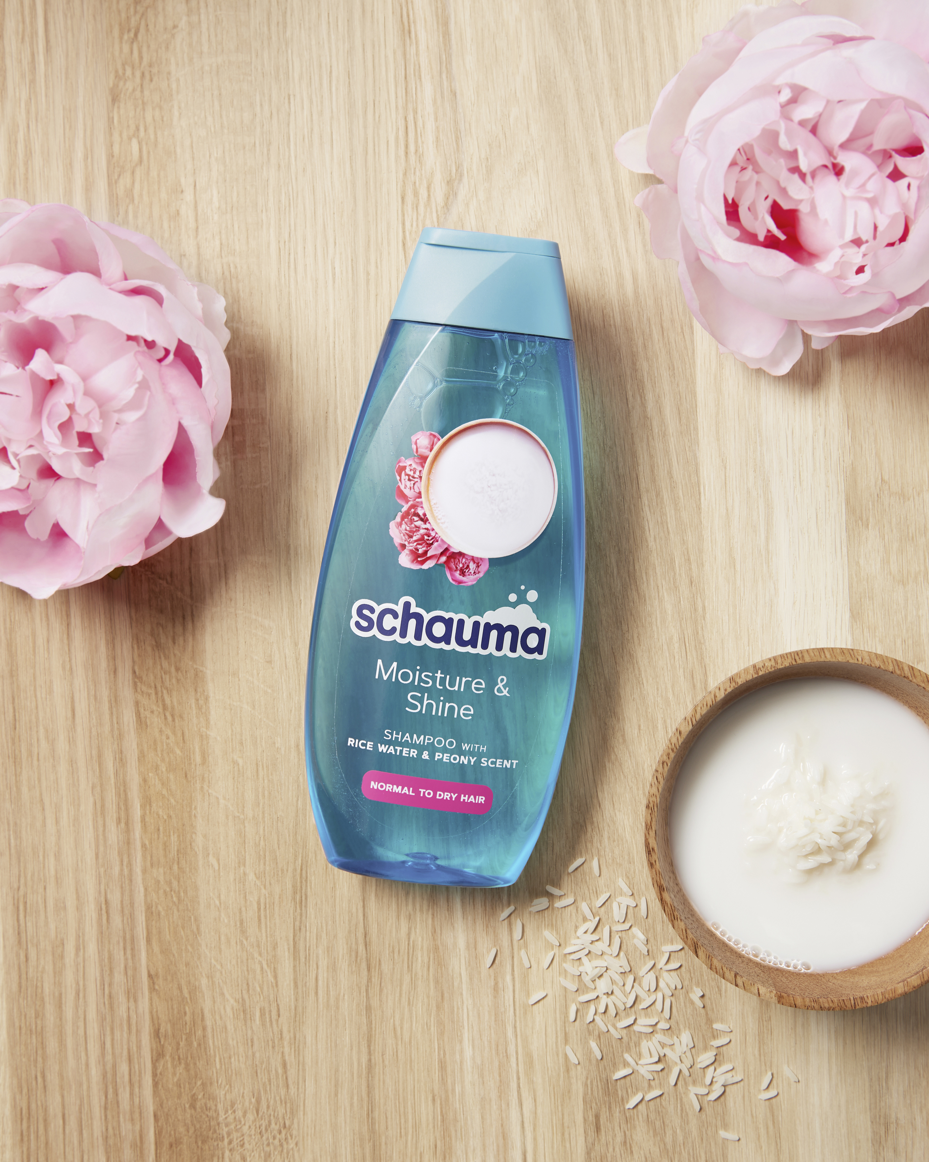 Schauma šampon Moisture & Shine s rýžovou vodou & vůní pivoňky pro normální až suché vlasy. Jemně čistí pokožku hlavy a hloubkově hydratuje vlasy zevnitř pro jejich zářivý a zdravý vzhled.