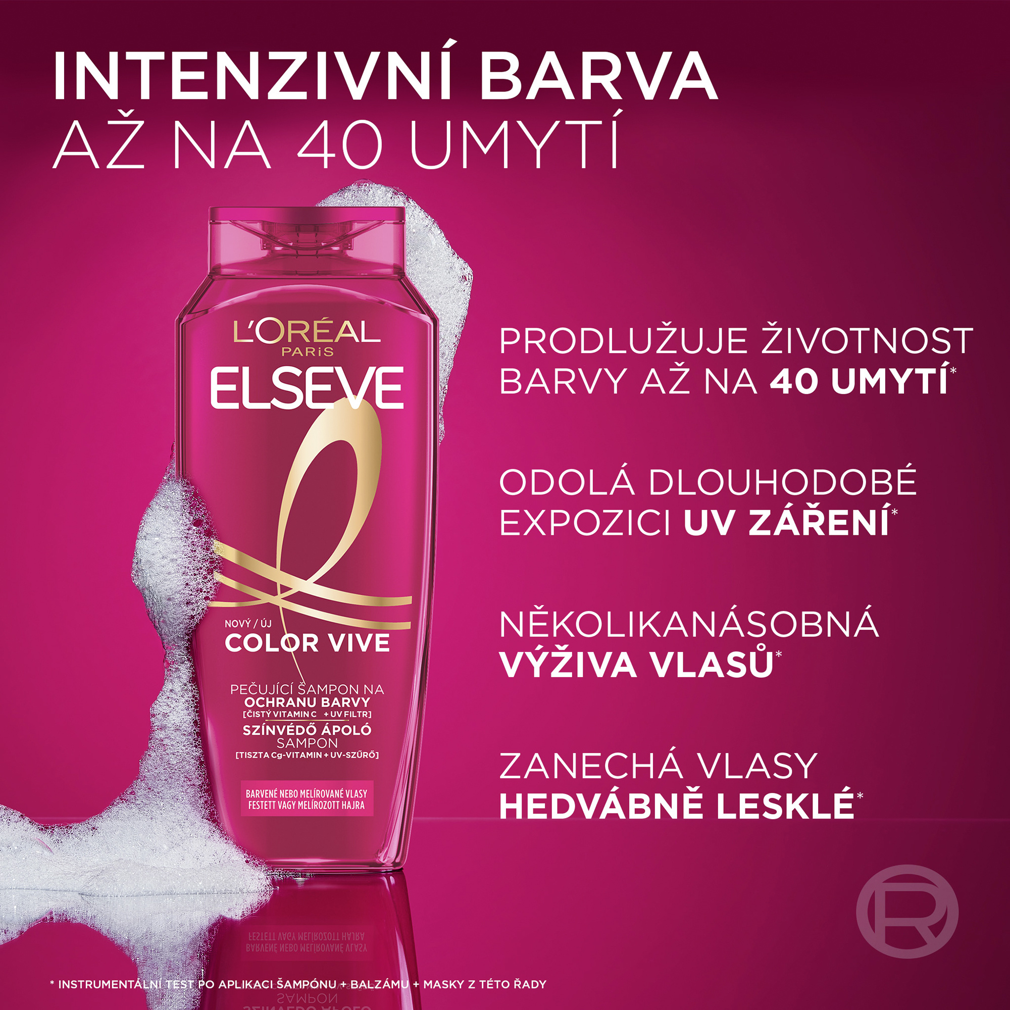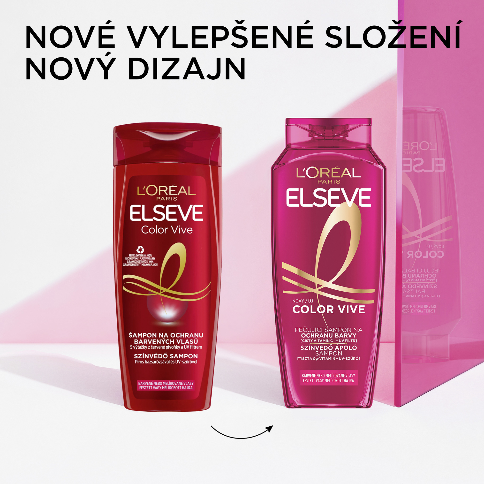 Jak prodloužit životnost barvy na vlasy? Šampon ELSEVE COLOR VIVE obsahuje elixír ze lněného semínka a UVA/UVB filtry a chrání a vyživuje barvené vlasy. O barvené vlasy pečuje již během mytí. Působí na prodloužení životnosti barvy a zanechává vlasy hedvábně lesklé.