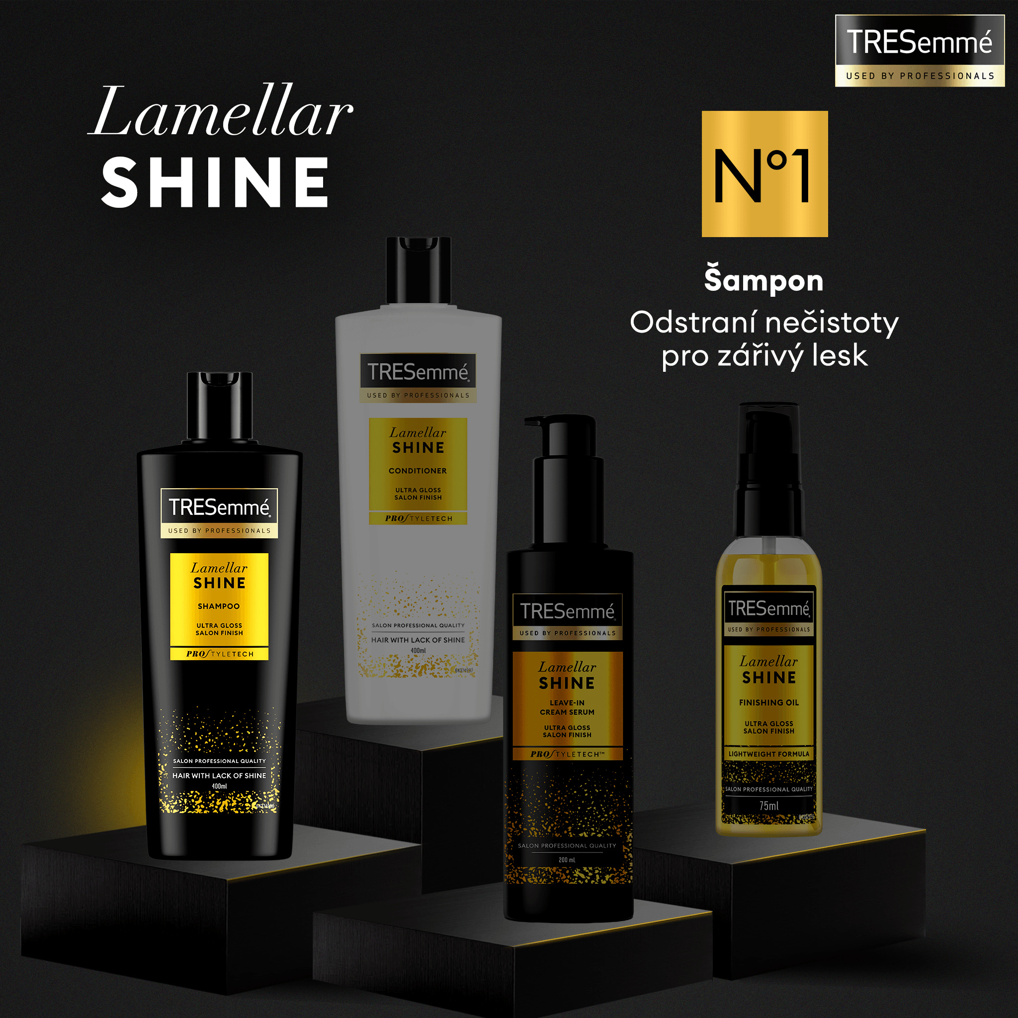 Šampon TRESemmé Lamellar Shine je klíčem k oslnivému lesku, který byste získali v profesionálním salónu. Jeho PRO Style technologie obohacená o aminokyseliny a ceramidy nejen posiluje vlasy, ale také je zanechává snadno upravitelné. S TRESemmé můžete vyjádřit svůj individuální styl a díky profesionální péči o vlasy dosáhnout čehokoliv budete chtít. Vyprávějte tedy svůj příběh a sebevědomě dosáhněte svých cílů.