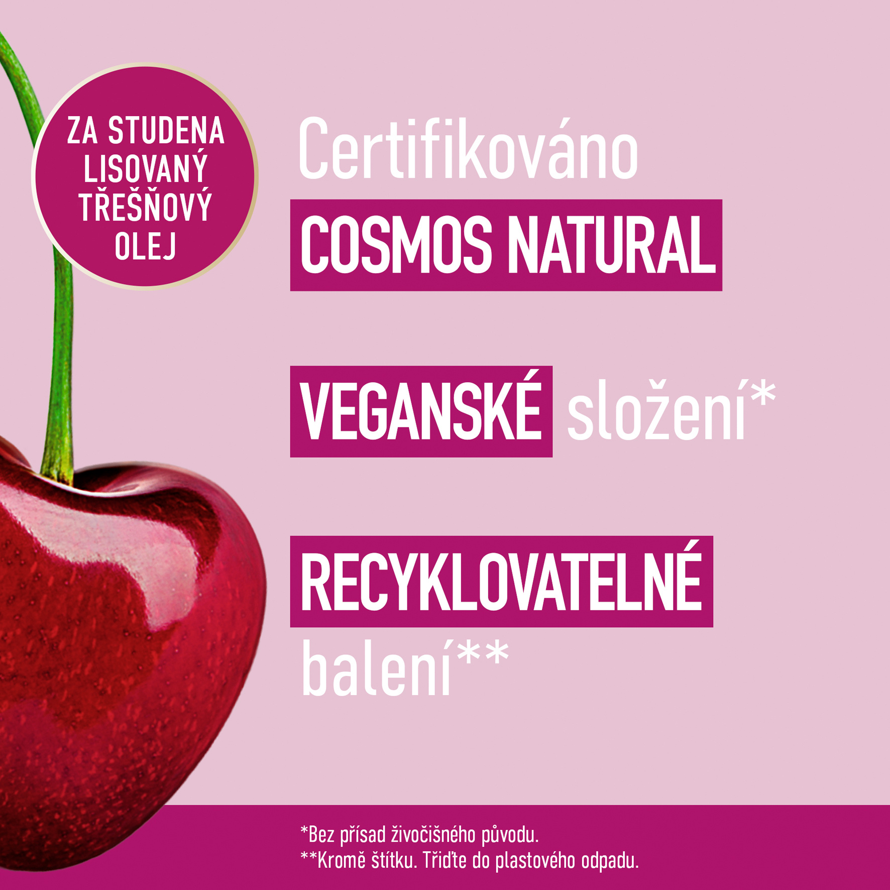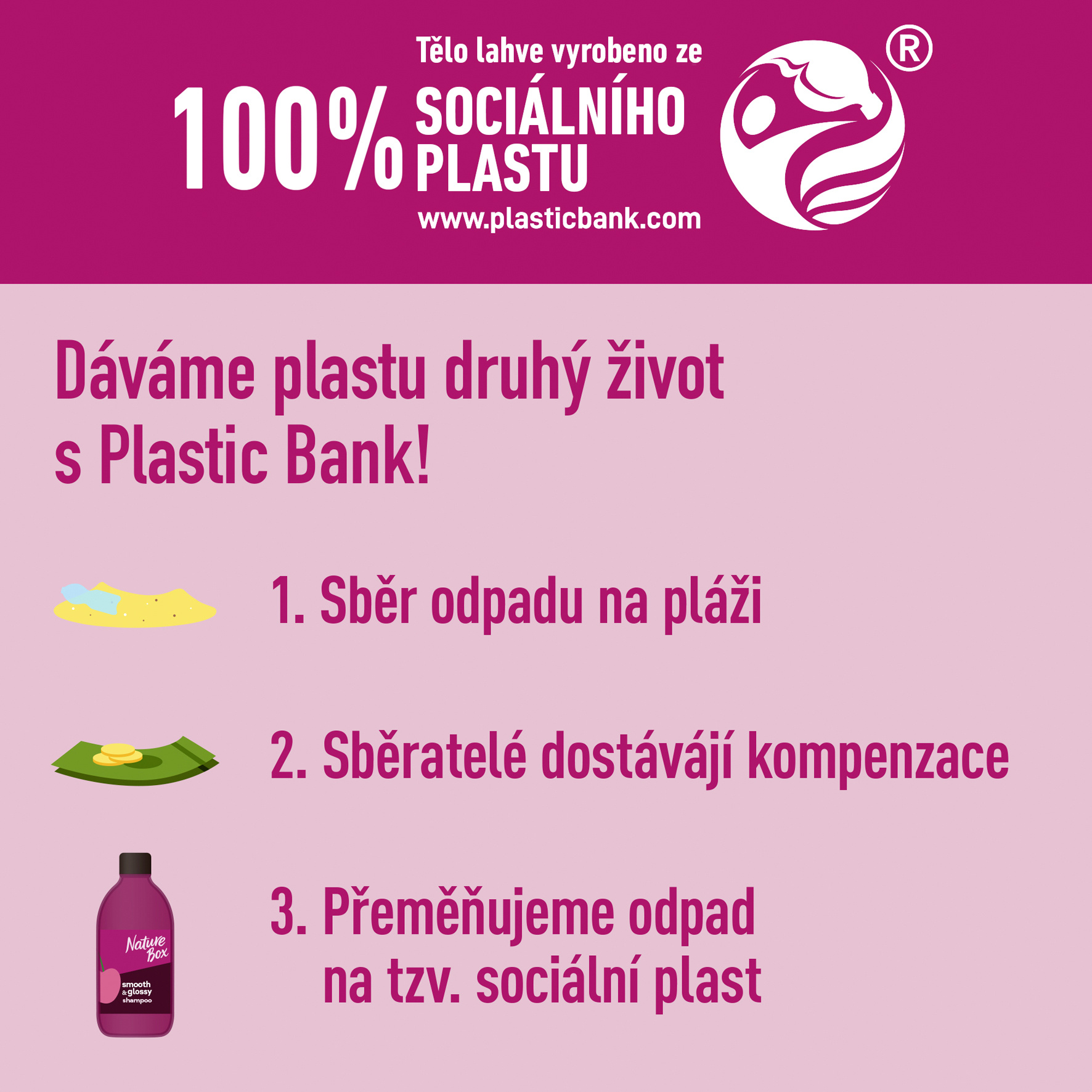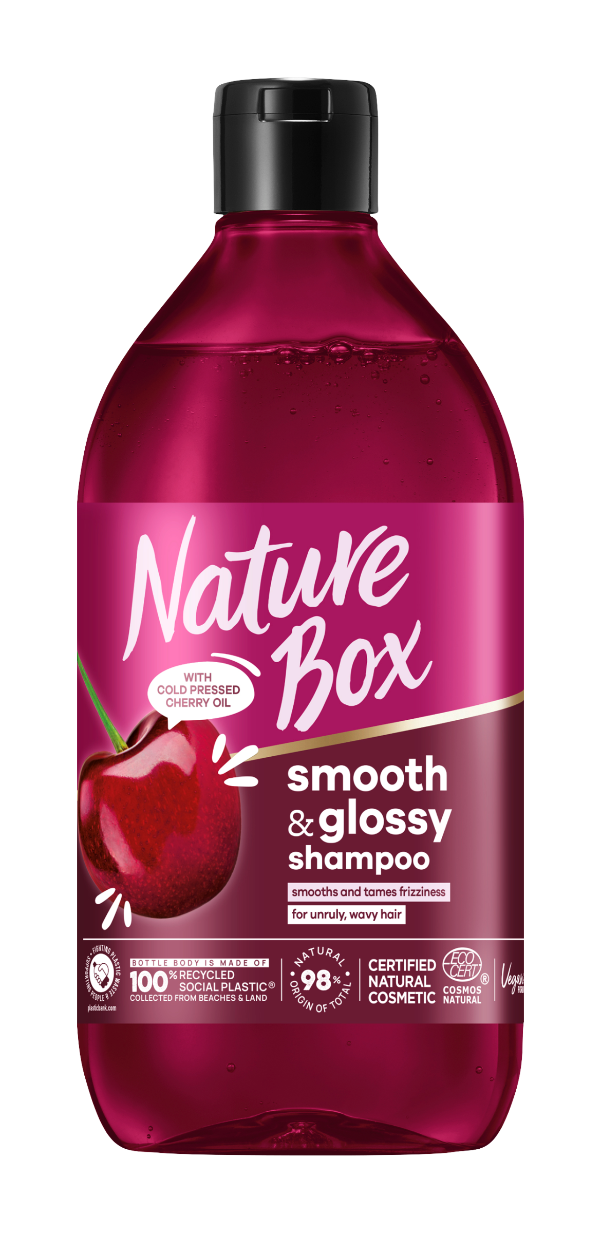Nature Box šampon pro hladké vlasy se za studena lisovaným olejem z třešní. Certifikováno u Ecocert Greenlife jako Cosmos Natural podle Cosmos standardů. 98 % ingrediencí přírodního původu (vč. vody). Spolu s Plastic Bank bojujeme s plastovým odpadem z pláží i souše.