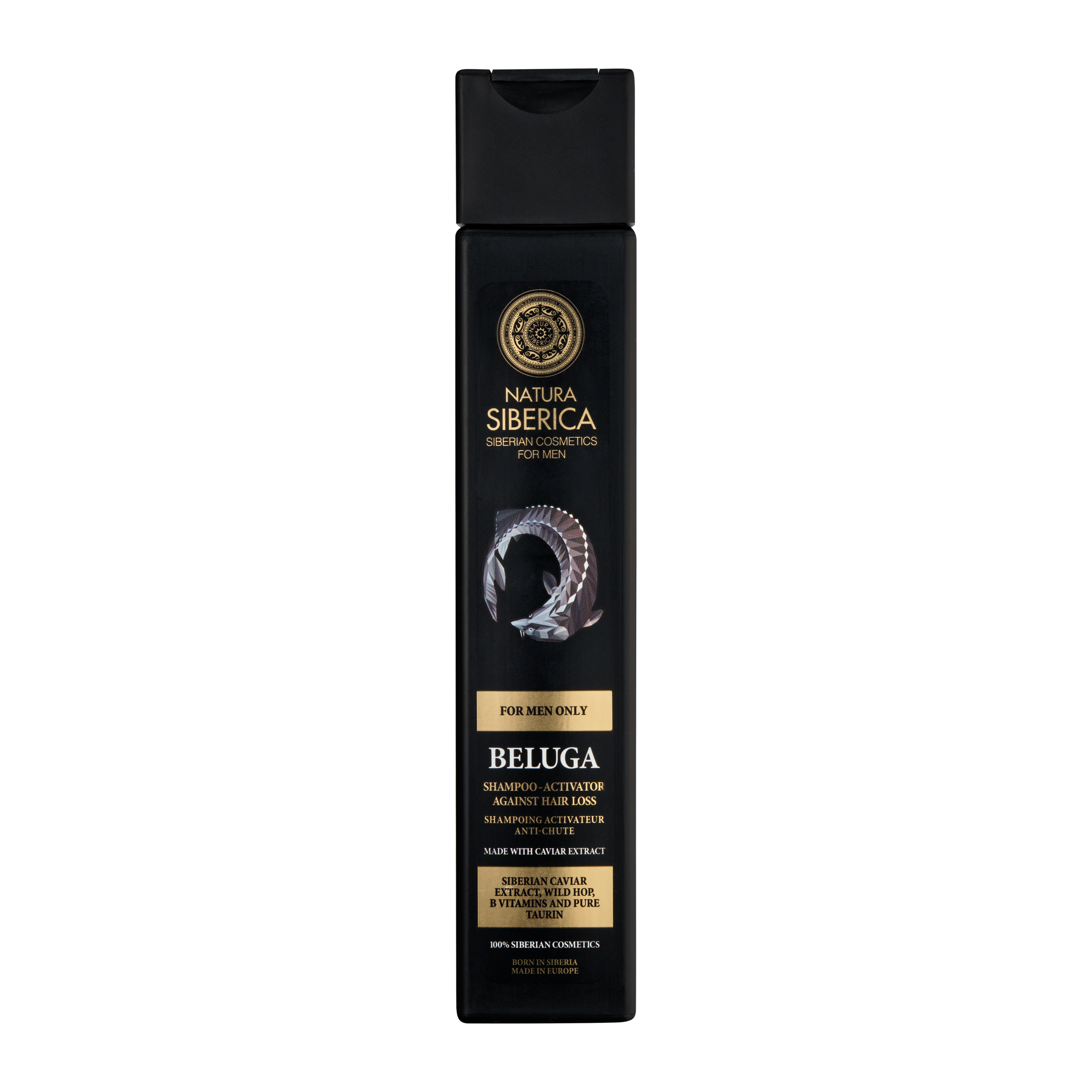 Šampon pro růst vlasů "Beluga" mocný komplex přírodních složek, vyvinutý s ohledem na zvláštnosti mužských vlasů. Intenzivně čistí pokožku hlavy a vlasů, snižuje vypadávání vlasů, stimuluje růst vlasů, obnovuje jejich sílu a zdravý vzhled. Sibiřský kaviár je bohatým zdrojem omega-3 mastných kyselin, proteinů, vitamínů a stopových prvků. Stimuluje růst vlasů, posiluje vlasové kořínky, vyživuje a hydratuje vlasy. Divoký chmel účinně čistí pokožku hlavy, zvyšuje prokrvení, zlepšuje strukturu vlasů. Vitamin B vyživuje a posiluje vlasové kořínky, což je dělá odolné a silné. Čistý taurin, mocná energie, probudí vlasové folikuly, dává vitalitu vlasům a stimuluje růst nových.