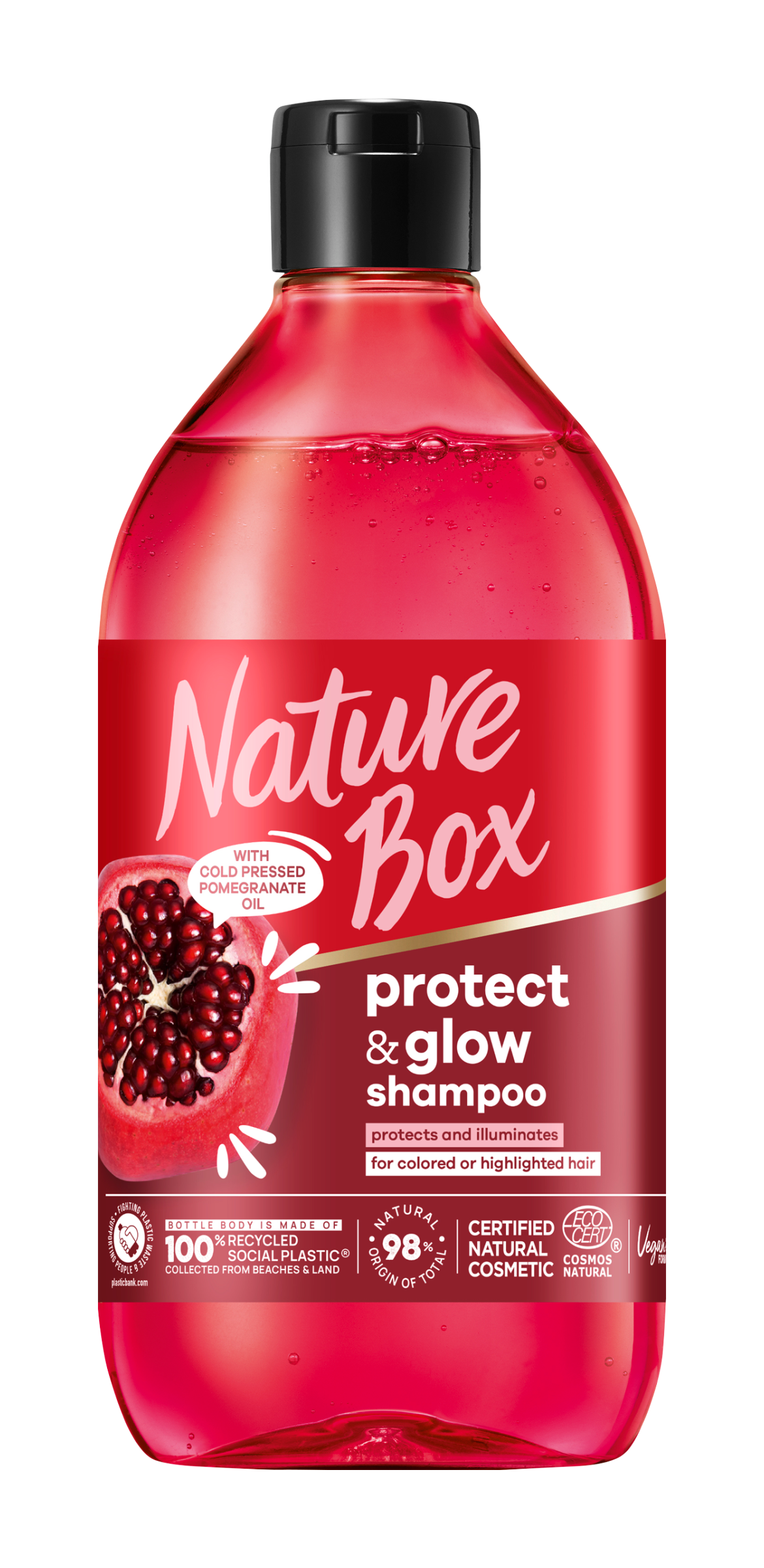 Nature Box Protect & Glow šampon z granátového jablka - S olejem z granátového jablka lisovaným za studena Udržujte barvené vlasy živé s tímto šamponem! Šampon Nature Box protect & glow je vhodný pro barvené a melírované vlasy. Tento barevný šampon s výživným za studena lisovaným olejem z granátového jablka vlasy chrání a rozjasňuje. Chrání barvu vlasů po dobu až 12 týdnů. Tento šampon z granátového jablka obsahuje 98 % složek přírodního původu*** a je certifikován Ecocert Greenlife podle standardu COSMOS. Neobsahuje žádné silikony a umělá barviva. S vůněmi 100% přírodního původu. Složení je veganské*. Láhev šamponu a uzávěr jsou recyklovatelné**. Buďte chytřejší. Šetřit vodou. Recyklovat.