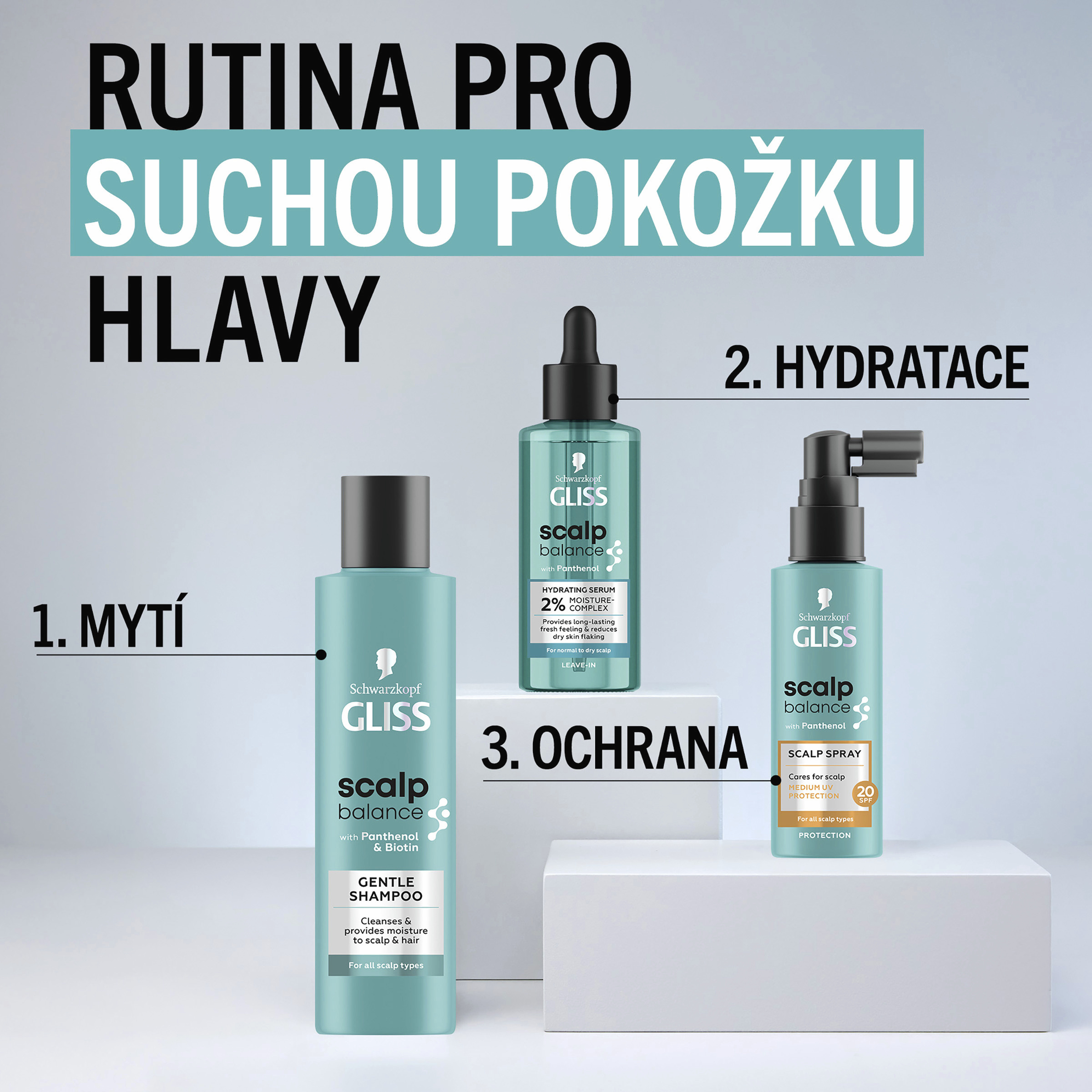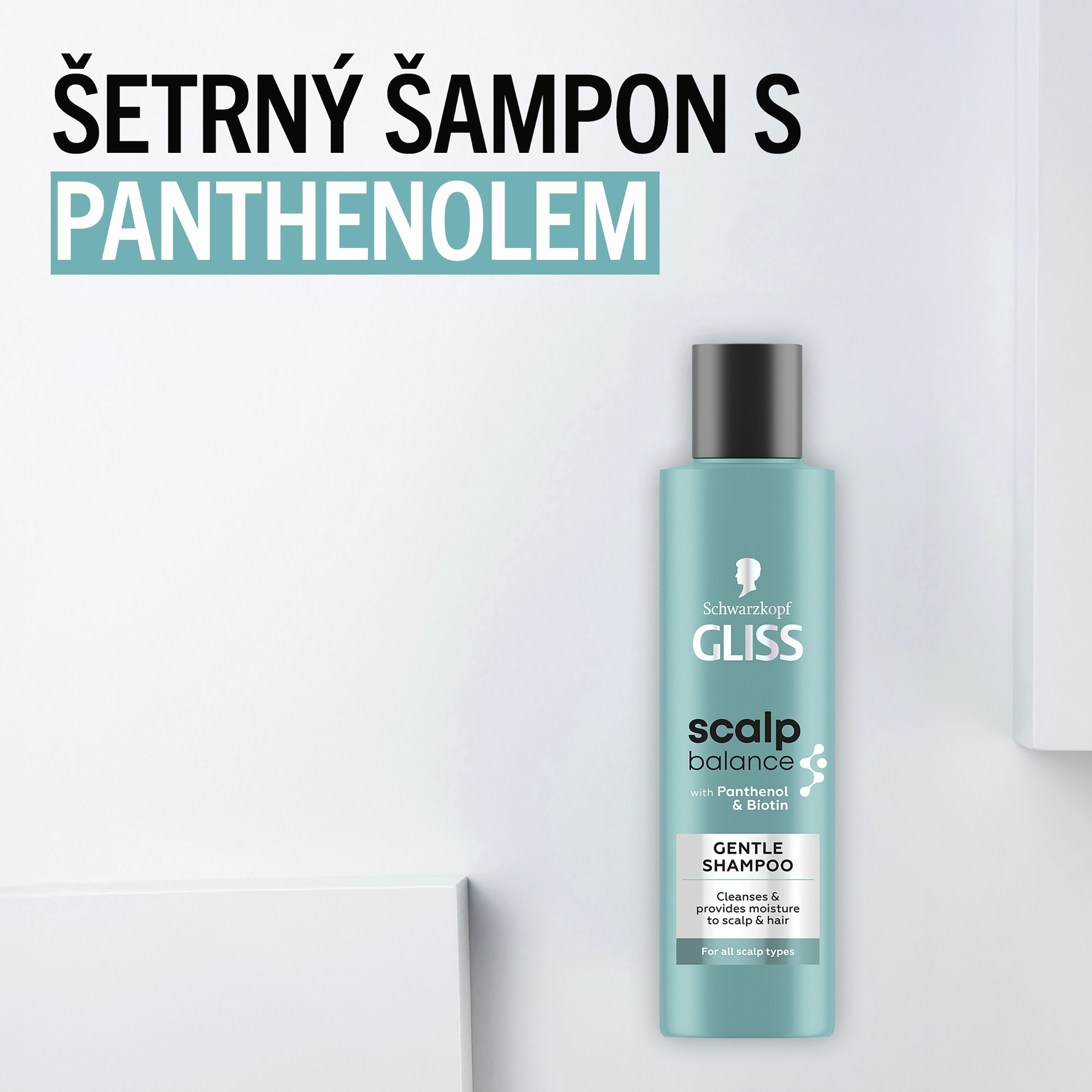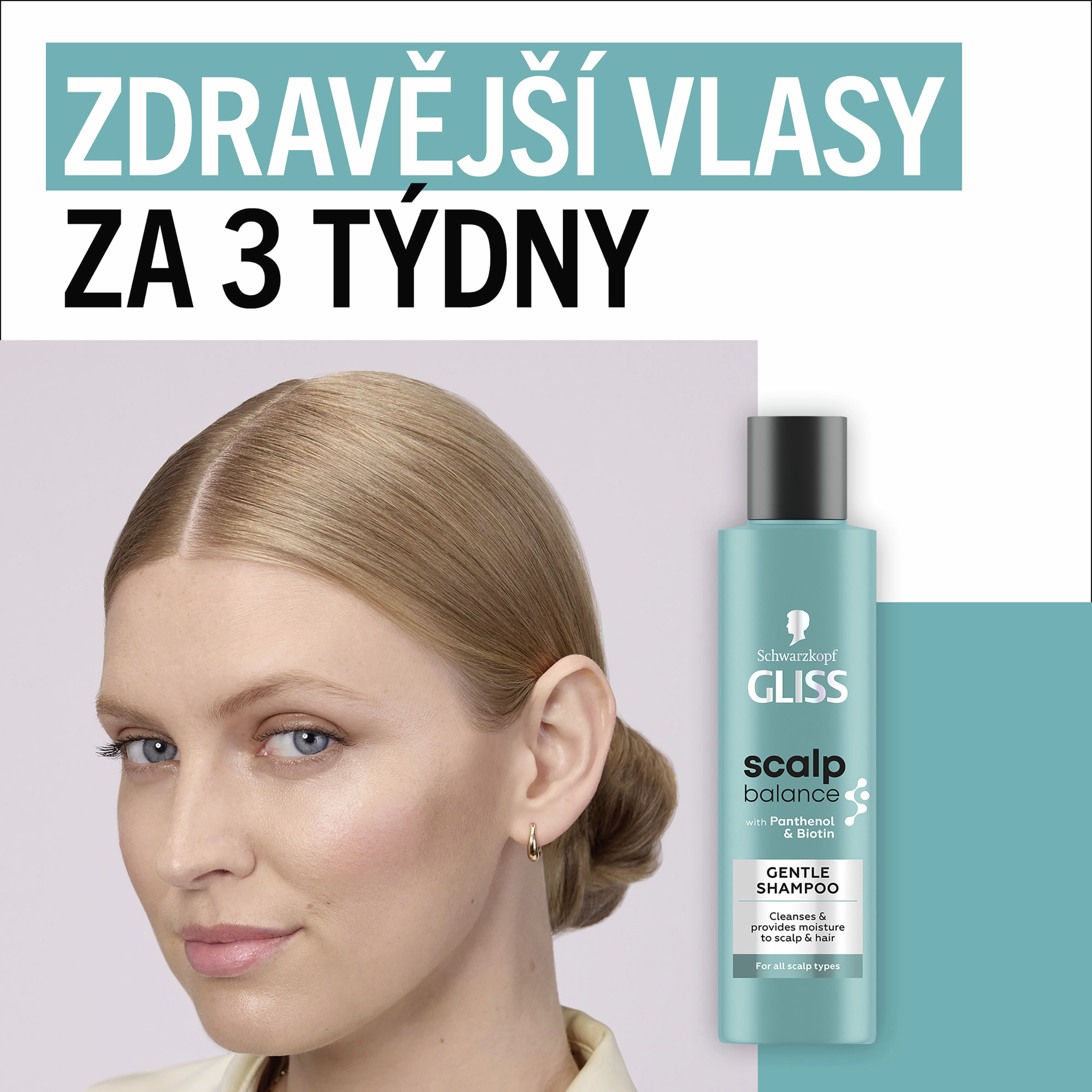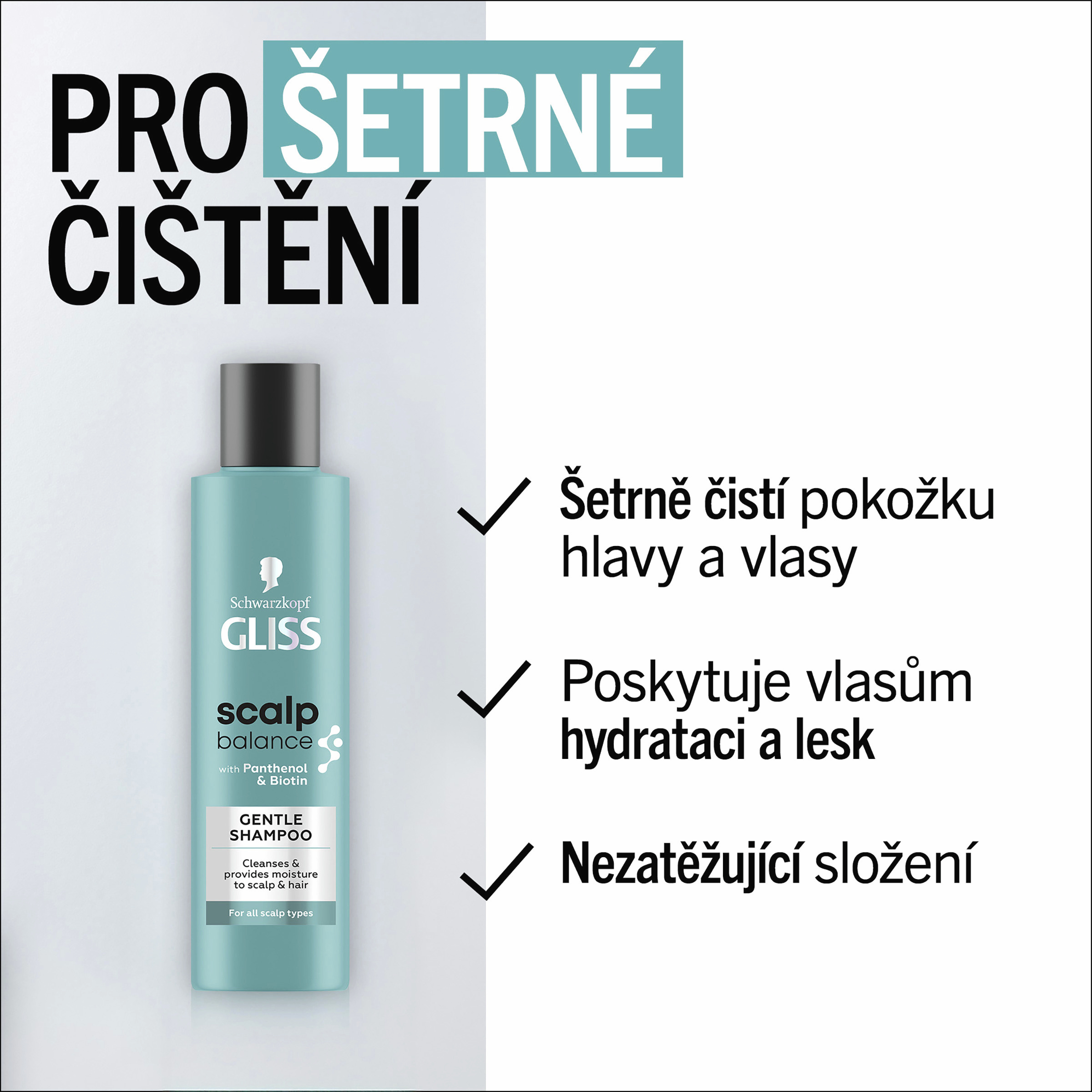 Jemný šampon pro všechny typy pokožky hlavy. Jemný šampon s panthenolem a biotinem šetrně čistí vlasy a pokožku hlavy a poskytuje vlasům hydrataci a lesk. Lehké složení nezatěžuje vlasy. Složení je dermatologicky testované, bez silikonů a veganské*. Použití: Naneste do mokrých vlasů a na pokožku hlavy, jemně vmasírujte. Poté důkladně opláchněte. Lze používat pravidelně. Pro optimální péči o pokožku hlavy použijte Gliss Scalp Balance sérum (hydratační nebo čisticí dle typu pokožky) a/nebo Gliss Scalp Balance sprej na pokožku hlavy s SPF.