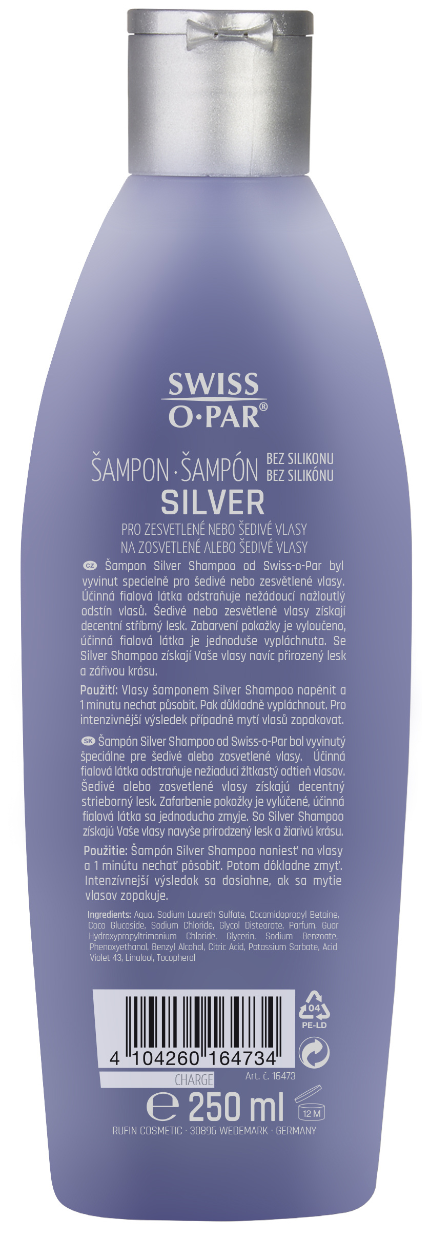 Šampon Silver Shampoo od Swiss-o-Par byl vyvinut speciálně pro šedivé nebo zesvětlené vlasy. Účinná fialová látka odstraňuje nežádoucí nažloutlý odstín vlasů. Šedivé nebo zesvětlené vlasy získají decentní stříbrný lesk. Zabarvení pokožky je vyloučeno, účinná fialová látka je jednoduše vypláchnuta. Se Silver Shampoo získají Vaše vlasy navíc přirozený lesk a zářivou krásu.