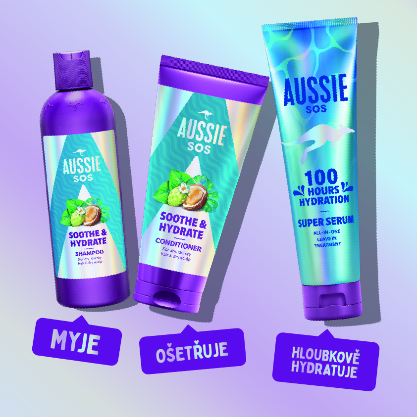 Vmasírujte do vlhkých vlasů, zazpívejte si u toho a poté důkladně opláchněte. Proč nepřidat ještě kondicionér Aussie SOS Soothe & Hydrate pro extra hydrataci?
