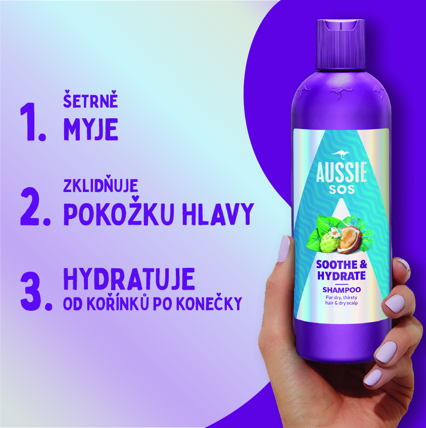 Volají vaše suché vlasy a pokožka hlavy o pomoc? Žádnou paniku, náš šampon Aussie SOS Soothe & Hydrate vám hází záchranné lano. Tento šetrný šampon s australskými superpotravinami hydratuje a zklidňuje pokožku hlavy, vyživuje vlasy a zanechává je hebké a lesklé od kořínků ke konečkům. Tadá! Pro dosažení nejlepších výsledků používejte šampon společně s ostatními výrobky řady Aussie SOS Soothe & Hydrate, například s kondicionérem a maskou.