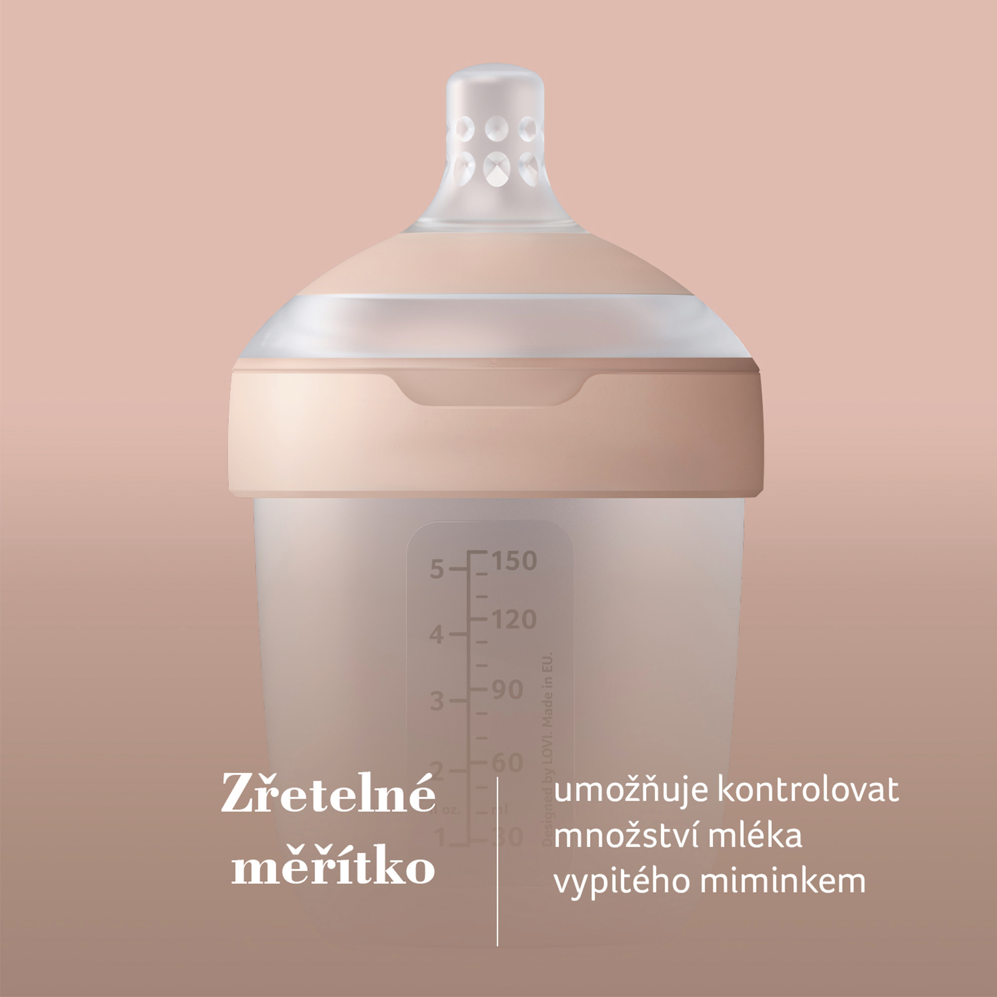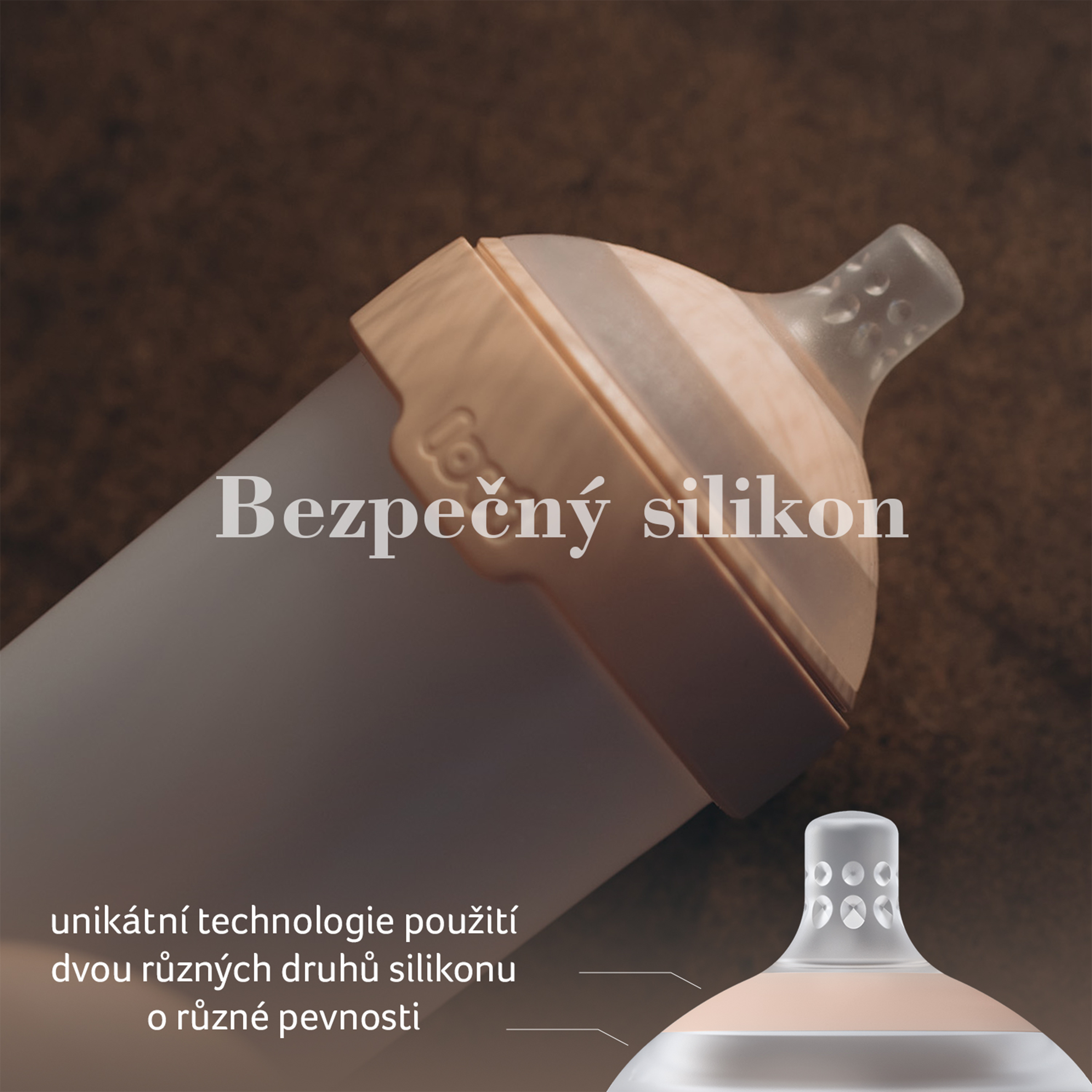 - Tvar a proporce - široký, profilovaný tvar po vzoru maminčiných prsou a dokonalé proporce zajišťují, že ústa dítěte jsou umístěna ve správném úhlu, rty jsou pevně sevřené a dítě může volně dýchat nosem, což snižuje riziko vzniku koliky.