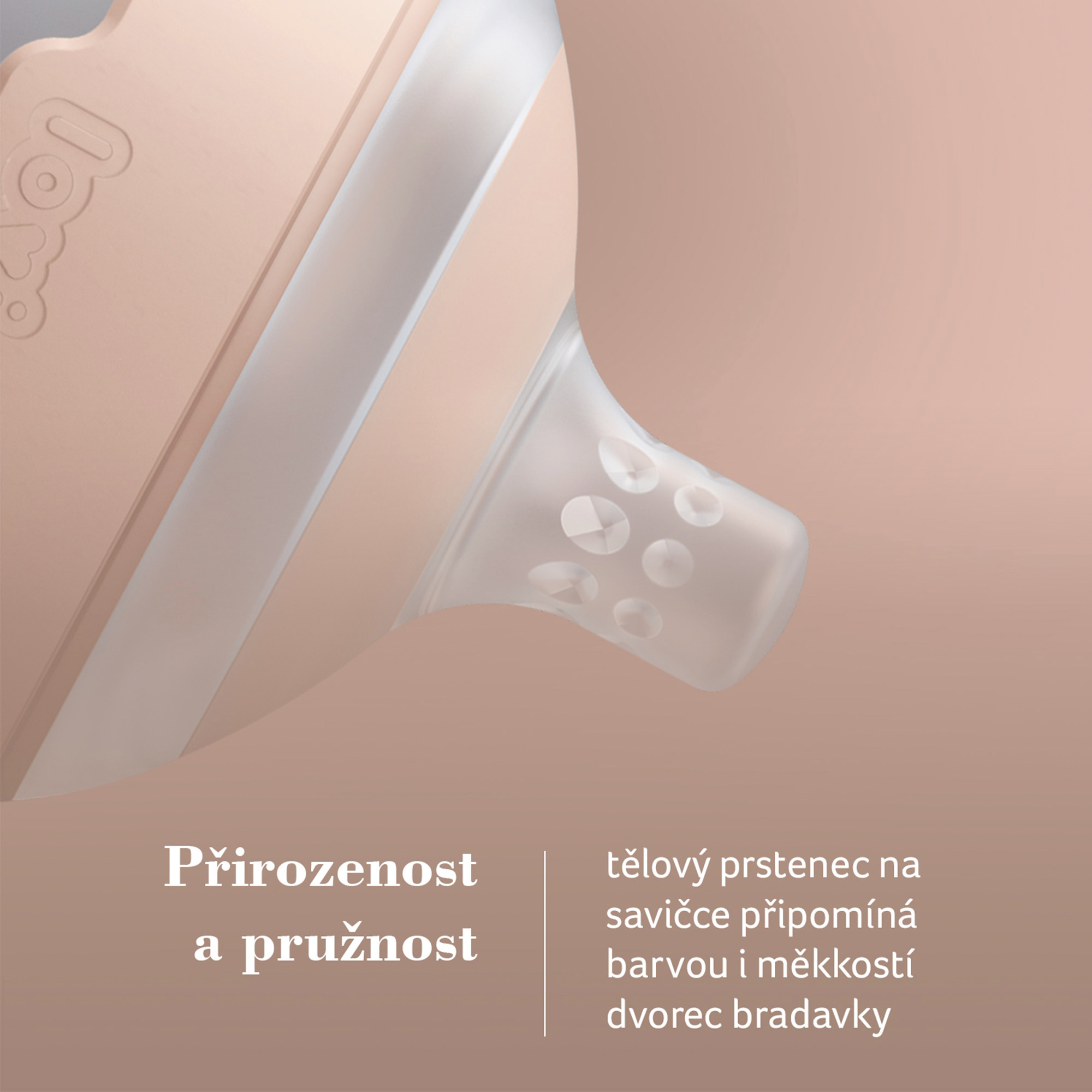 - Jemnost a sametový pocit - matný, jemný povrch savičky napodobuje maminčinu pokožku, její texturu a jemnost.