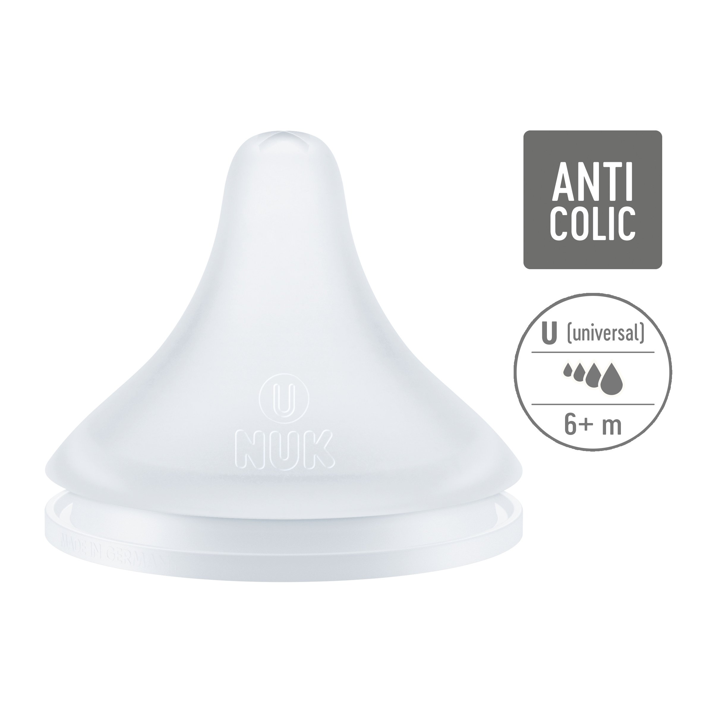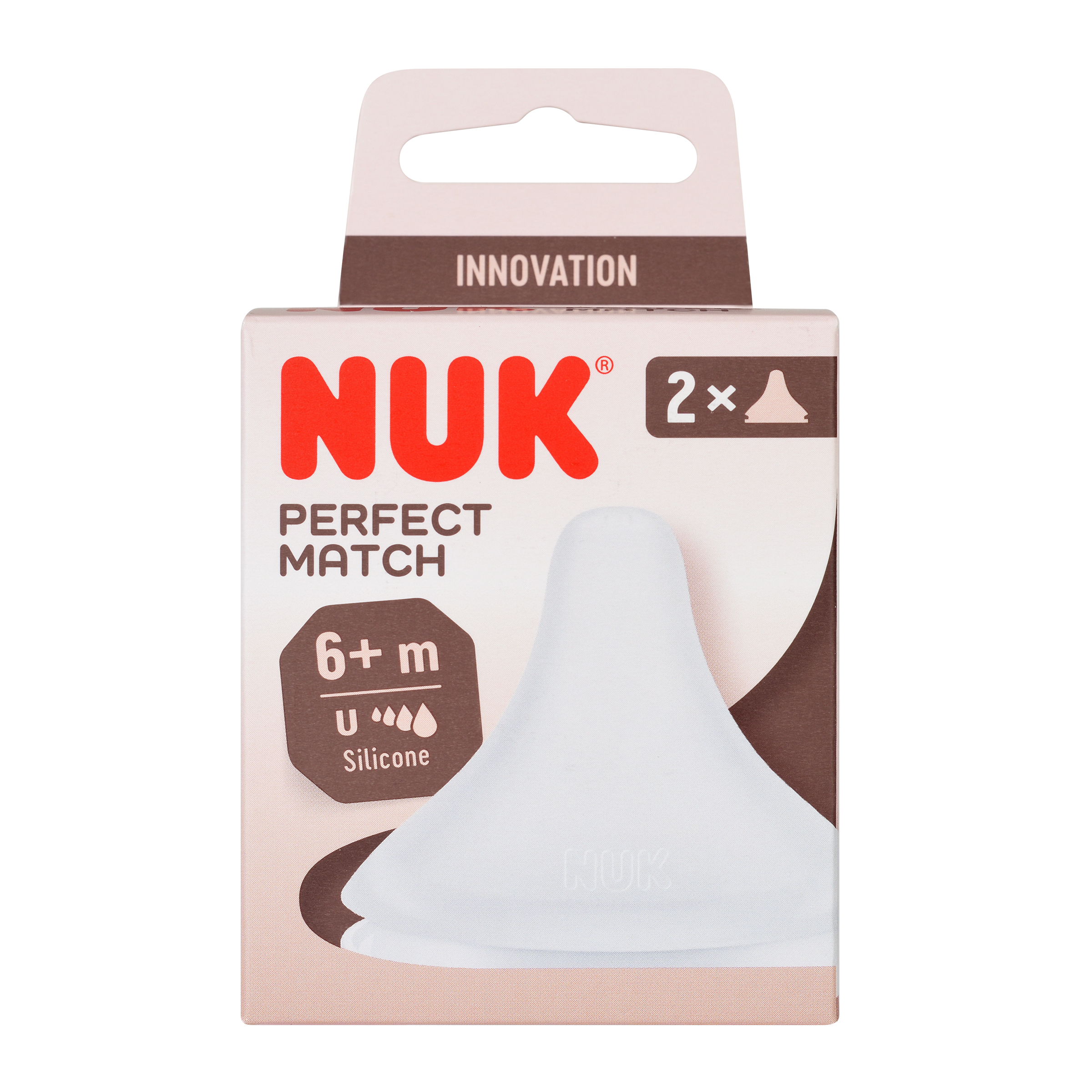 Savička NUK Perfect Match, vyrobená z měkkého silikonu, neobsahuje BPA, velikost U (univerzální), od 6 měsíců, 2 kusy.