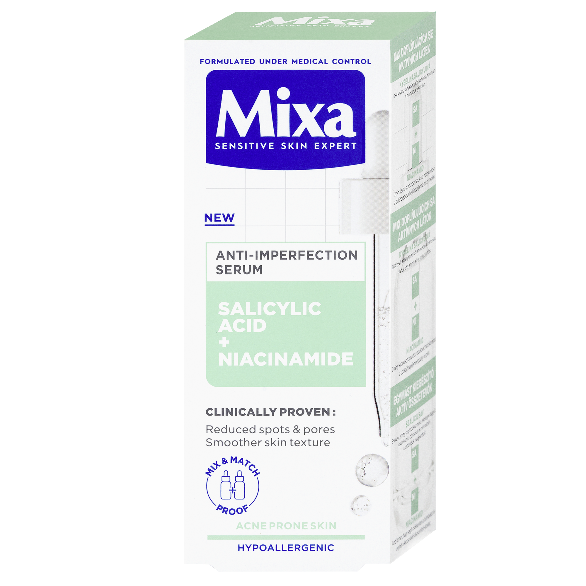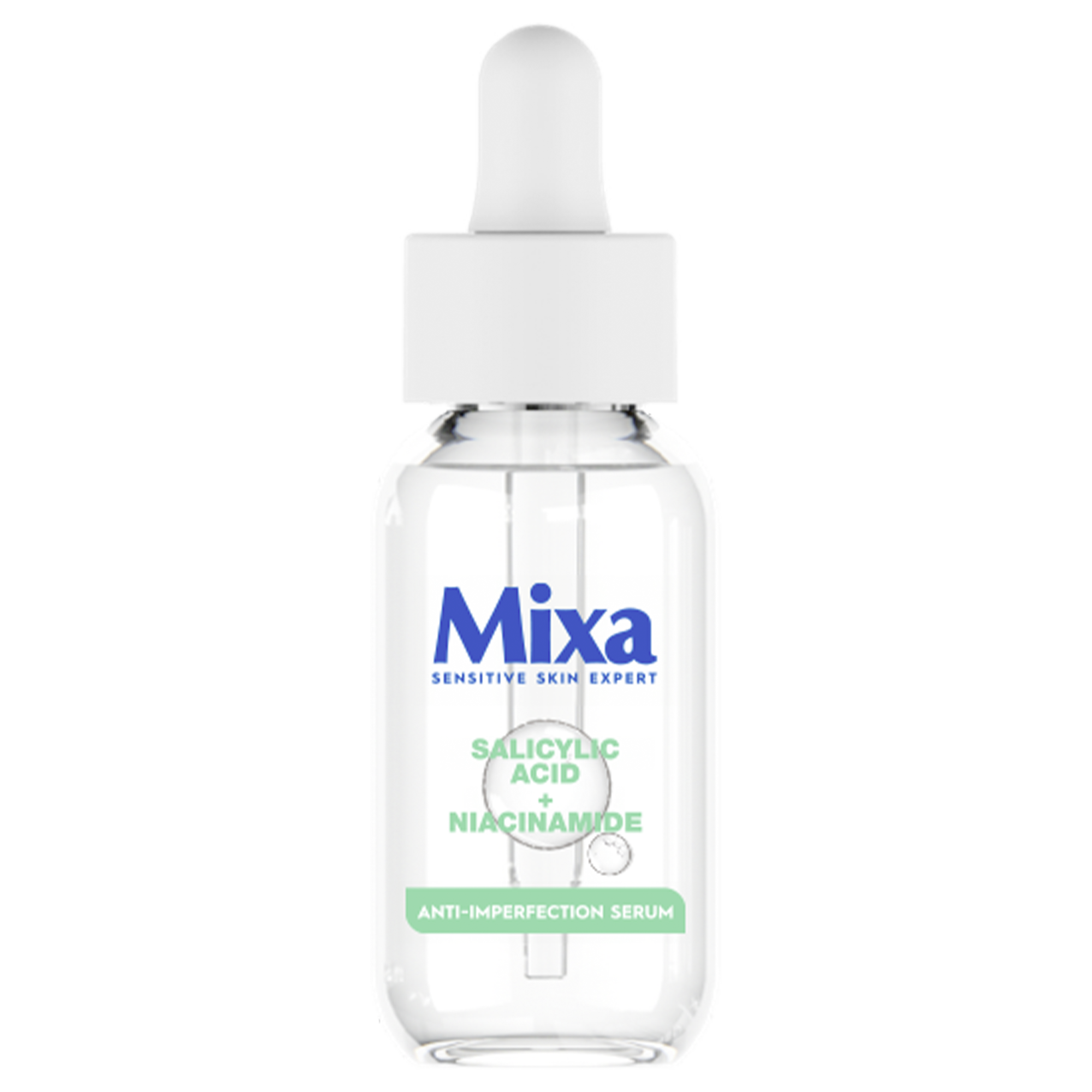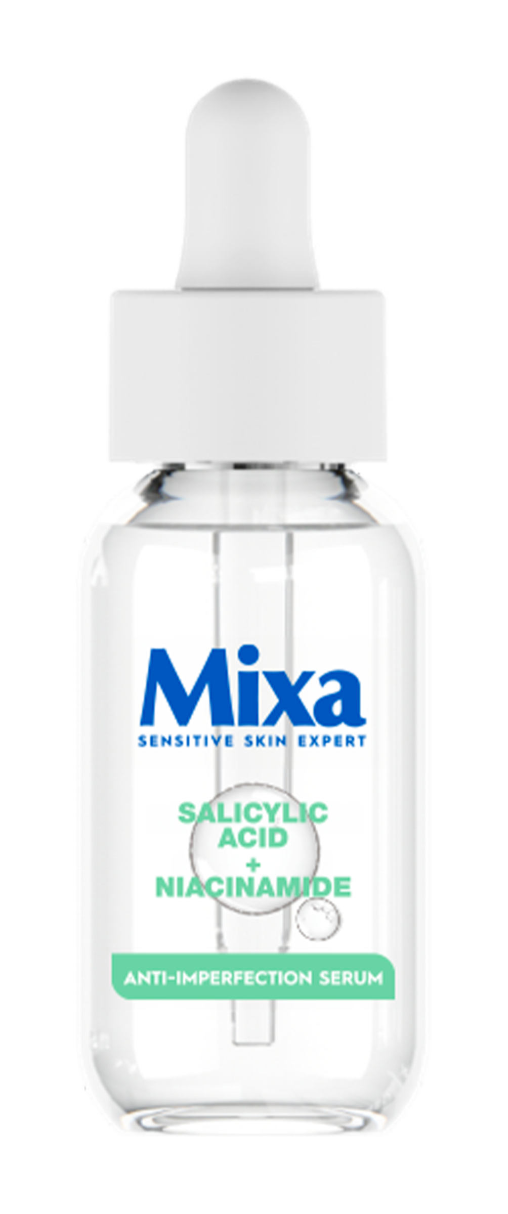Vhodné pro kombinaci s jinými séry značky Mixa. Sérum s doplňujícími se aktivními látkami:: kyselinu salicylová a niacinamid.
