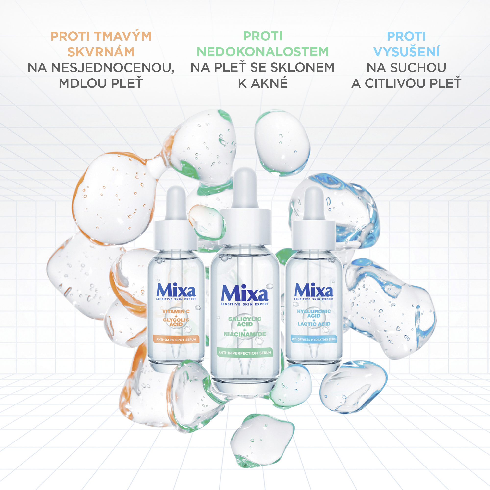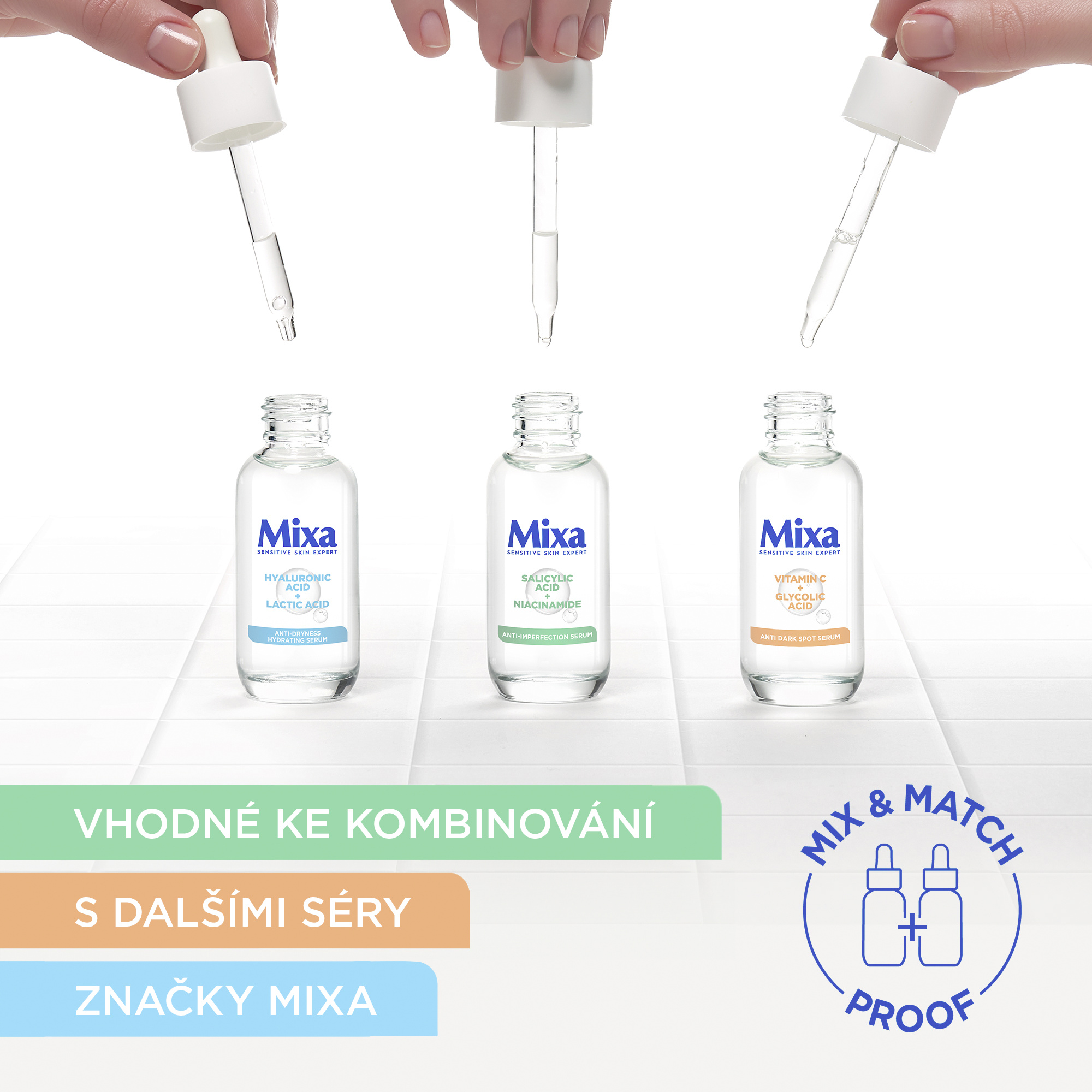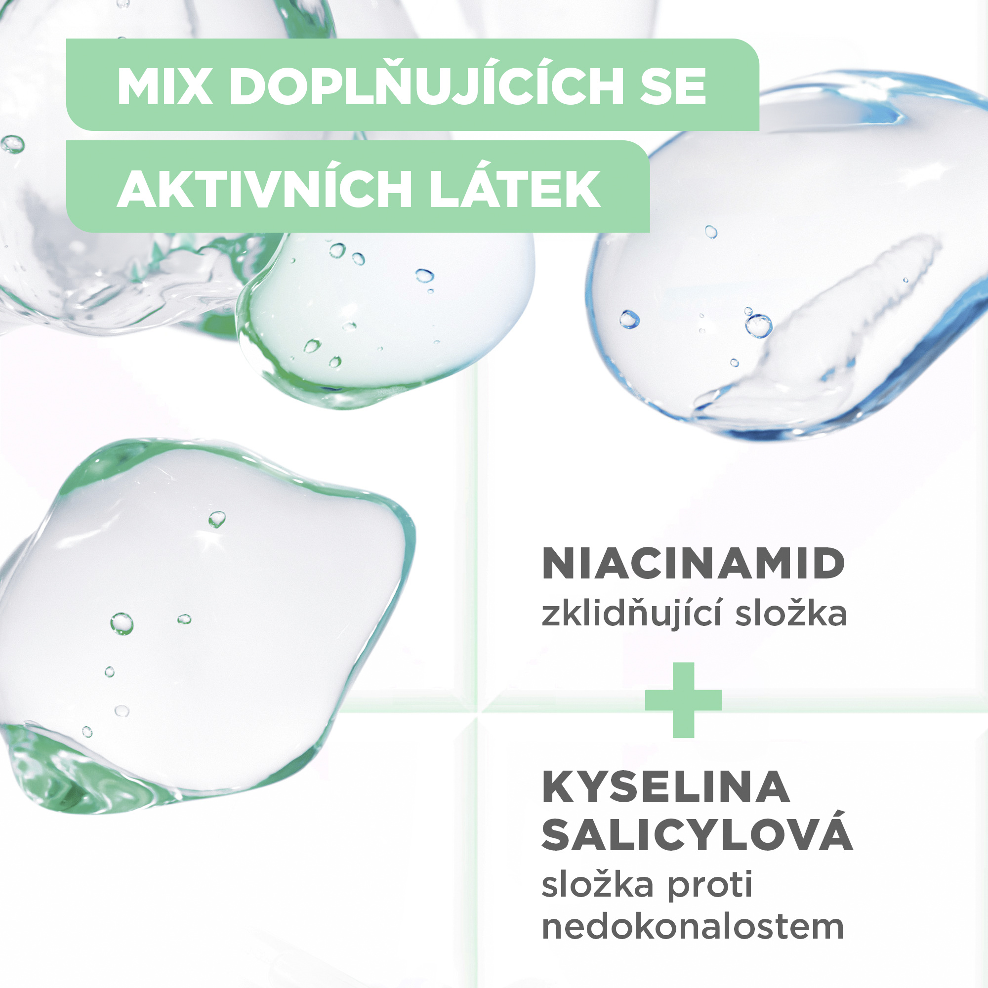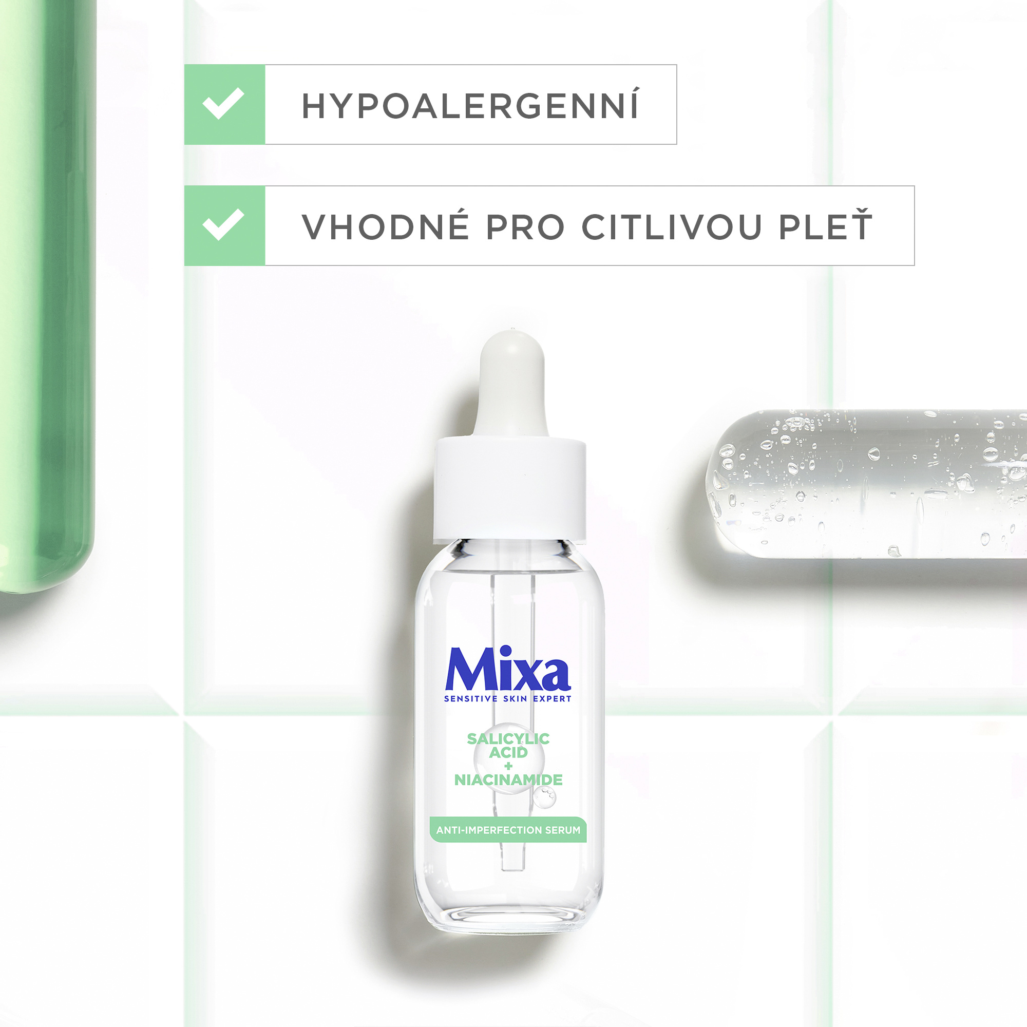 Vhodné pro kombinaci s jinými séry značky Mixa. Sérum s doplňujícími se aktivními látkami:: kyselinu salicylová a niacinamid.