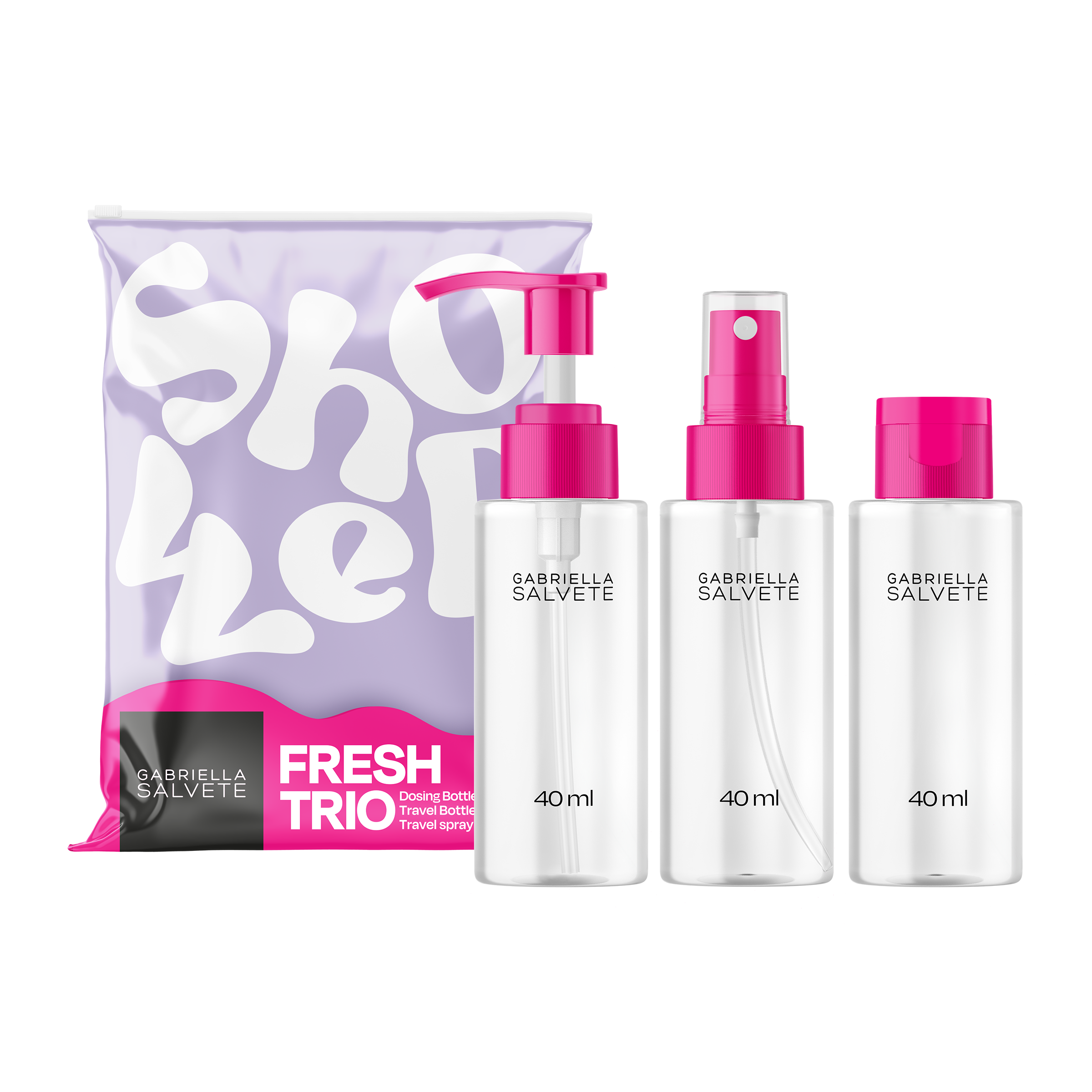 Chcete být fresh i poslední den festivalu? Zařaďte na program sadu cestovních lahviček na kosmetiku Fresh Trio z festivalové kolekce Gabrielly Salvete. Praktické cestovní balení lahviček na kosmetiku se skvěle hodí na opalovací krémy, odličovací přípravky, šampony nebo sprchové gely – prostě na to nejnutnější, co je (nejen na festivalu) potřeba.
