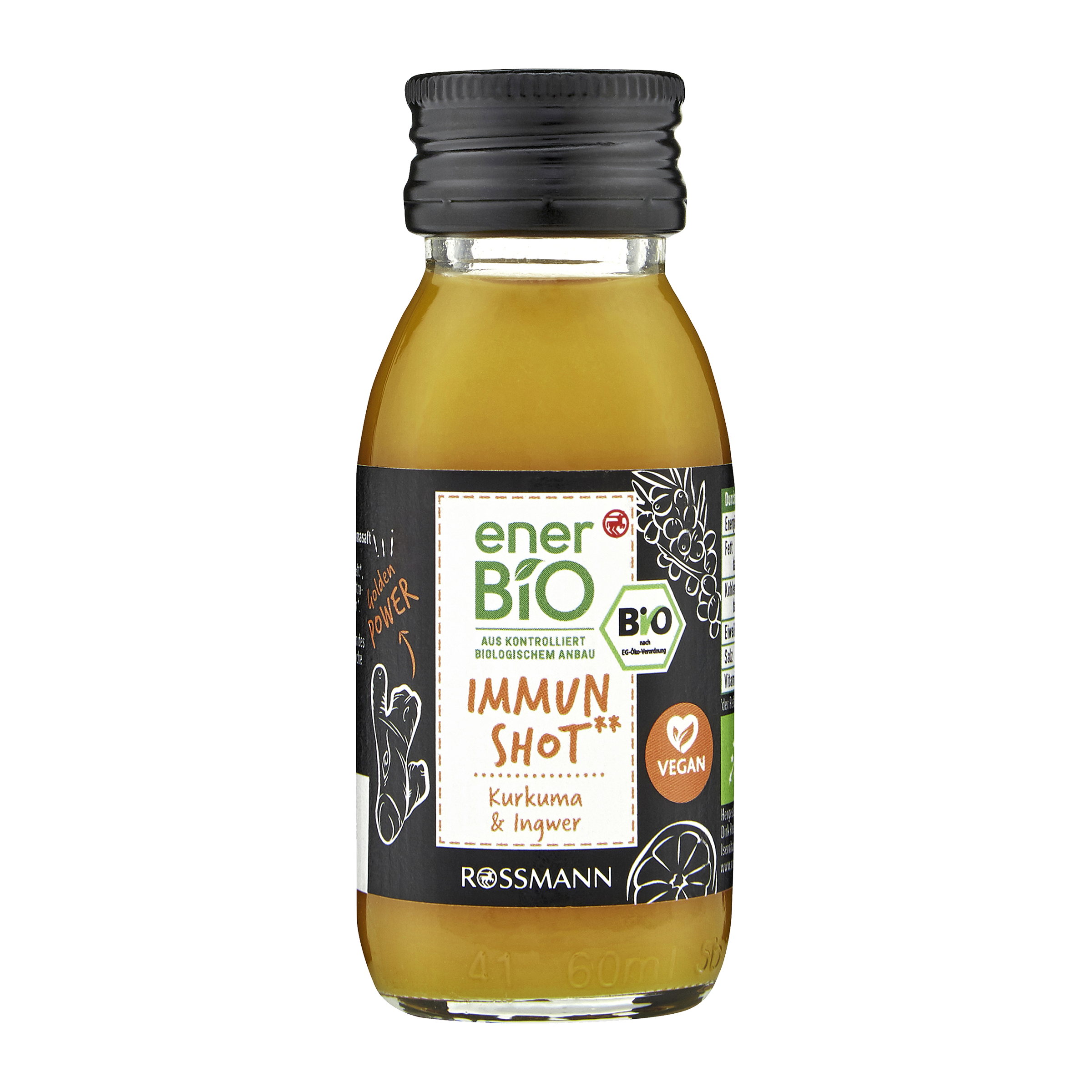 Zlatá síla v nejmenší lahvičce: náš enerBiO Immunshot s kurkumou a zázvorem dodá vašemu imunitnímu systému šťavnatou, pikantní vzpruhu extra třídy. Pomeranče a rakytník se setkávají s kurkumou a zázvorem a lehkým nádechem pepře; nejen váš imunitní systém bude spokojený, a to díky 60 % denní potřeby vitaminu C.
