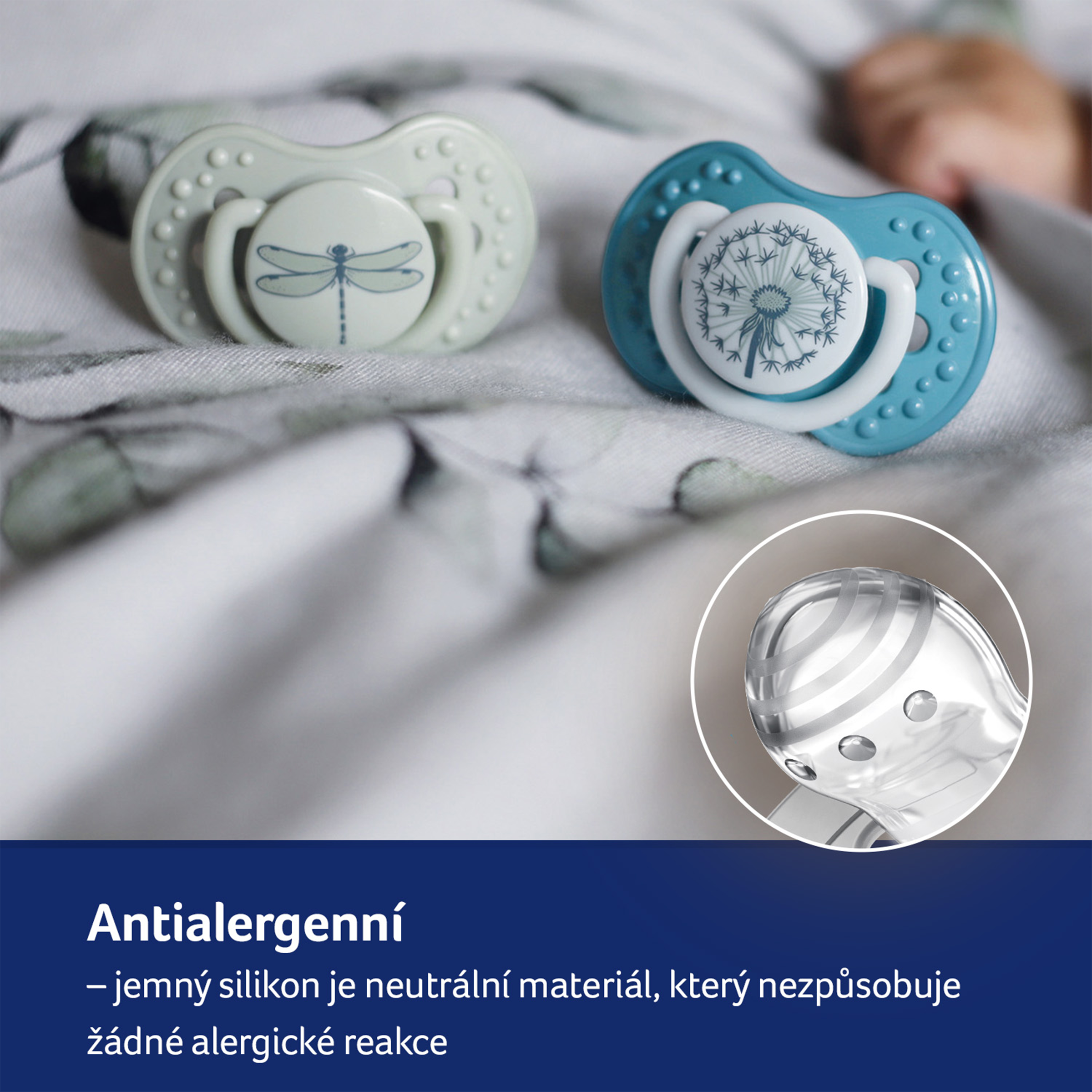 - Je vyrobený z bezpečného materiálu, který neobsahuje BPA. Jedinečný okraj štítku je vyroben ze zdravotnického materiálu, je příjemný na dotek a zabraňuje otlačení dudlíku.