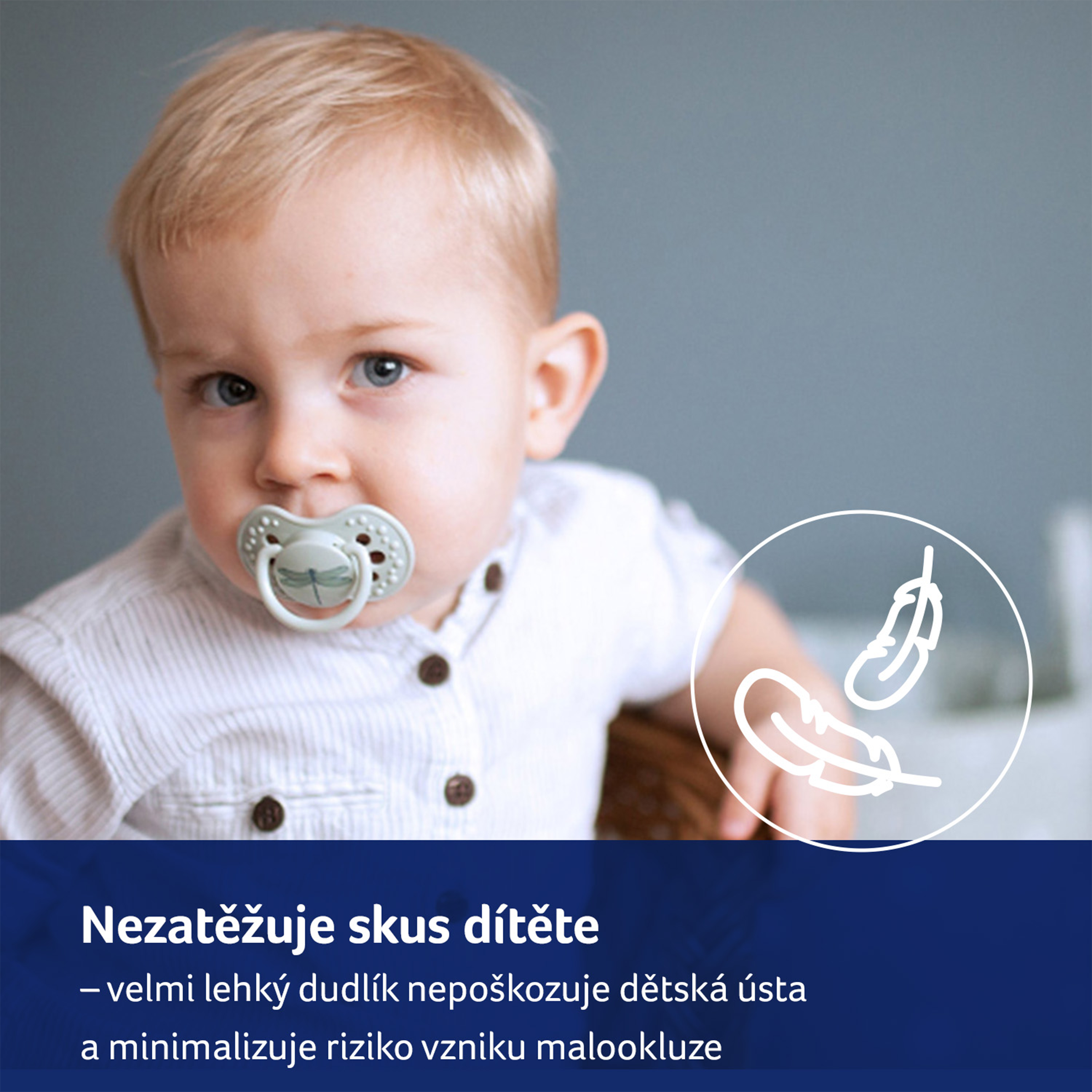 - Zabraňuje reflexu kousání do dudlíku.