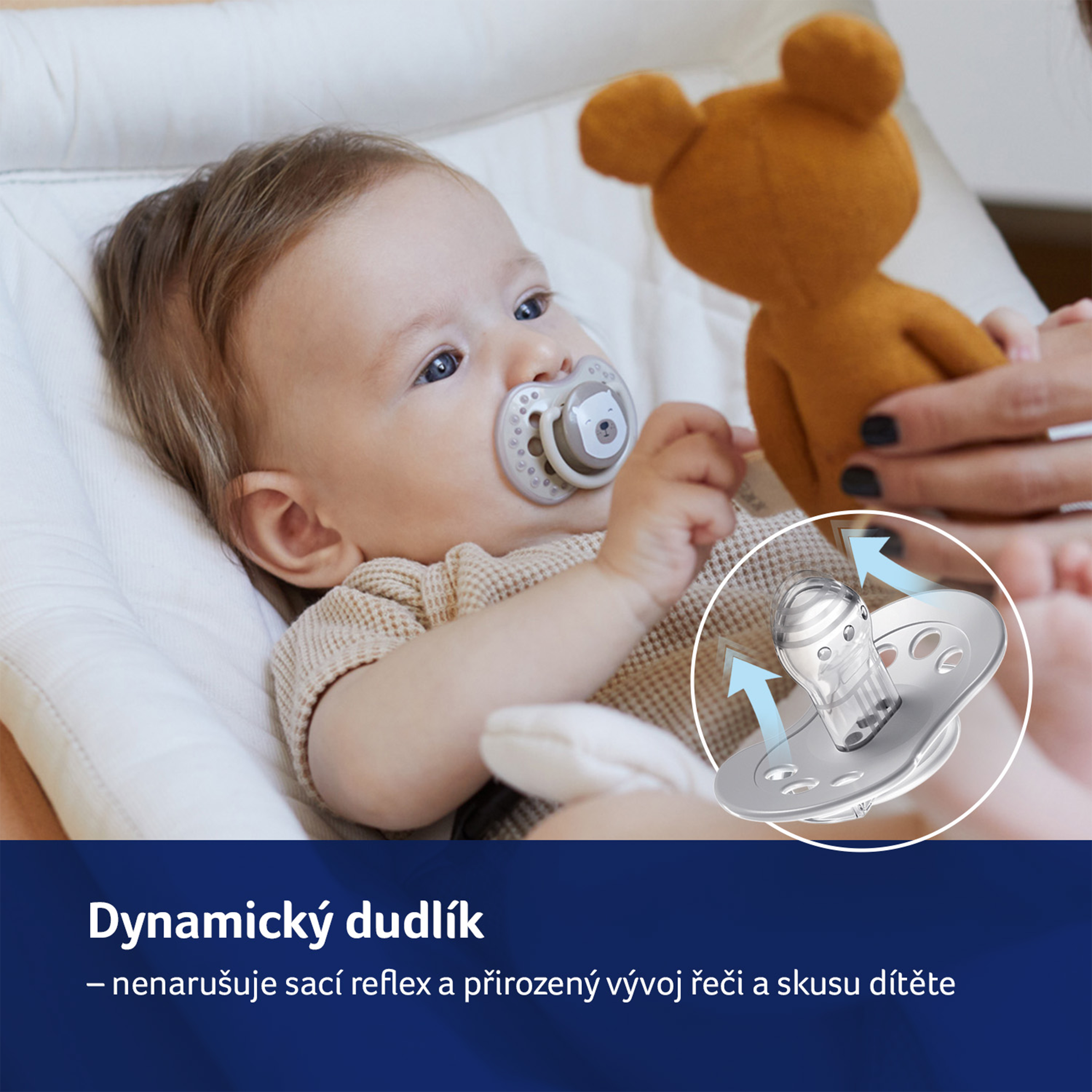 - Dynamická špička je vyrobena z nestejnorodých vrstev silikonu, takže se prodlužuje a smršťuje v závislosti na rytmu sání dítěte.