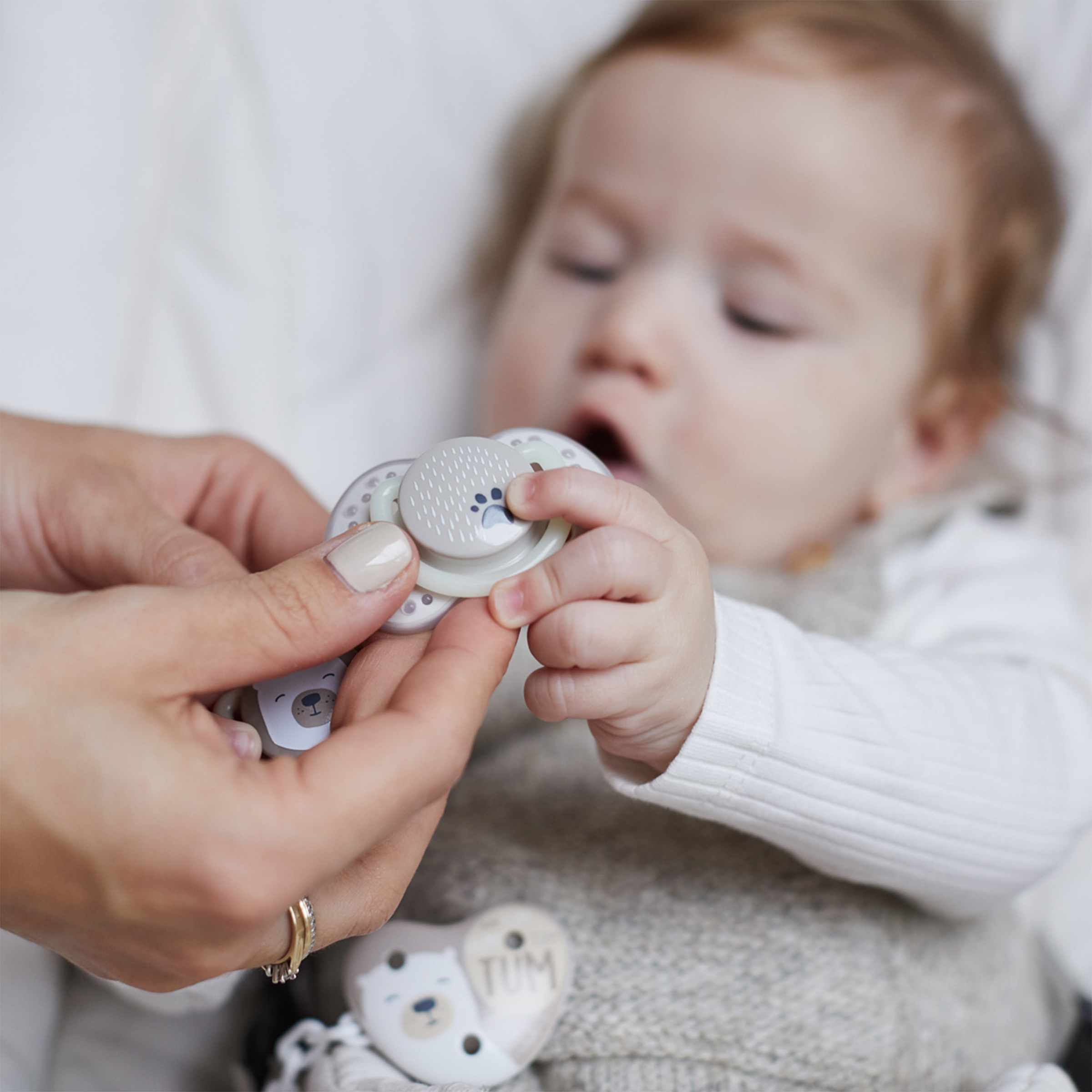 - Úchyt v dudlíku pevně drží, usnadňuje držení a podávání dudlíku. Můžete na něj připnout řetízek nebo šňůrku.